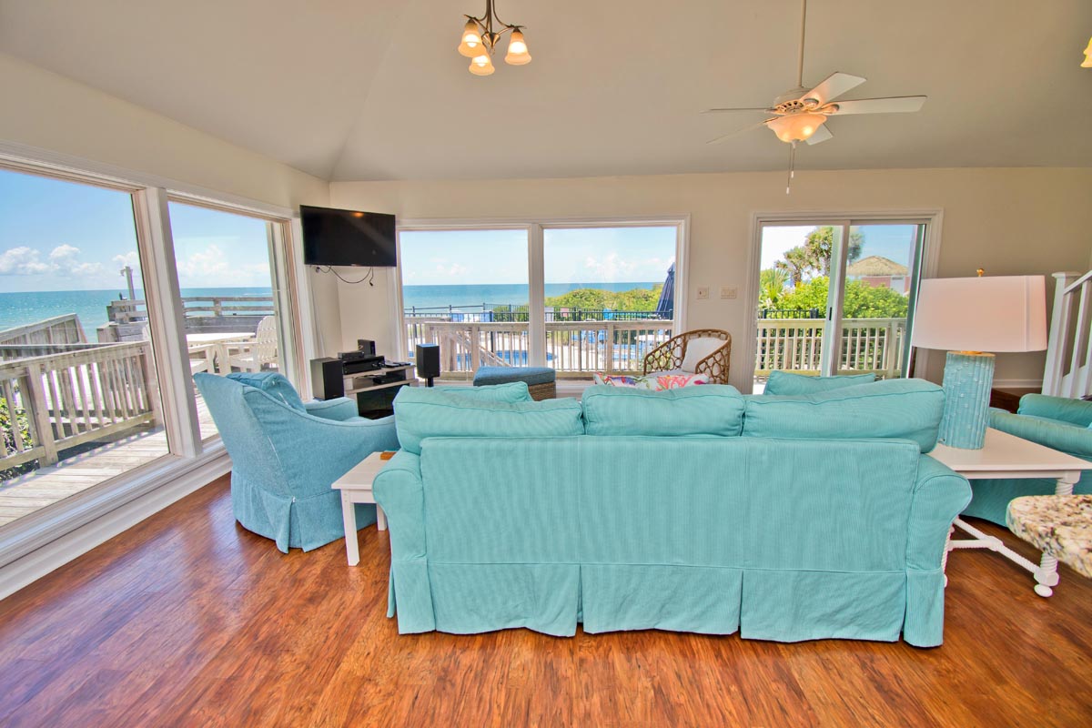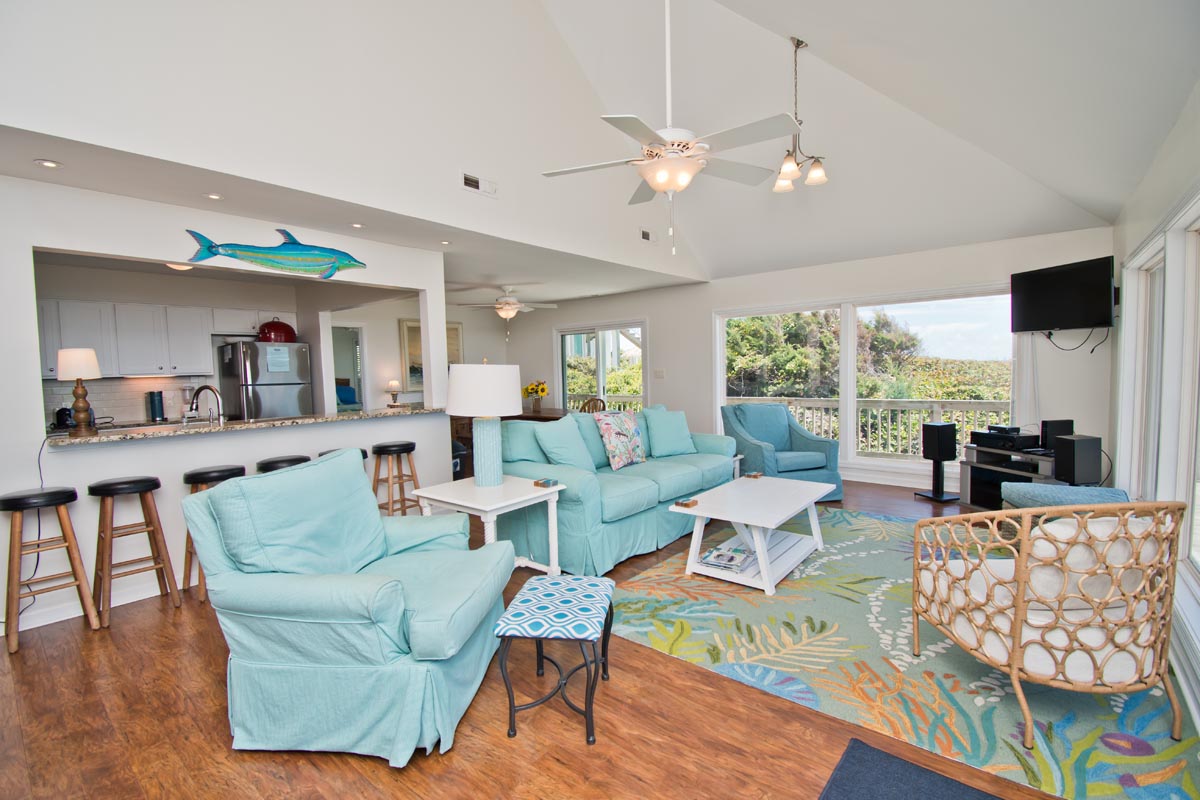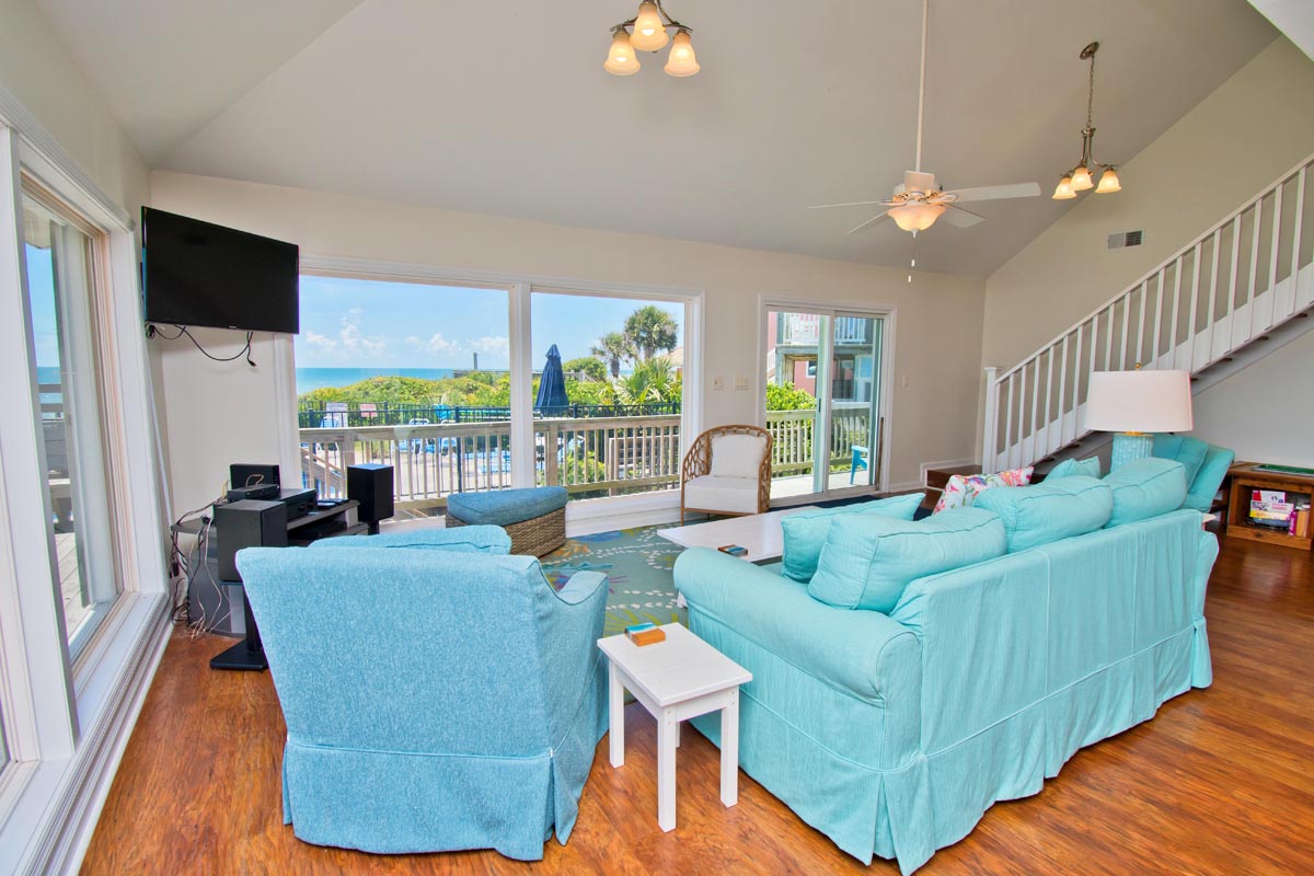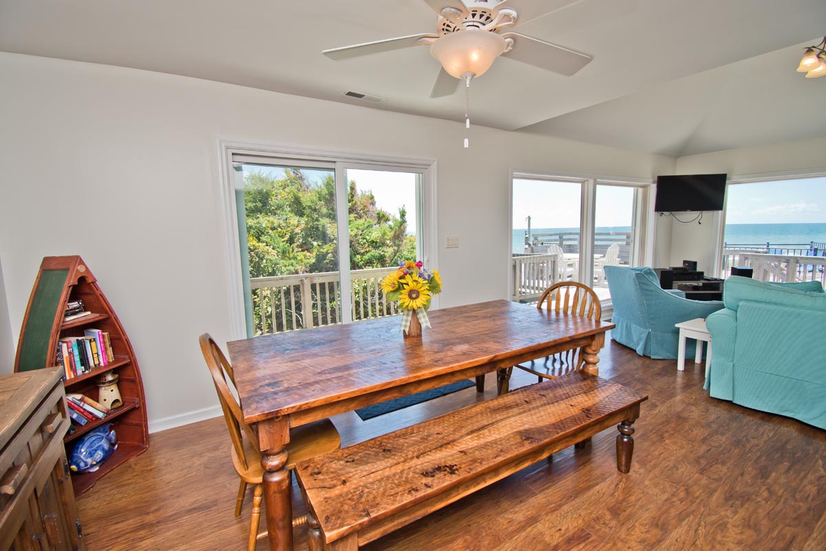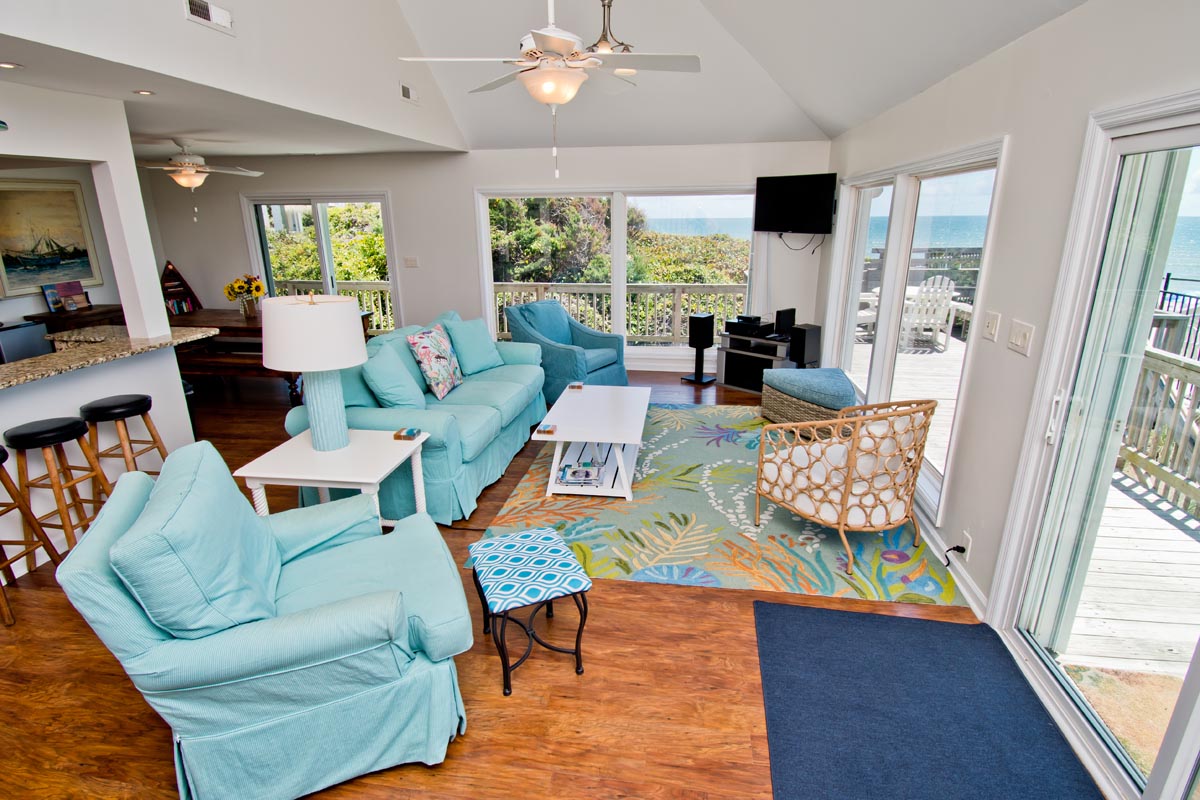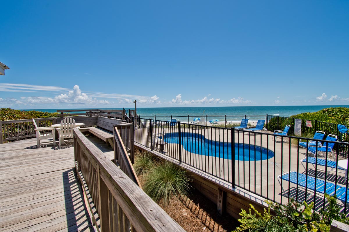 Angled living area surrounds you with 180 degrees of prime Ocean Views! Open Oceanfront Deck has a Table, Chairs, an Umbrella and Chaise Lounges! Carolina Sunshine is equipped with High Speed Wireless Internet so you can stay connected while on vacation. Take a break from the salty sea and dip into your Private Swimming Pool! This outdoor pool is quite expansive, measuring 12x24.
