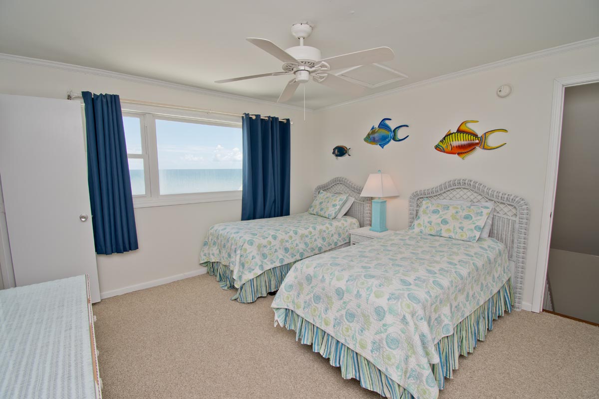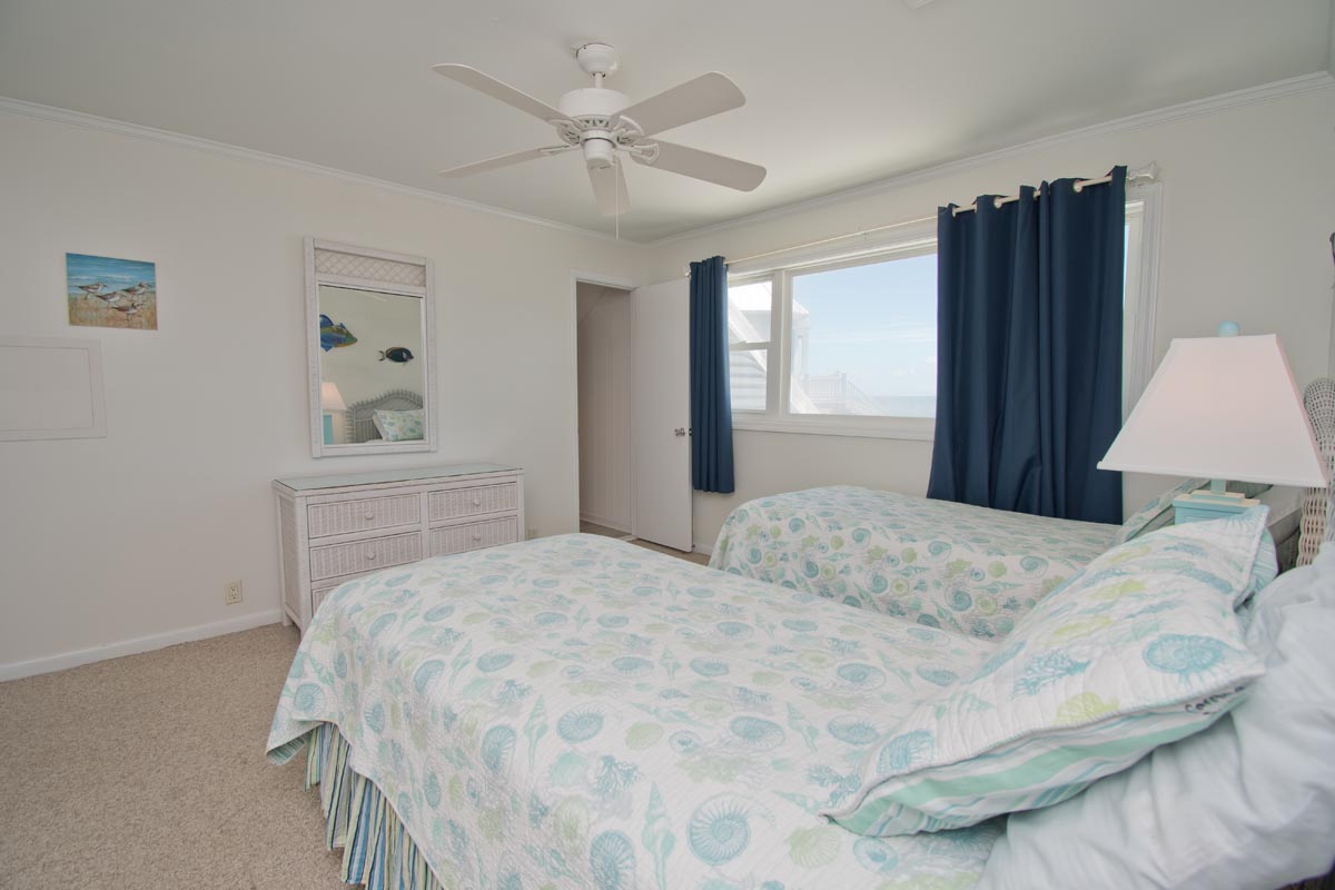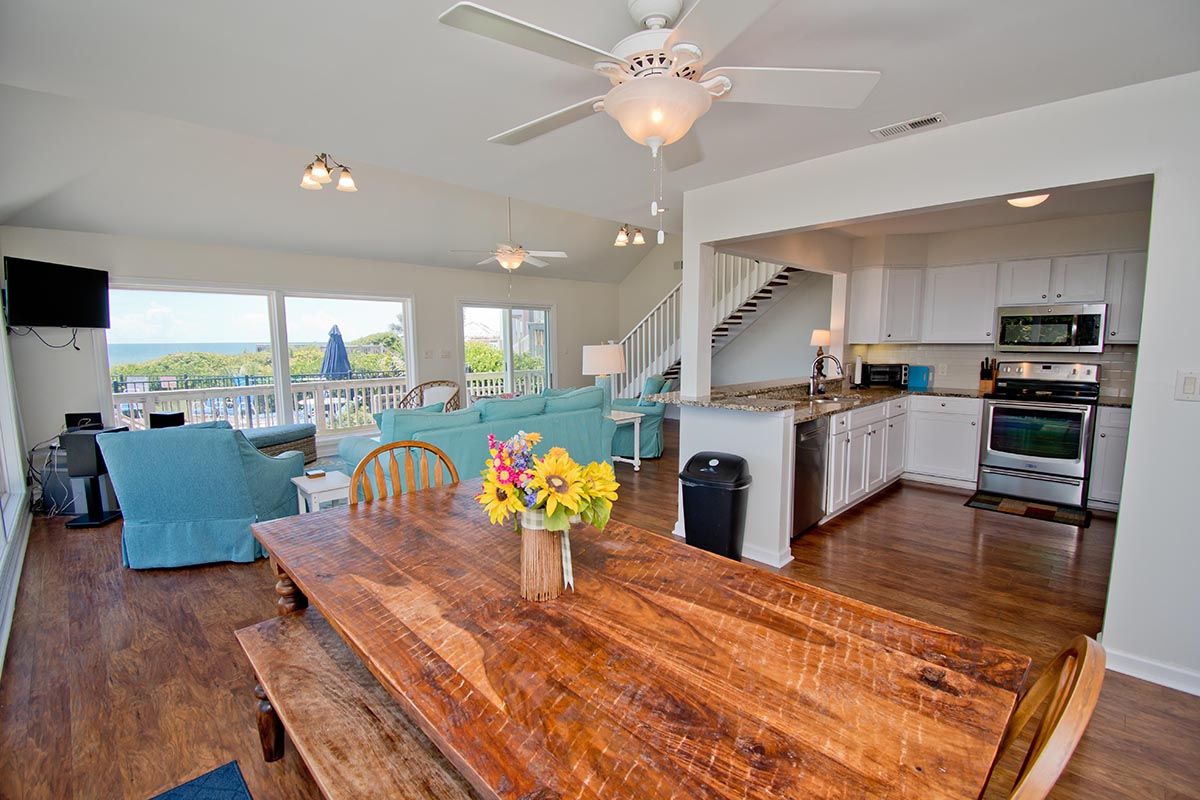 Level One: Large Living Area has Cathedral Ceilings and an Open, Wrap-around, Oceanfront Deck. Dining Area faces the ocean and has access to an Open Deck. Galley Kitchen has a Coffee Maker, Keurig Coffee Maker, Microwave and a Dishwasher. Master Bedroom #1 has a Queen Bed and a Full-Bath. Bedroom #2 has a Queen Bed. Bedroom #3 has 2 Twin Beds. Bedrooms #2 and #3 share a Full-Bath.