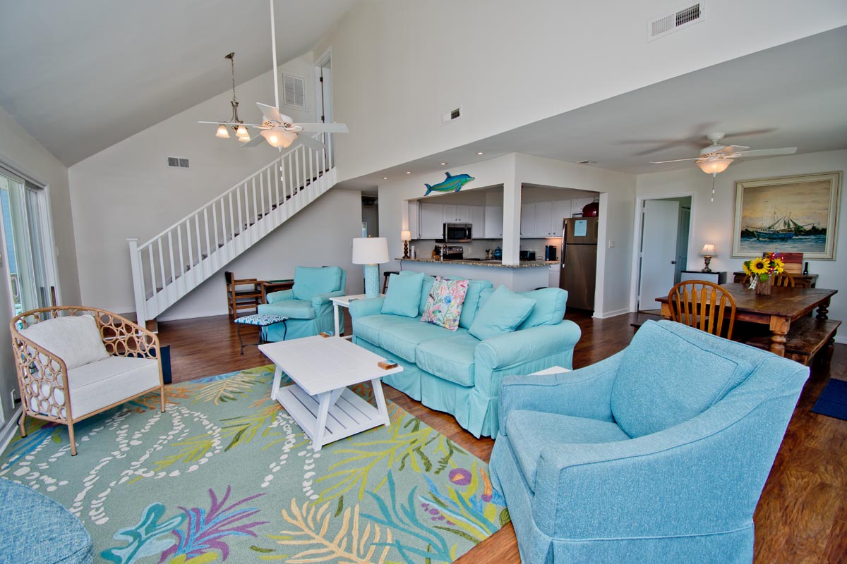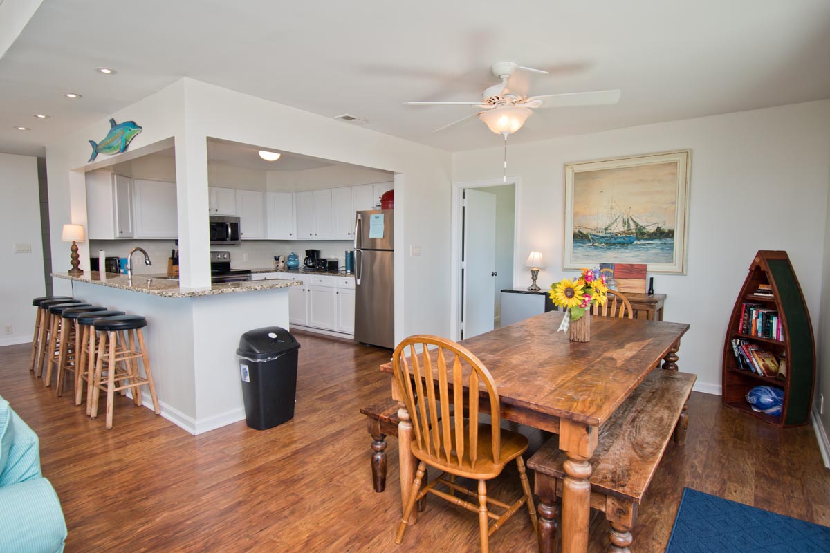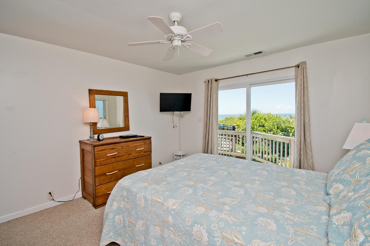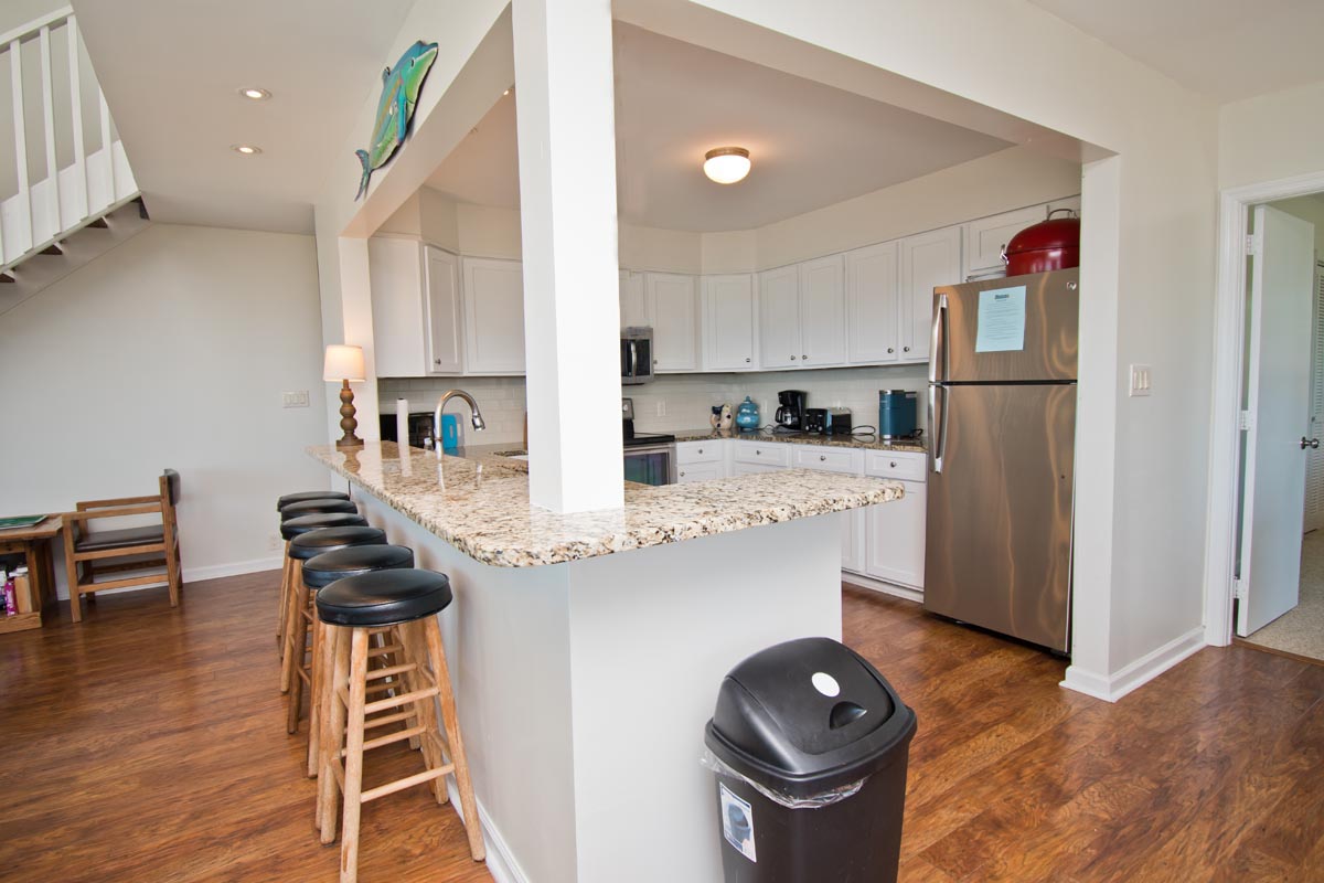 Level One: Large Living Area has Cathedral Ceilings and an Open, Wrap-around, Oceanfront Deck. Dining Area faces the ocean and has access to an Open Deck. Galley Kitchen has a Coffee Maker, Keurig Coffee Maker, Microwave and a Dishwasher. Master Bedroom #1 has a Queen Bed and a Full-Bath. Bedroom #2 has a Queen Bed. Bedroom #3 has 2 Twin Beds. Bedrooms #2 and #3 share a Full-Bath.