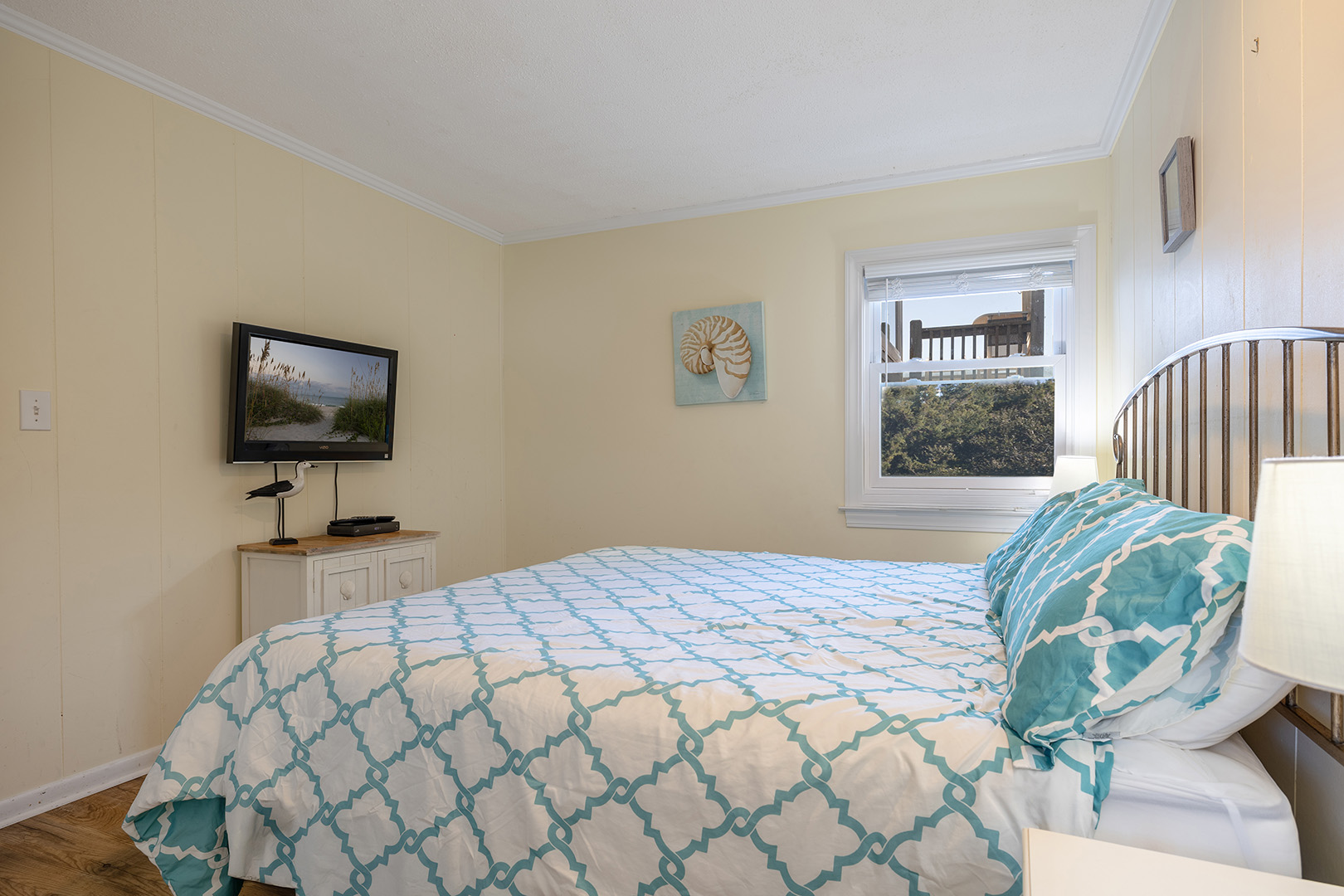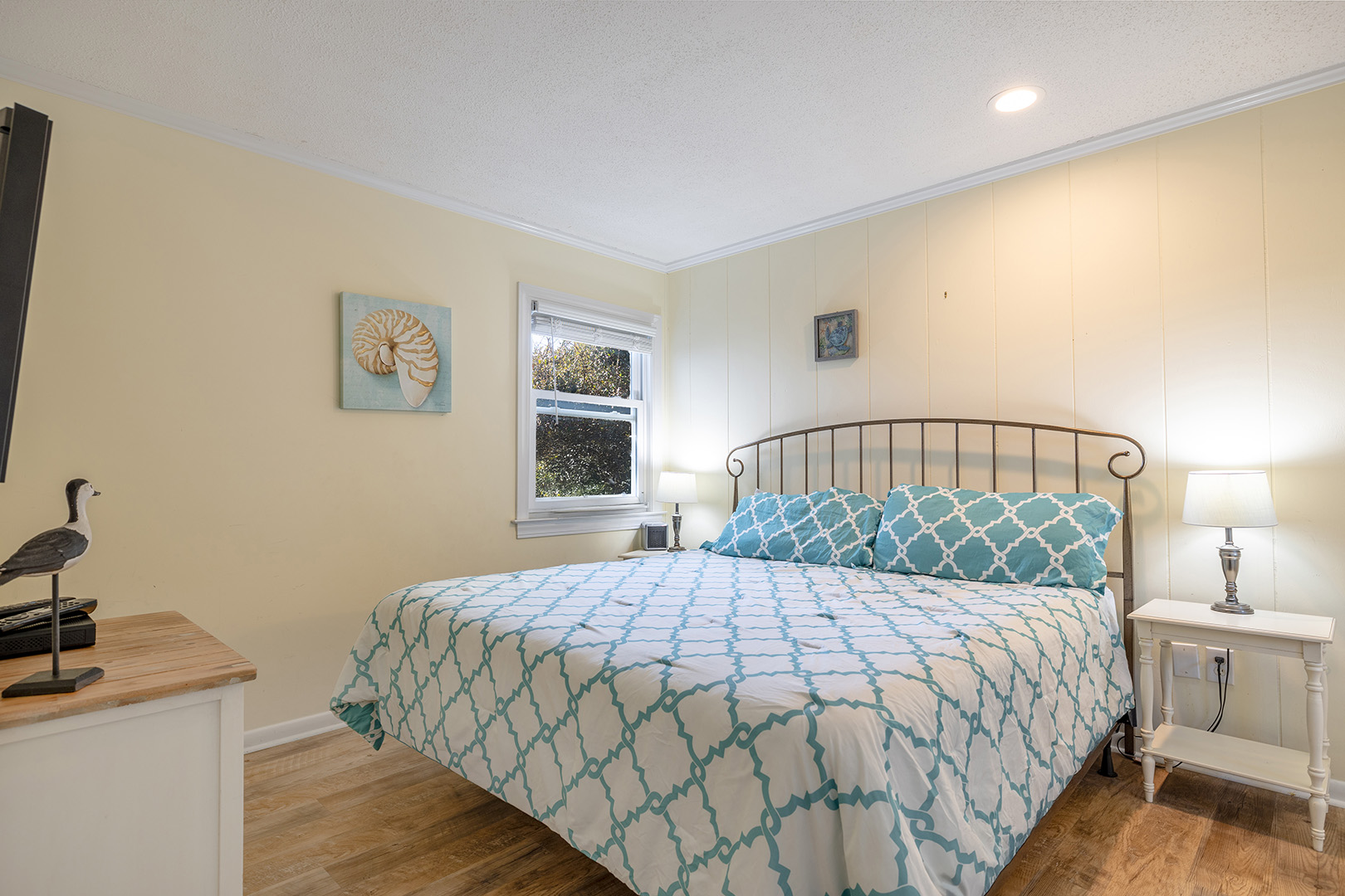 FIRST FLOOR - Master bedroom #1 with King bed, flat-screen TV, and full private bath. Bedroom #2 has 1 Twin bed and 1 Twin bunk with a full bathroom in the hallway.
