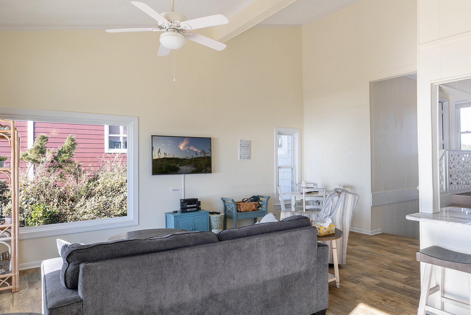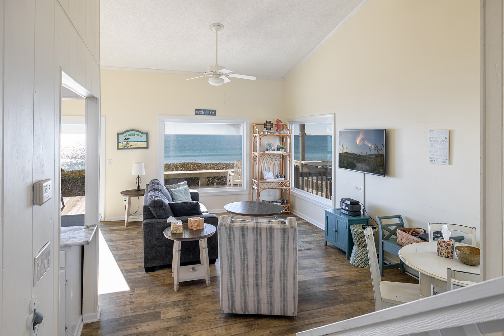 SECOND FLOOR - Open floor plan living and dining room, kitchen, flat-screen TV with access to the deck.