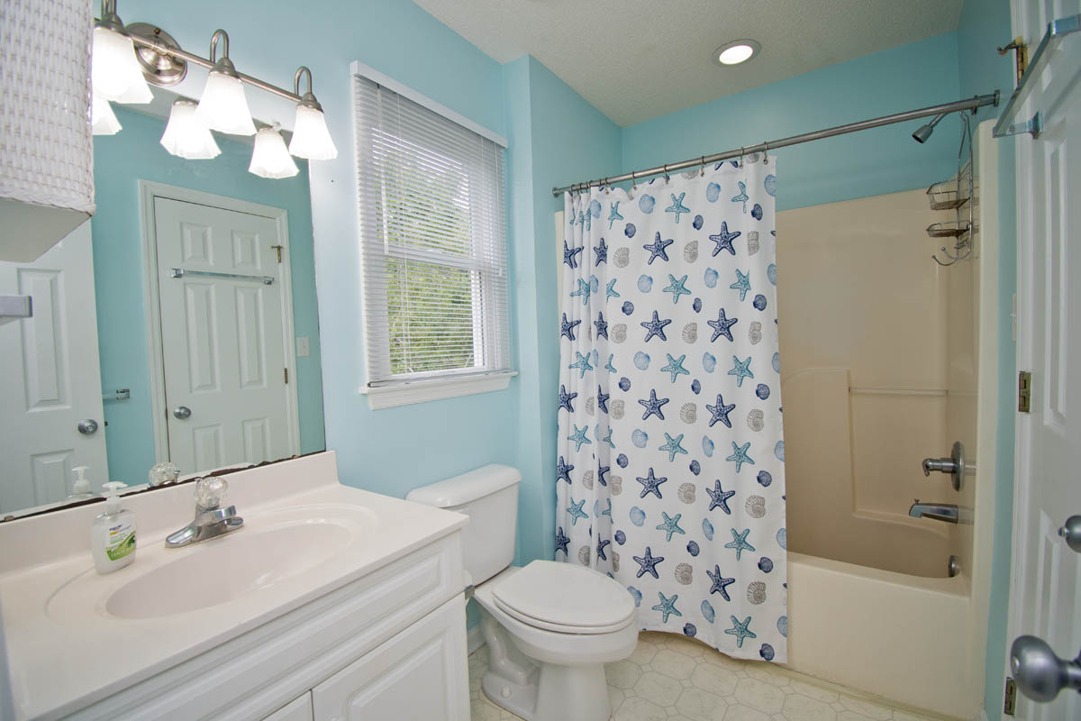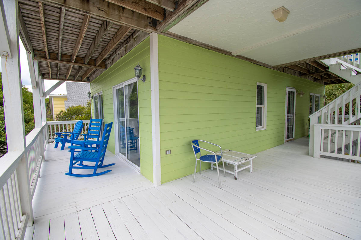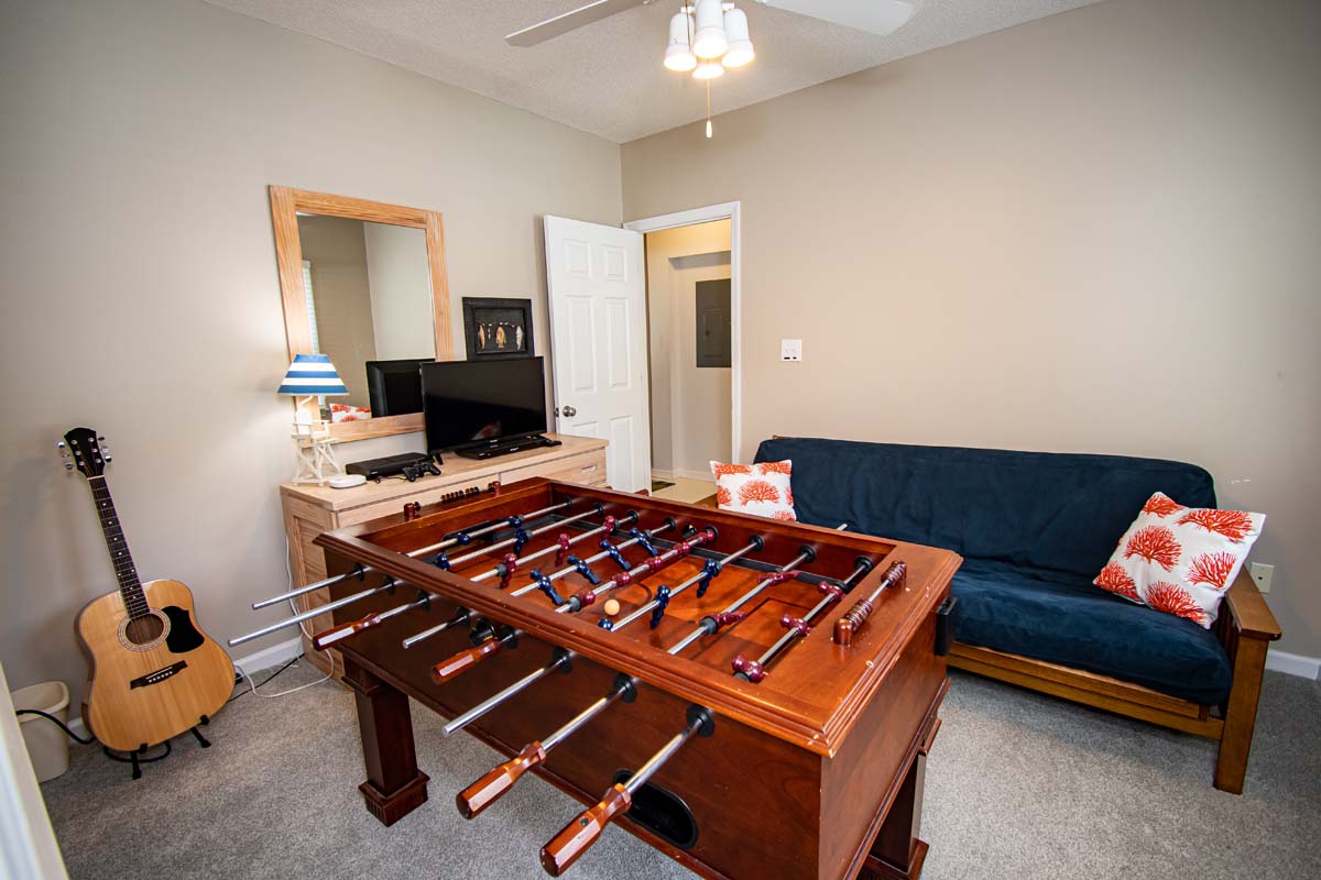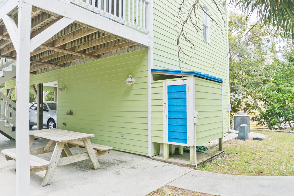 Ground Level: The exterior of this home has a covered area that is ideal for parking your car in the shade! There is also a hot/cold outdoor shower to take advantage of after a long day of sand and sea. This level contains a den/game room with a TV, a PlayStation 3, a futon, and a foosball table! There is also a full bathroom on the ground floor.