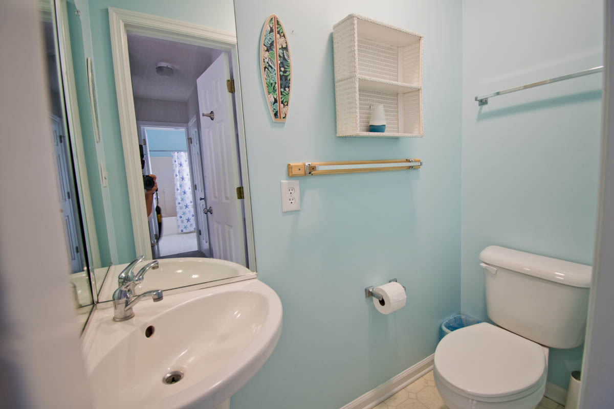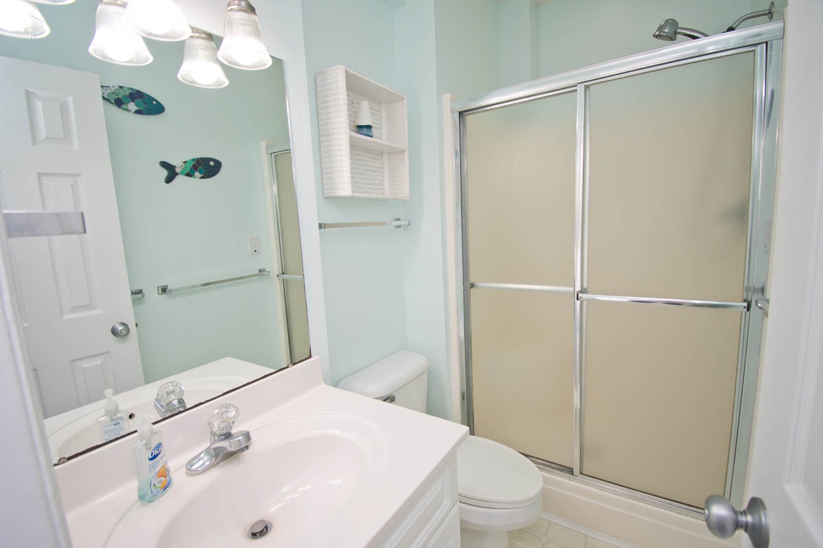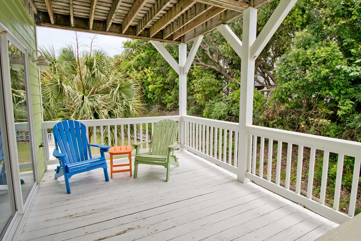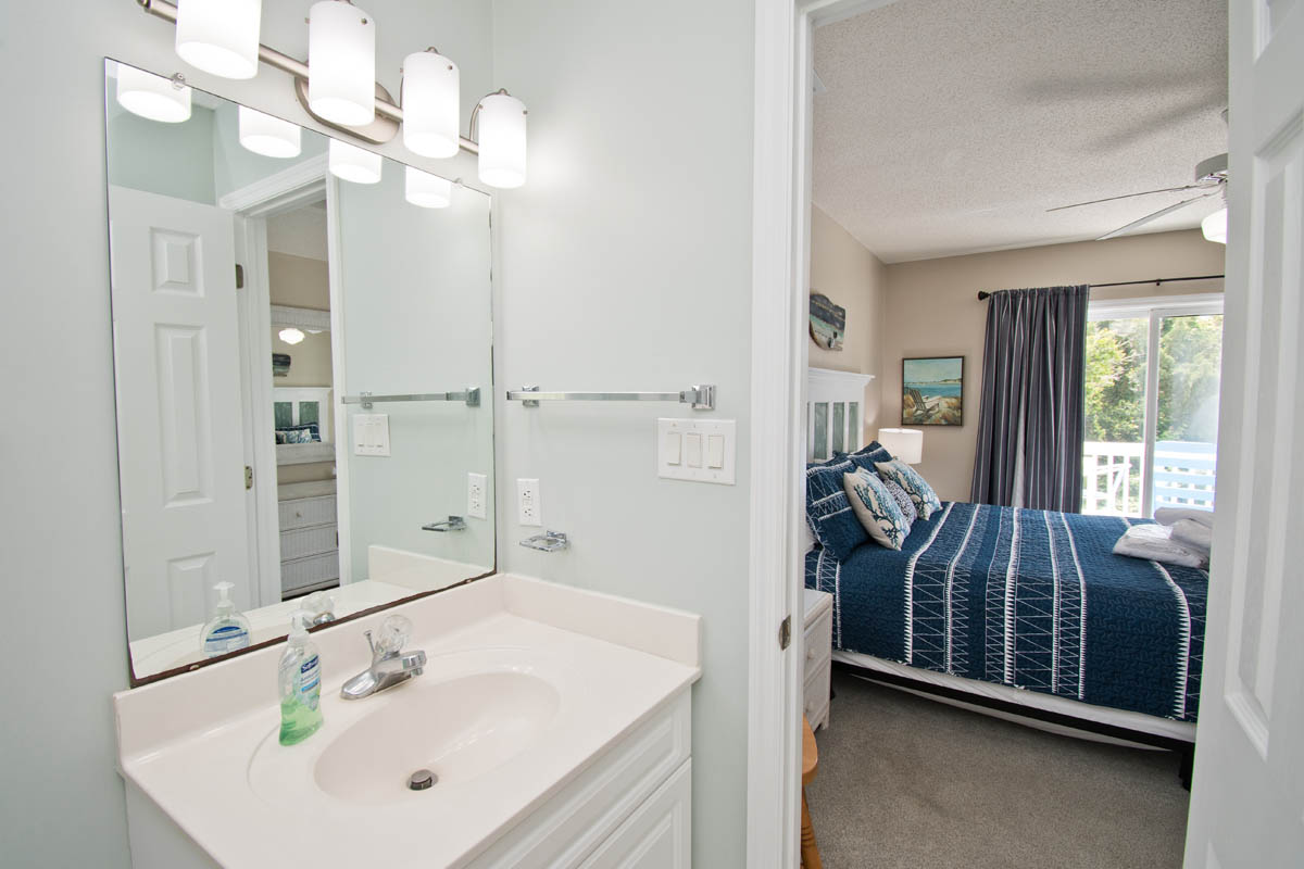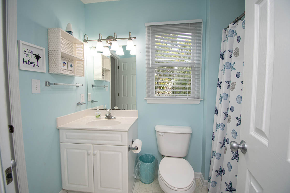 Ground Level: The exterior of this home has a covered area that is ideal for parking your car in the shade! There is also a hot/cold outdoor shower to take advantage of after a long day of sand and sea. This level contains a den/game room with a TV, a PlayStation 3, a futon, and a foosball table! There is also a full bathroom on the ground floor.