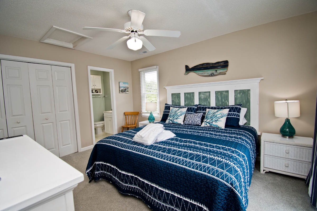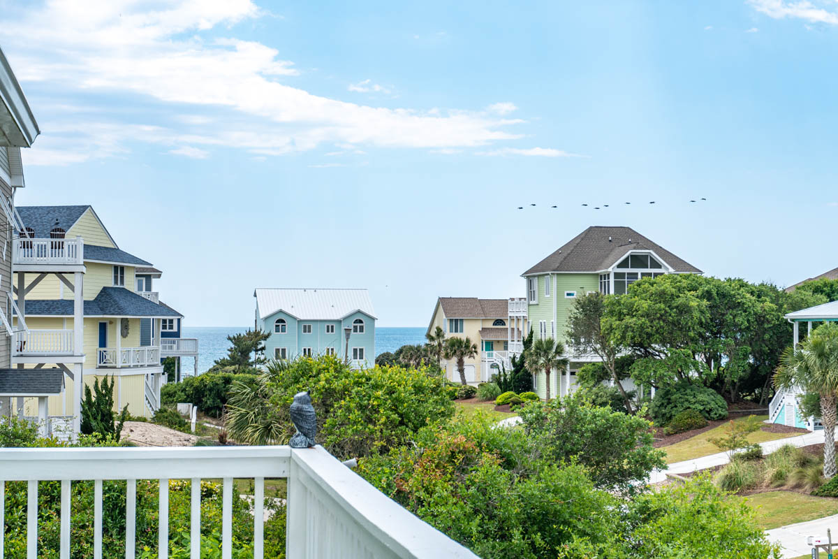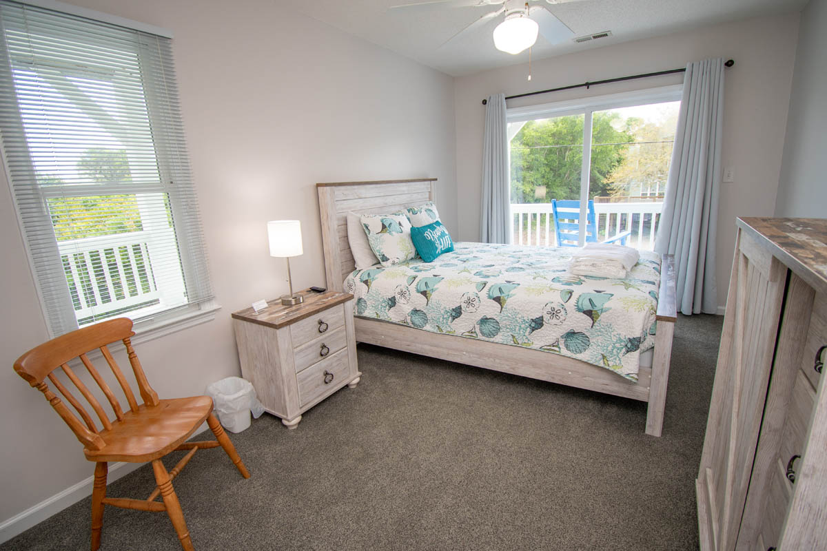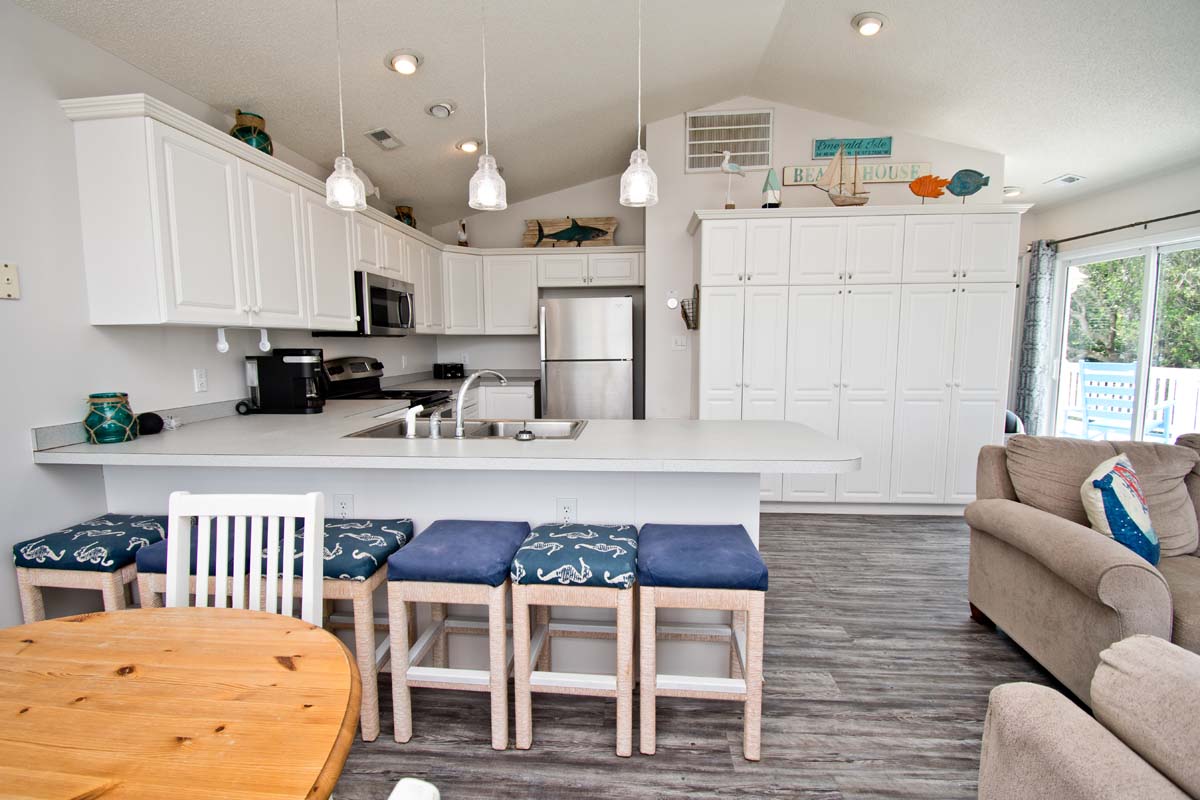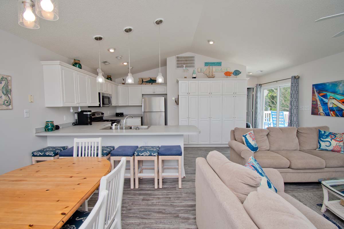 Level Two: This level of the home houses a large, open living area with a TV. There is a spacious dining room with a large table that comfortably seats six and additional bar seating for five that faces the kitchen. The kitchen is fully equipped to serve all of your dining and snacking needs with updated appliances and a Keurig coffee machine, toaster, and blender. Ask the Amazon Alexa Dot to play you some music or outline the weather for the next few days while you sit on the couch or cook a meal! There is a cozy sunroom on this level with large windows to let in the warmth of the Emerald Isle rays. Take in beautiful ocean views from sunroom, living and dining room plus the decks! Master bedroom #4 has a king bed, a TV, its own private full bathroom, and deck access to take in the sights.
