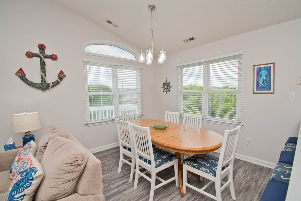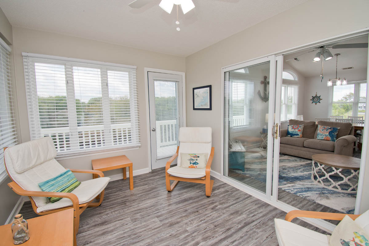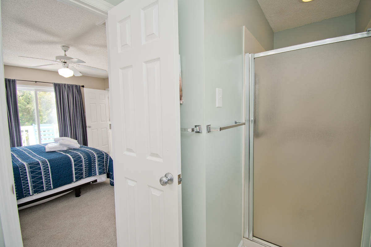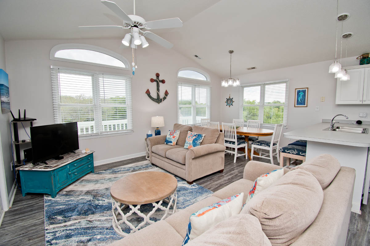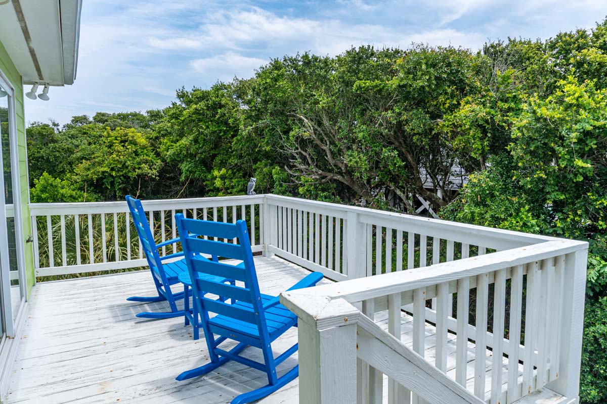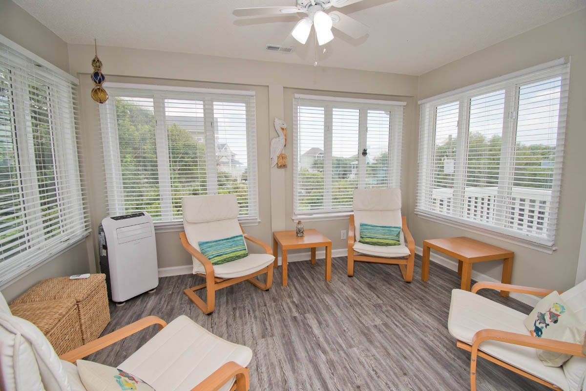Level Two: This level of the home houses a large, open living area with a TV. There is a spacious dining room with a large table that comfortably seats six and additional bar seating for five that faces the kitchen. The kitchen is fully equipped to serve all of your dining and snacking needs with updated appliances and a Keurig coffee machine, toaster, and blender. Ask the Amazon Alexa Dot to play you some music or outline the weather for the next few days while you sit on the couch or cook a meal! There is a cozy sunroom on this level with large windows to let in the warmth of the Emerald Isle rays. Take in beautiful ocean views from sunroom, living and dining room plus the decks! Master bedroom #4 has a king bed, a TV, its own private full bathroom, and deck access to take in the sights.