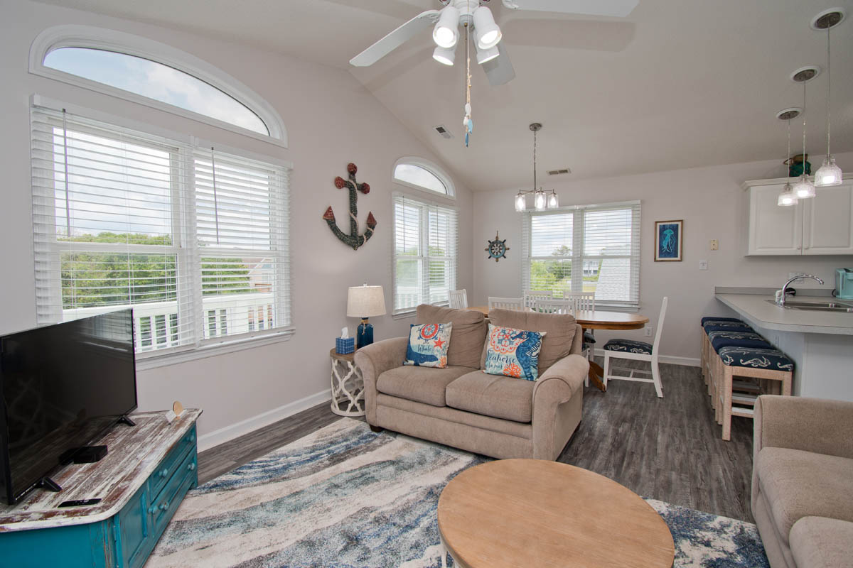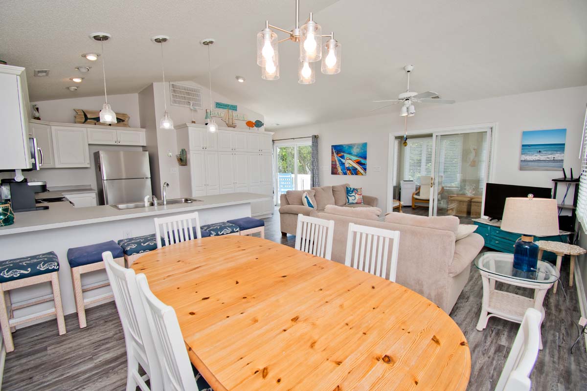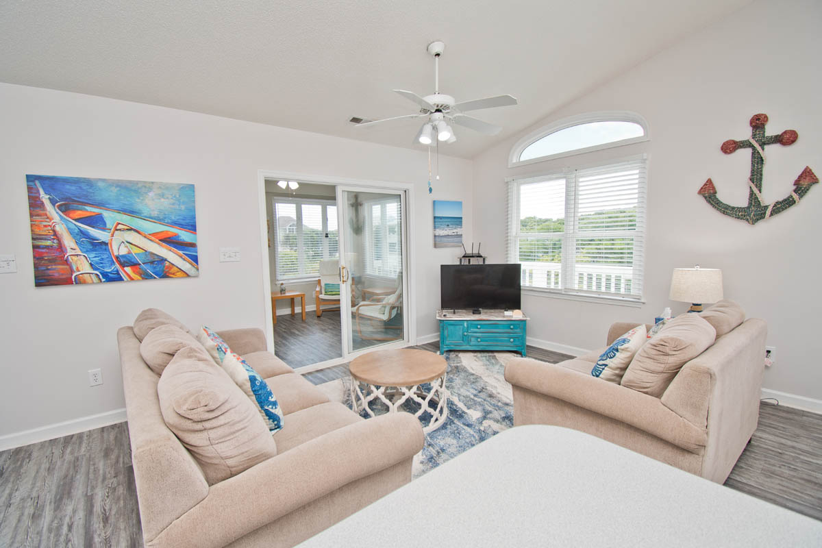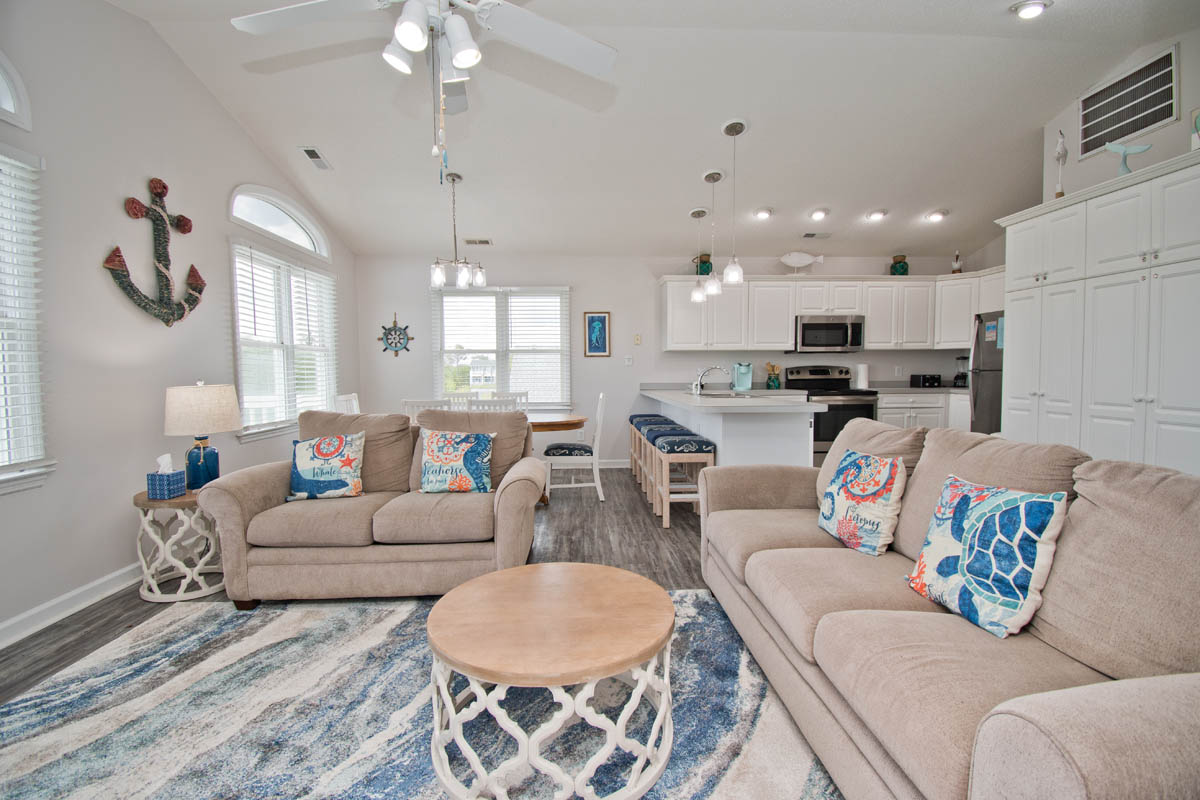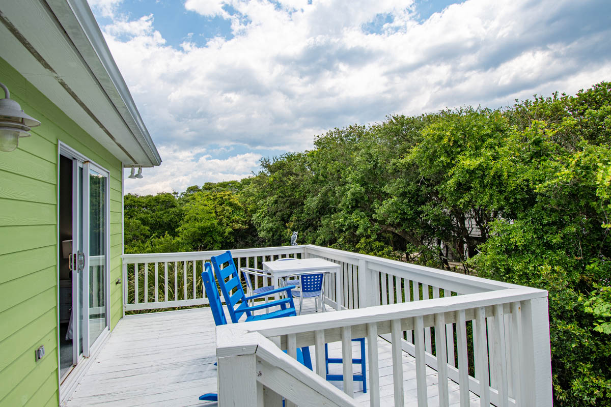 Level Two: This level of the home houses a large, open living area with a TV. There is a spacious dining room with a large table that comfortably seats six and additional bar seating for five that faces the kitchen. The kitchen is fully equipped to serve all of your dining and snacking needs with updated appliances and a Keurig coffee machine, toaster, and blender. Ask the Amazon Alexa Dot to play you some music or outline the weather for the next few days while you sit on the couch or cook a meal! There is a cozy sunroom on this level with large windows to let in the warmth of the Emerald Isle rays. Take in beautiful ocean views from sunroom, living and dining room plus the decks! Master bedroom #4 has a king bed, a TV, its own private full bathroom, and deck access to take in the sights.