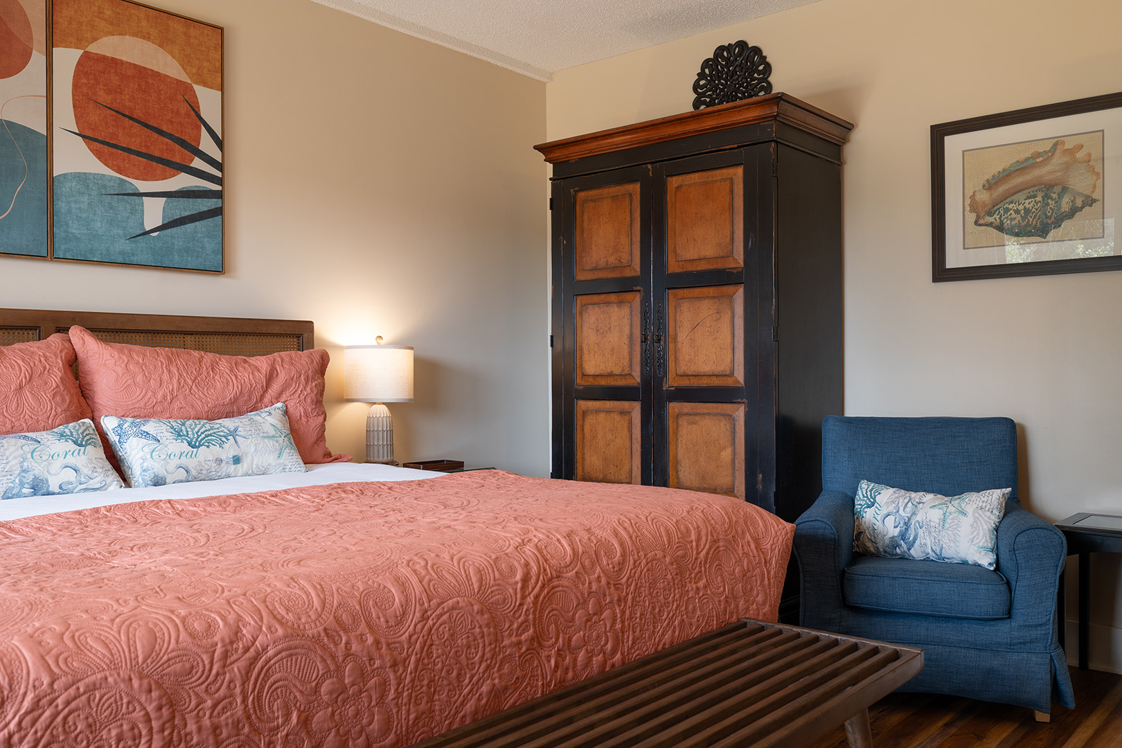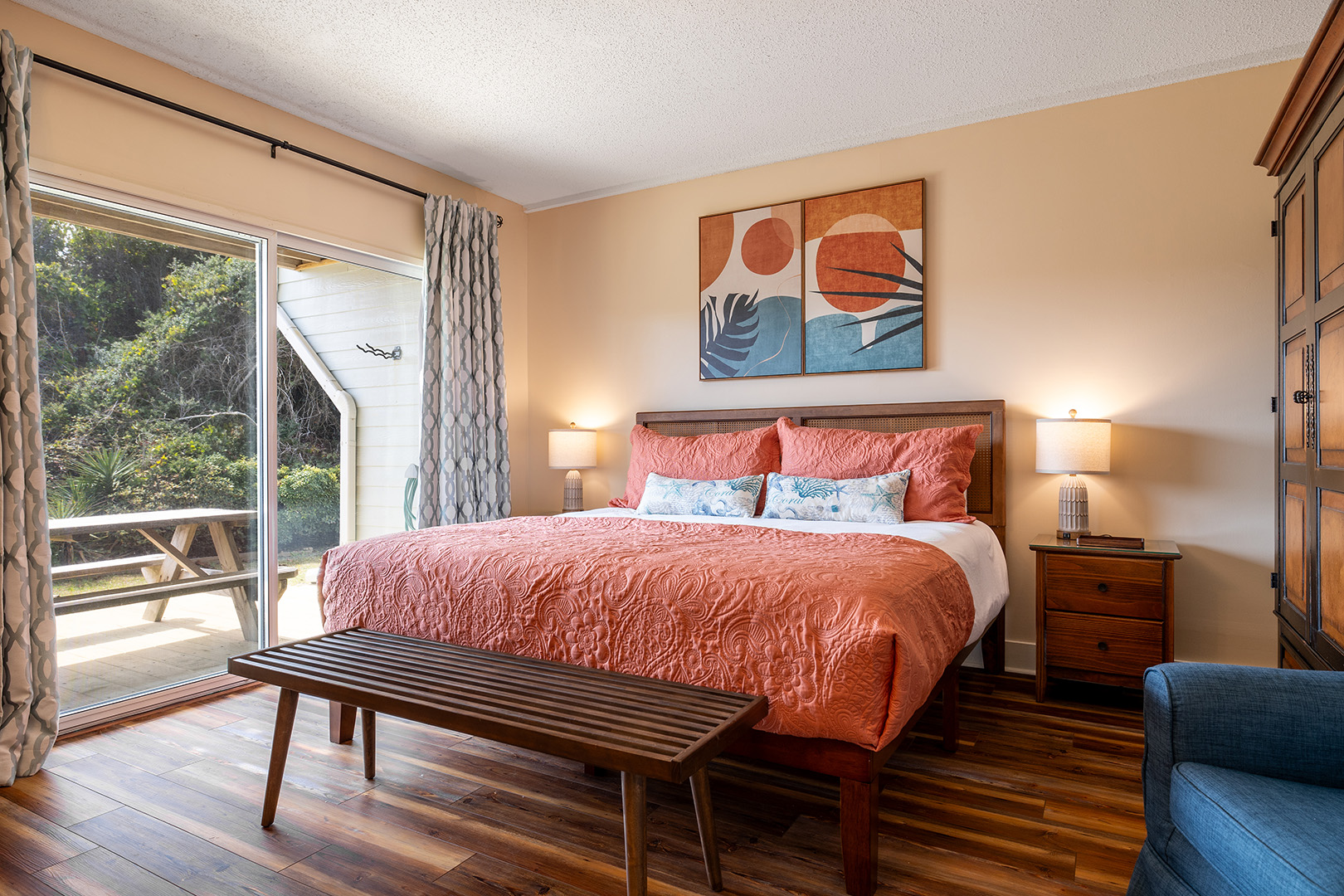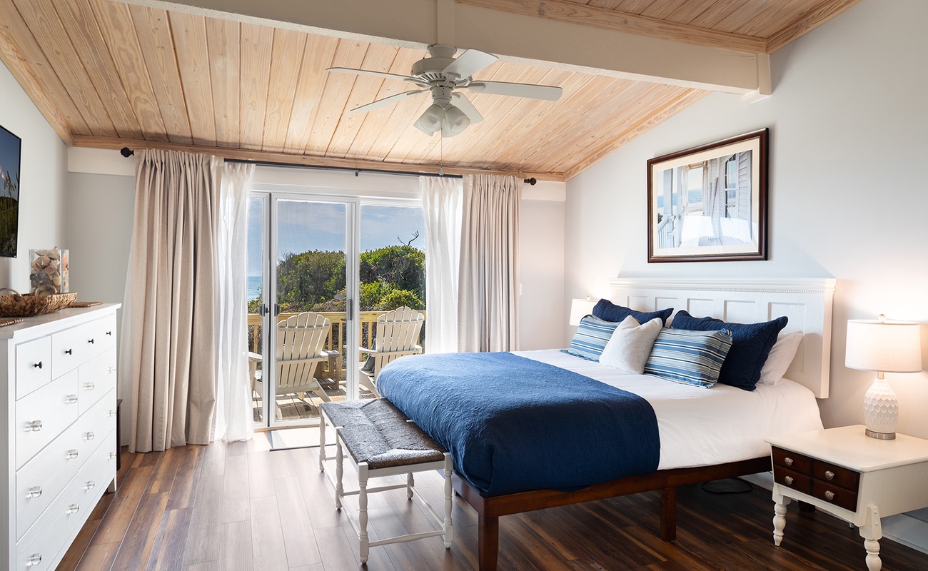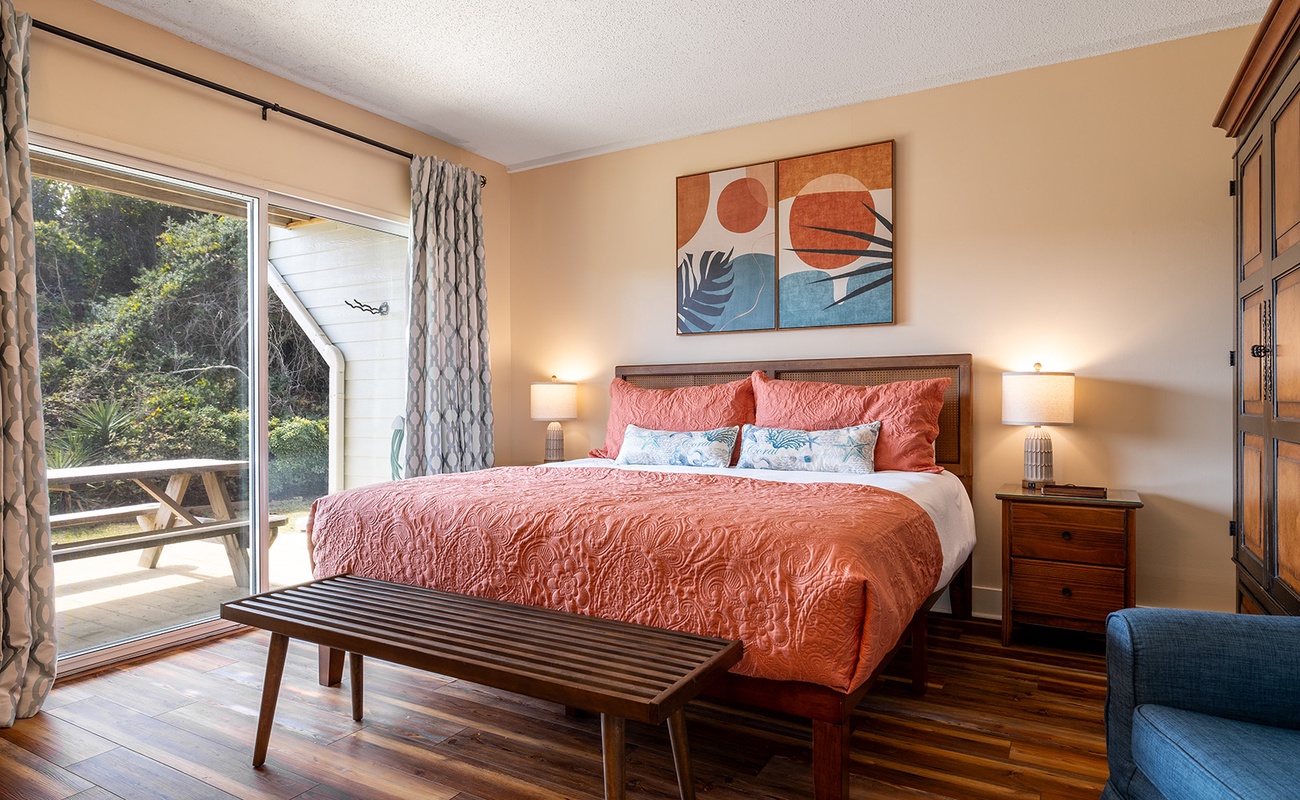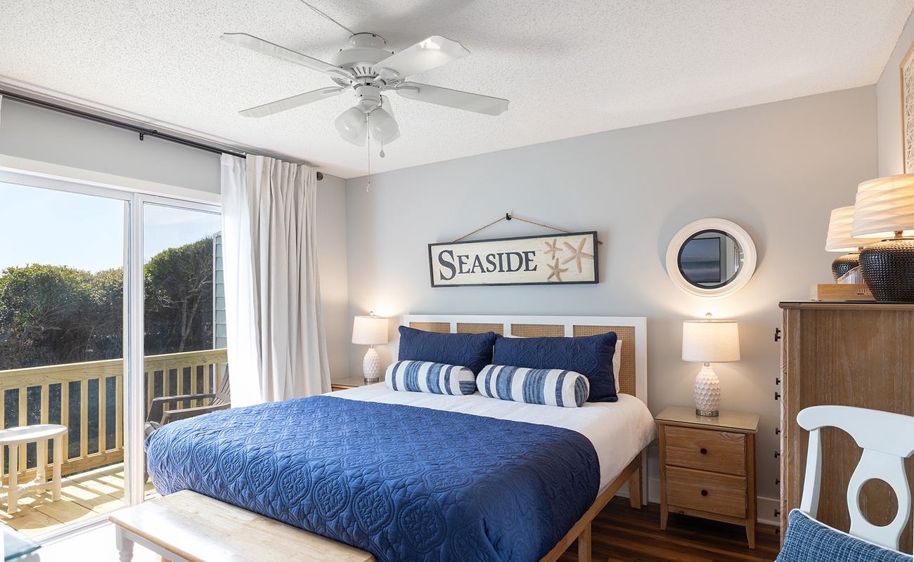King bed, dresser, Roku TV, night stands, armoire, unattached newly updated private bath, access to ground level deck and walkway to beach