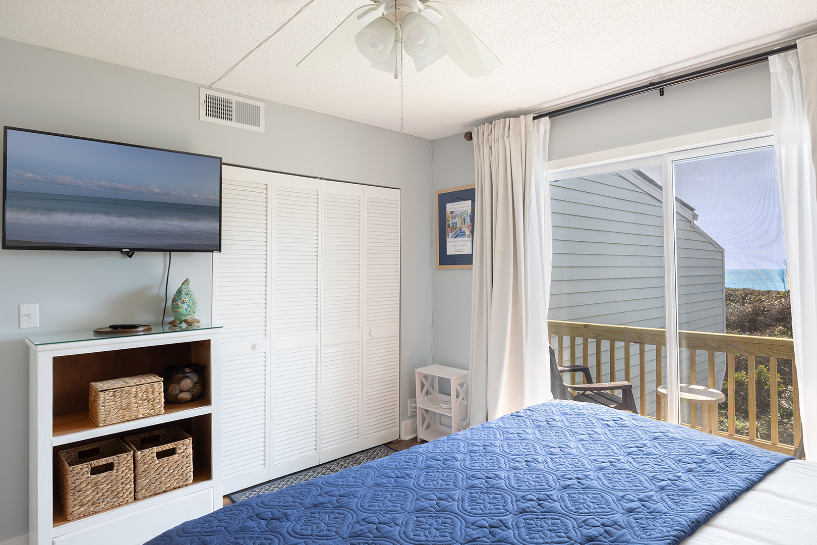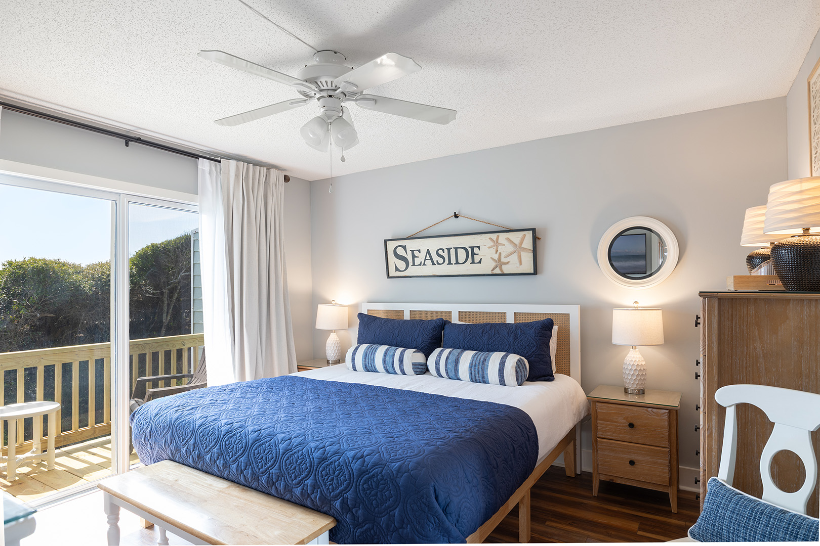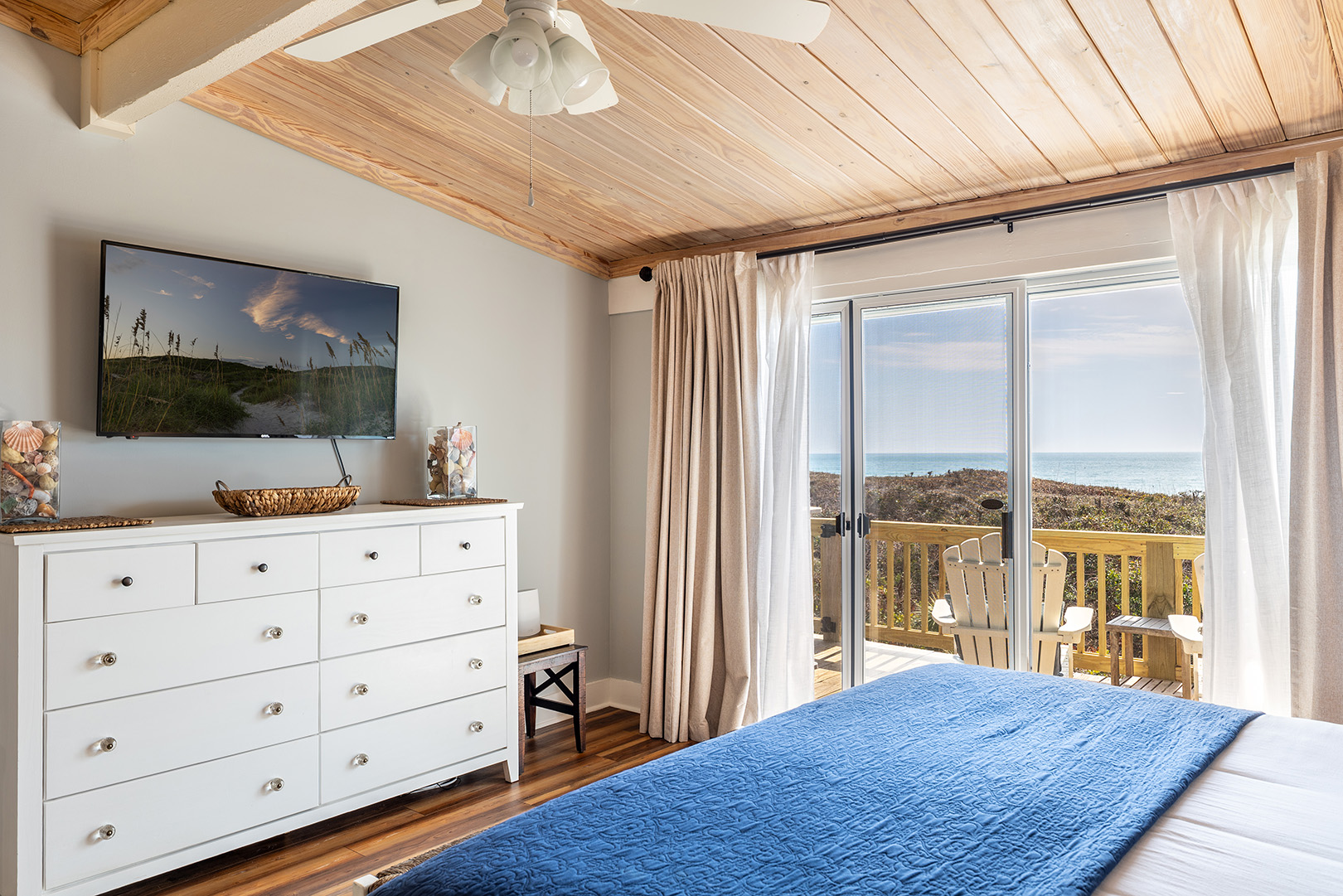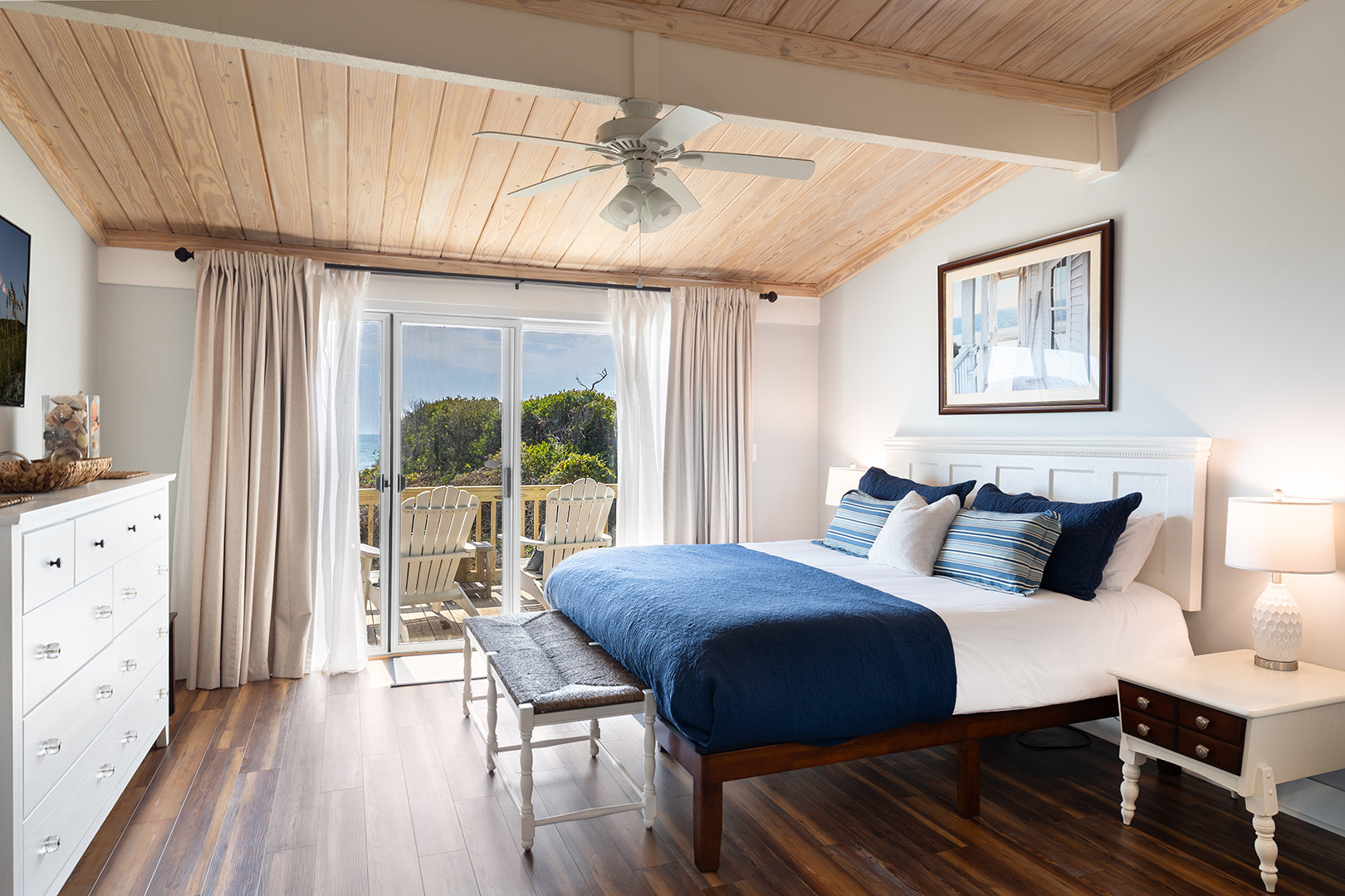 King bed, dresser, Roku TV, night stands, armoire, unattached newly updated private bath, access to ground level deck and walkway to beach