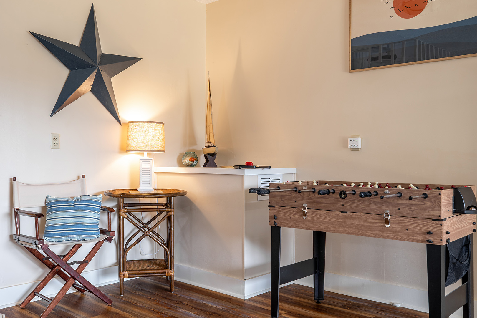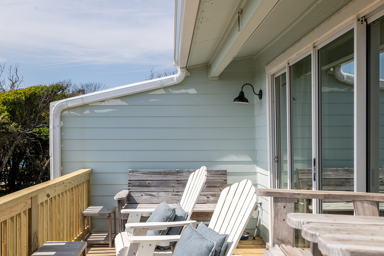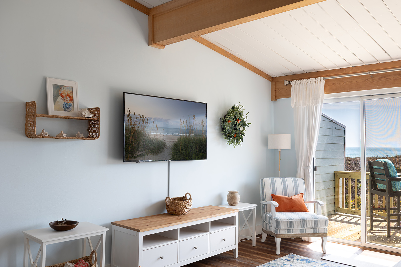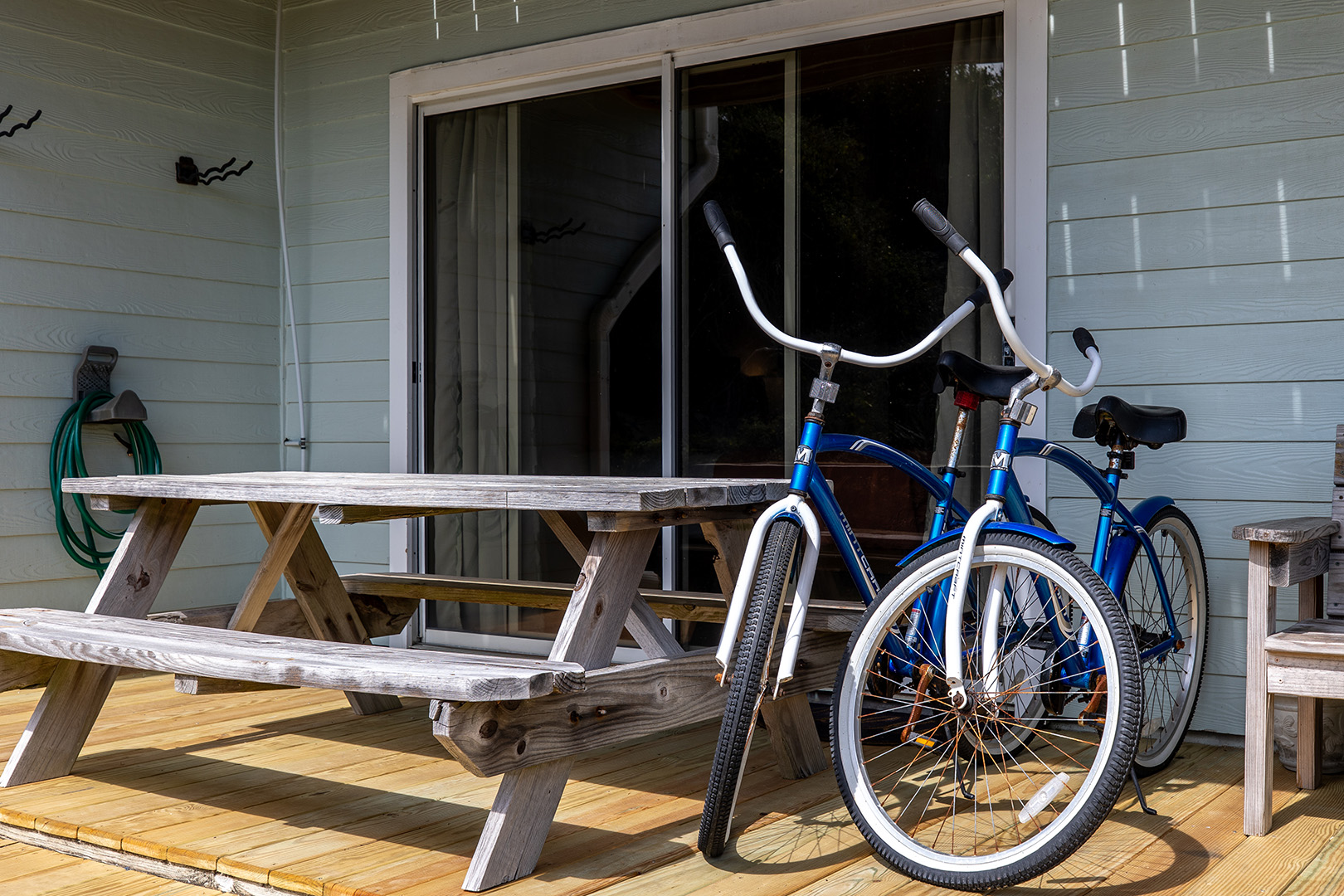King bed, dresser, Roku TV, night stands, armoire, unattached newly updated private bath, access to ground level deck and walkway to beach