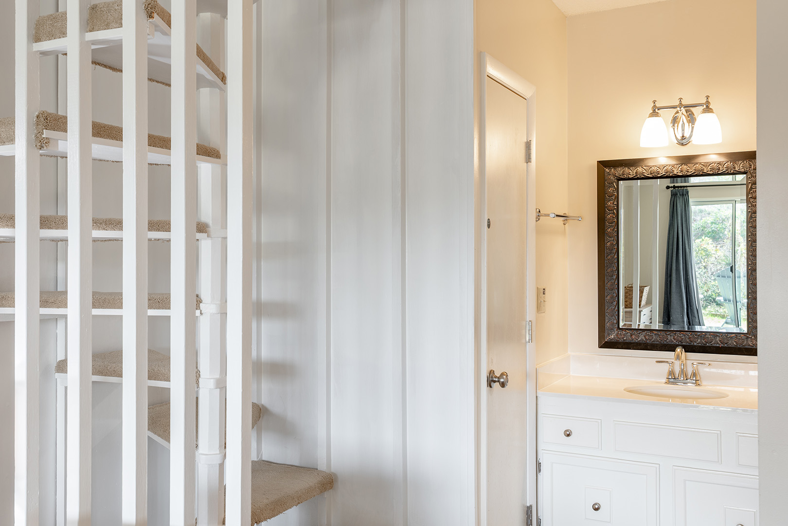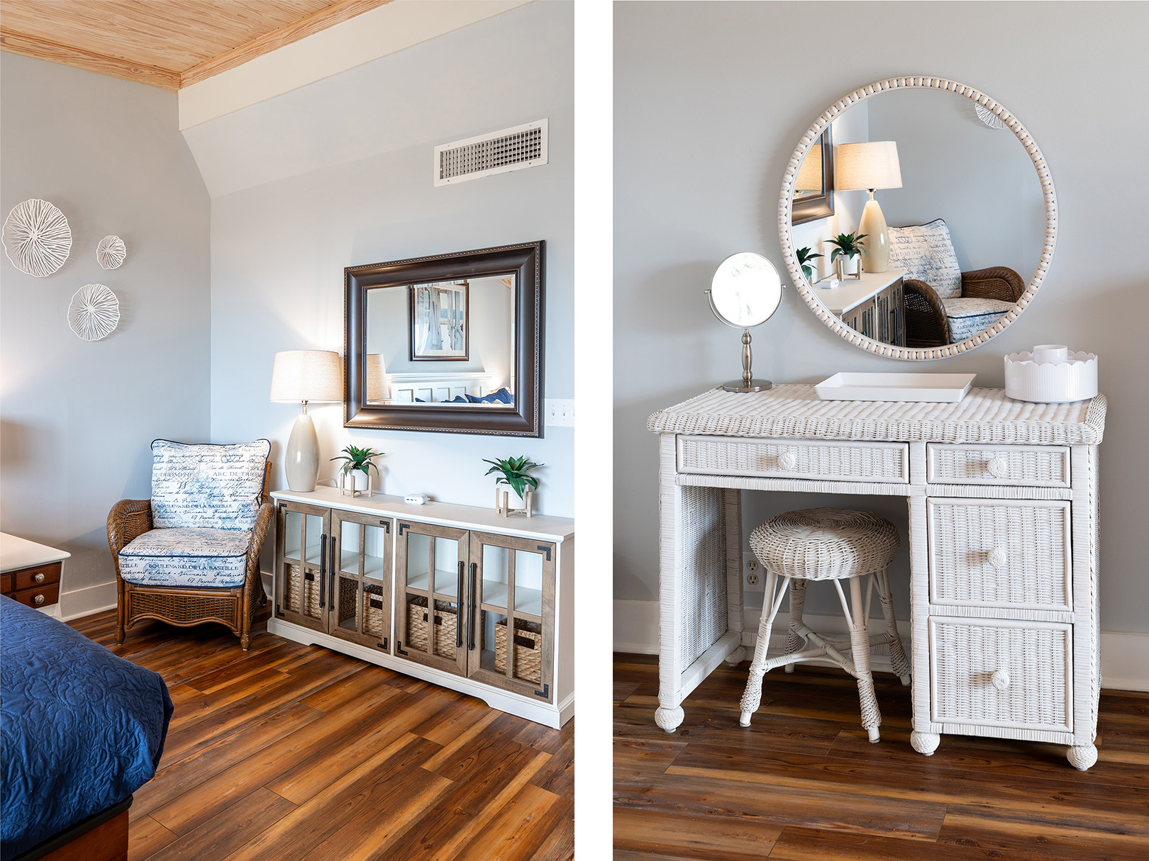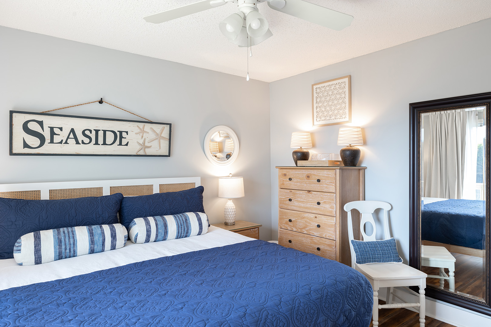 King bed, Roku TV, make-up table and chair, dresser, night stands, full closet, 2 upholstered chairs, attached newly updated bathroom, ceiling fan, upper main deck access