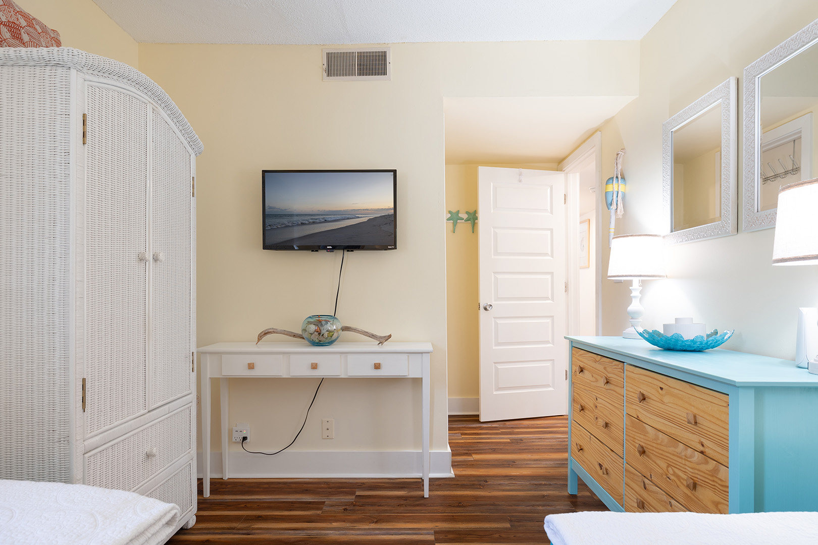 2 Twin beds, Roku TV, dresser, armoire, dresser, shared bath