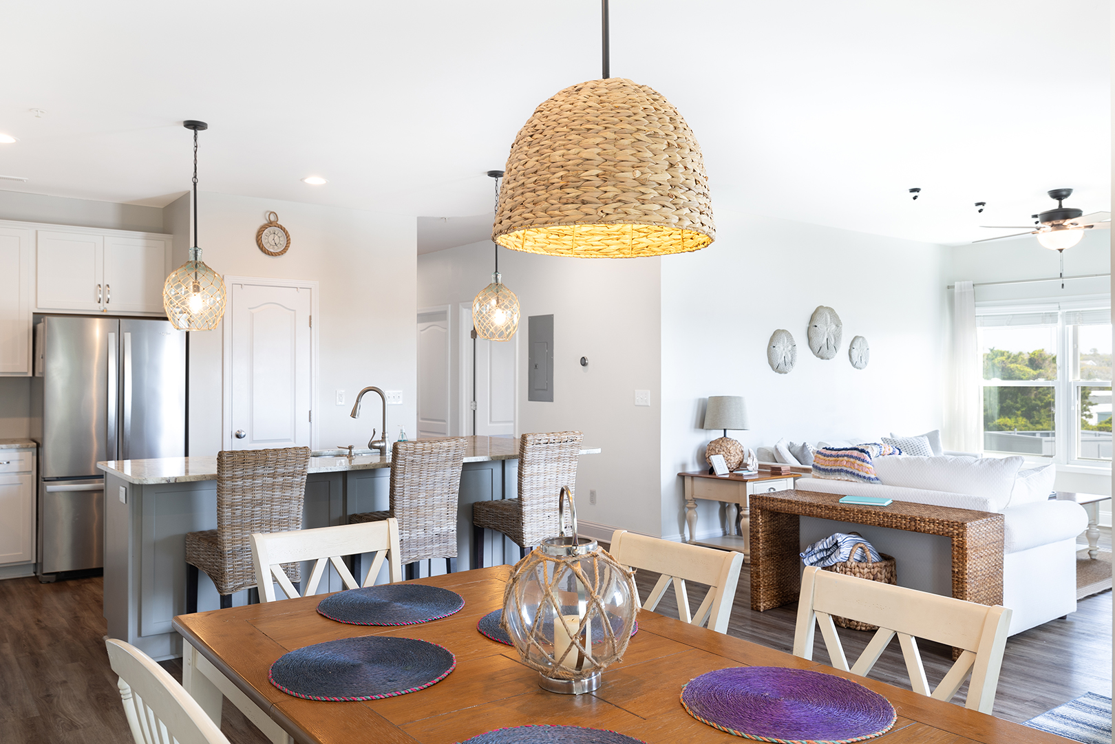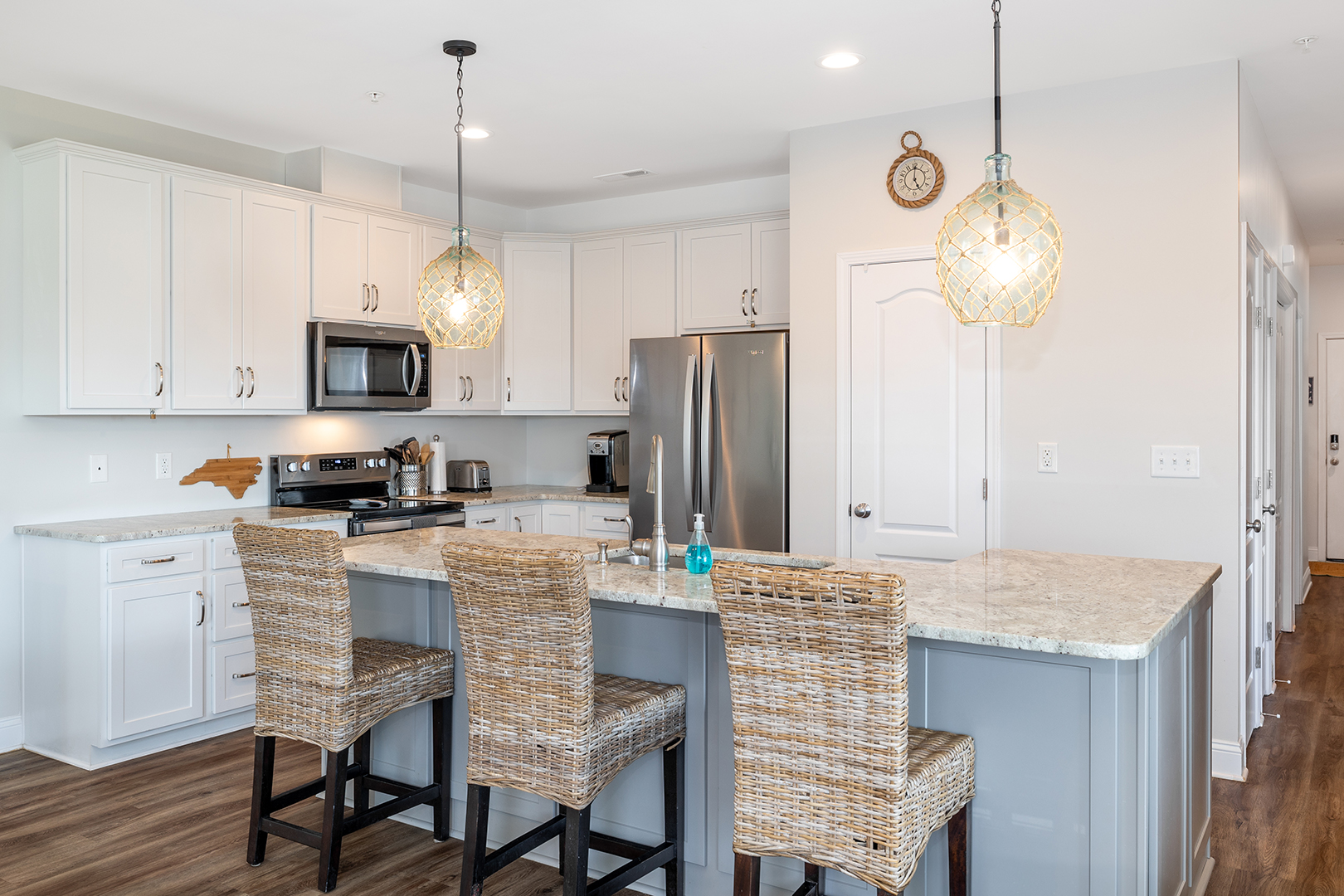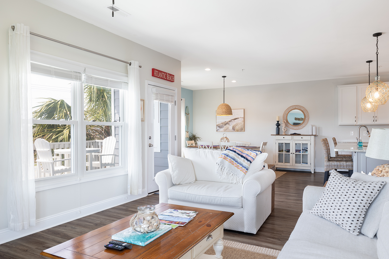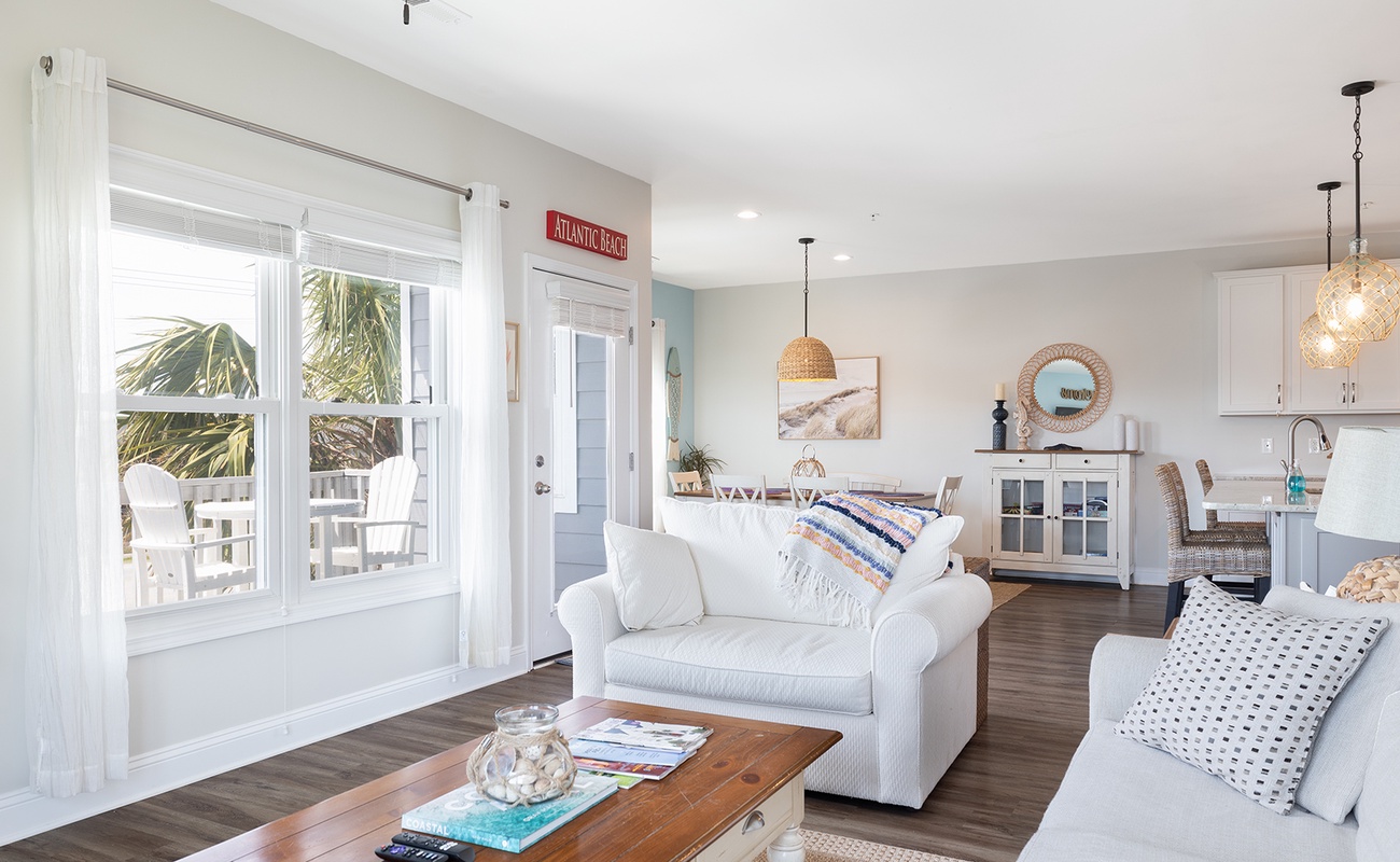 Crystal View 104A is an oceanview 3-bedroom, 2-bathroom condo nestled in the heart of Atlantic Beach. It is conveniently located within a short driving reach of Emerald Isle, Beaufort, and Morehead City while also granting access to tons of attractions, restaurants, and shops! This unit's bathrooms and kitchen have been recently updated. The beautiful, open floorplan in the kitchen, dining area, and den make it easy to prepare any meals and spend time with family while also enjoying breath taking views of the ocean. There are three barstools for the Kitchen Island and there is a large pantry in the kitchen for all your vacation storage needs. Be sure to enjoy the outdoor deck located next to the den where you can lounge on the outdoor funiture! With an outdoor couch, table, and chairs you will have plenty of room to lounge with your friends or family!