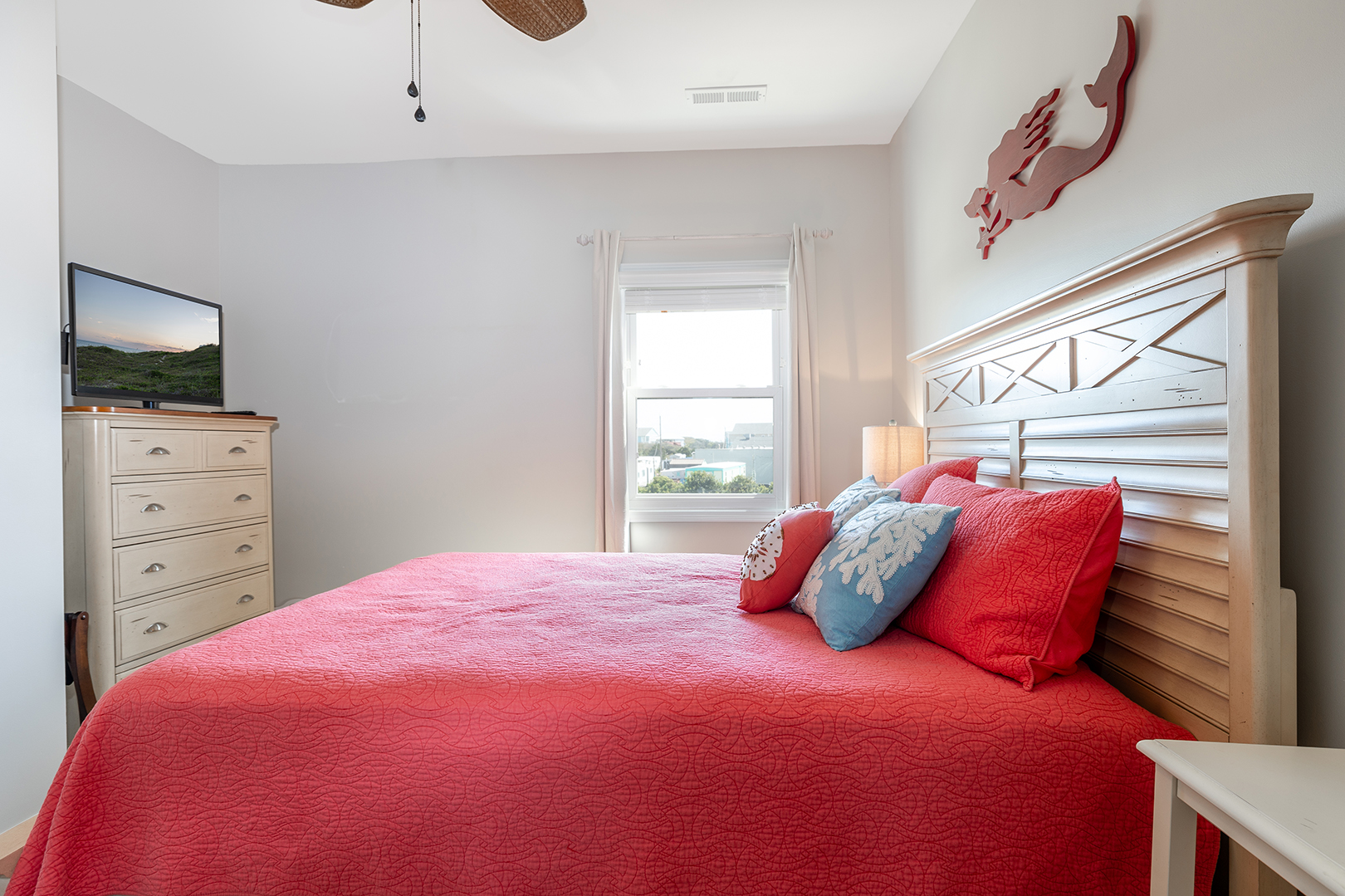 Bedroom #1 has a king bed, smart TV, and its own private full bathroom. Bedroom #2 has two twin beds, a smart TV, a walk in closet, and access to a private full bathroom. Bedroom #3 has a queen bed with a standard TV equipped with fire stick connection.