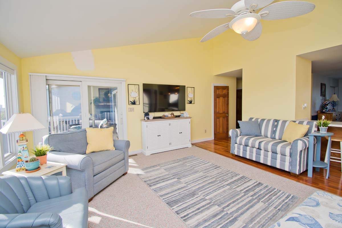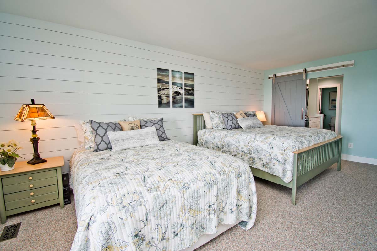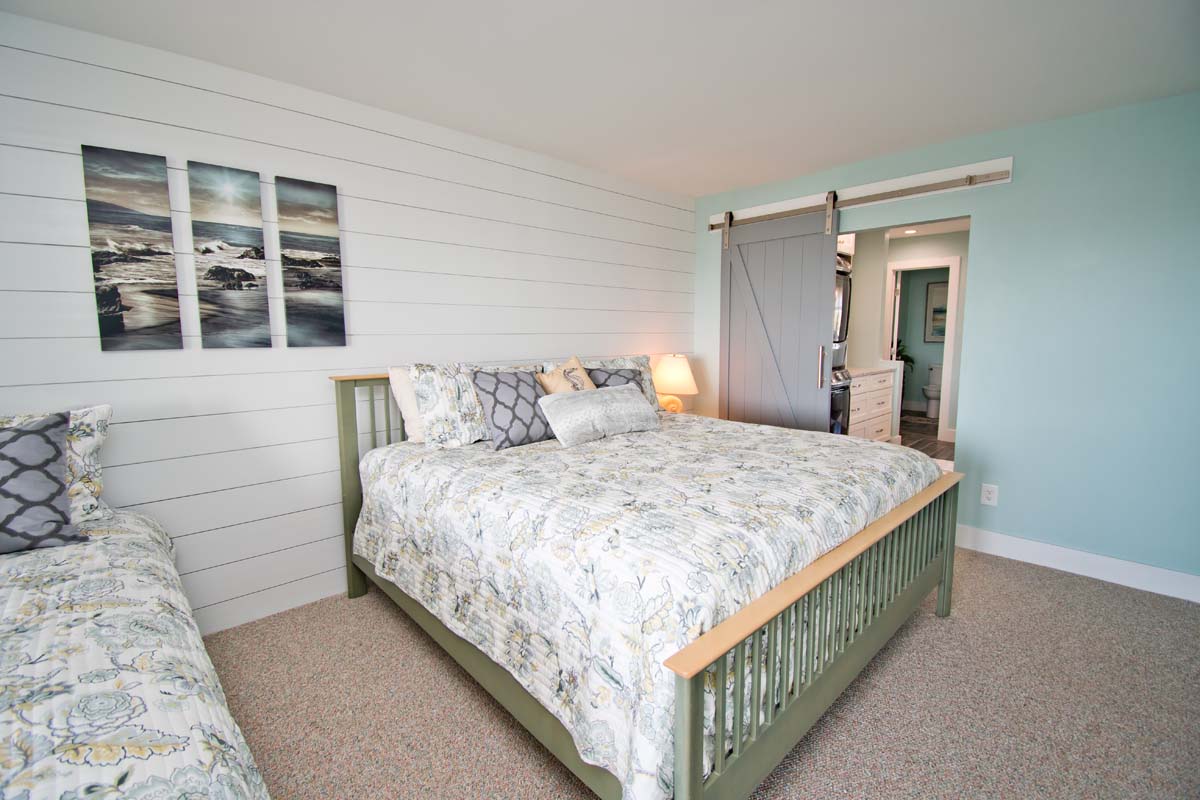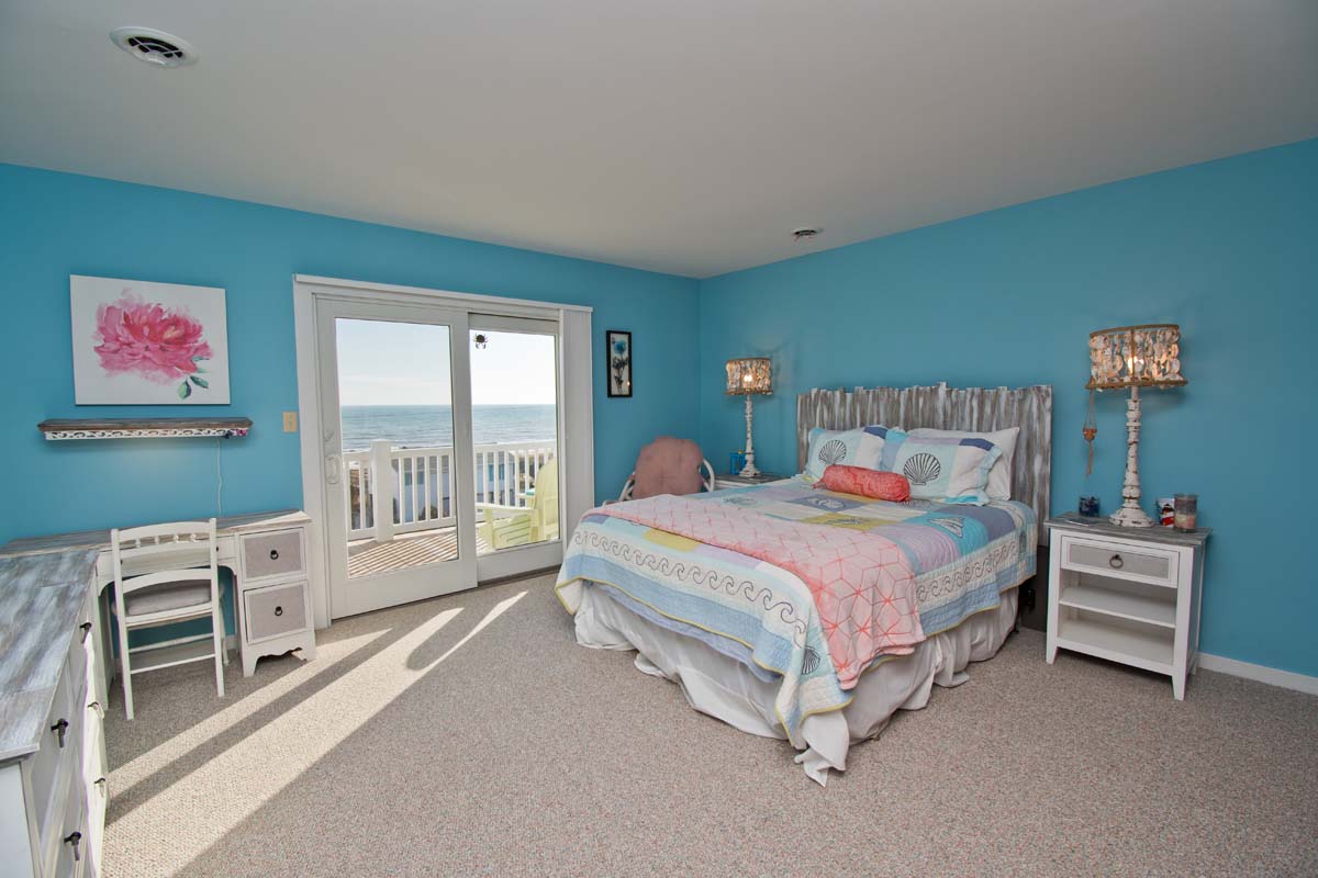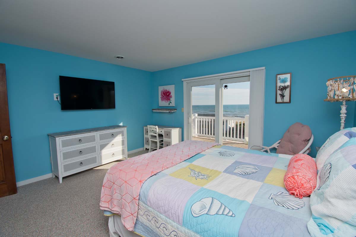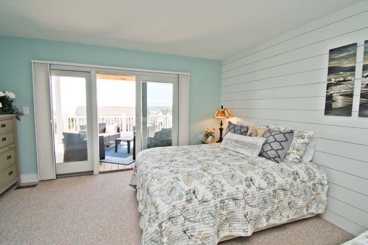Bedroom #2 has a queen bed, deck access, a Smart TV, access to a shared bathroom, and ocean views.