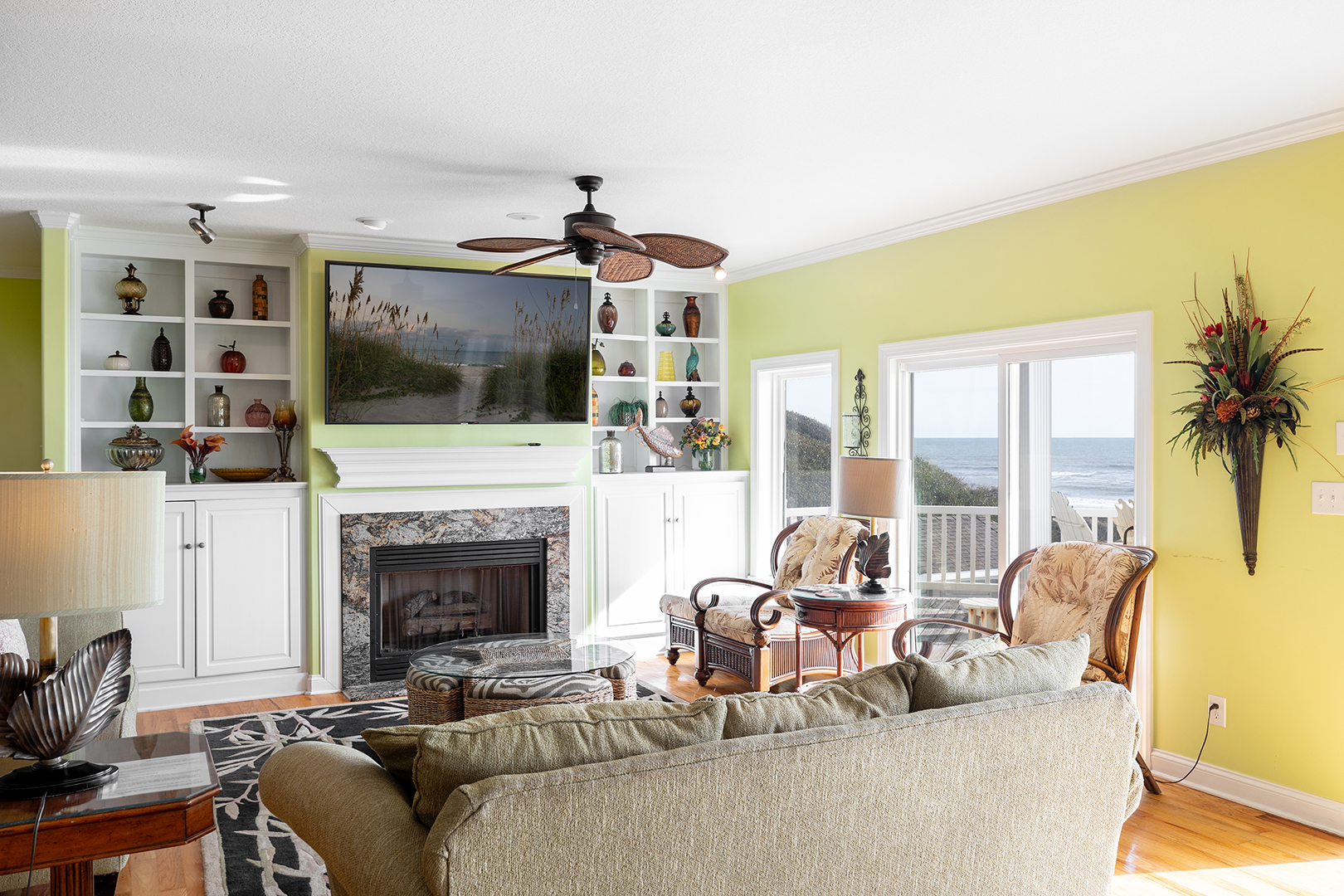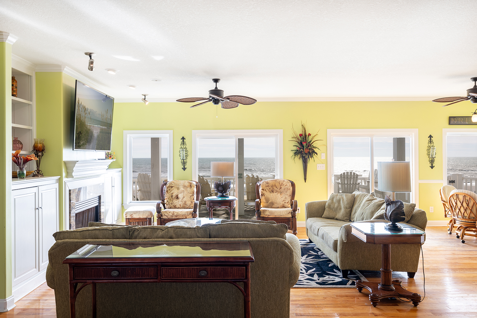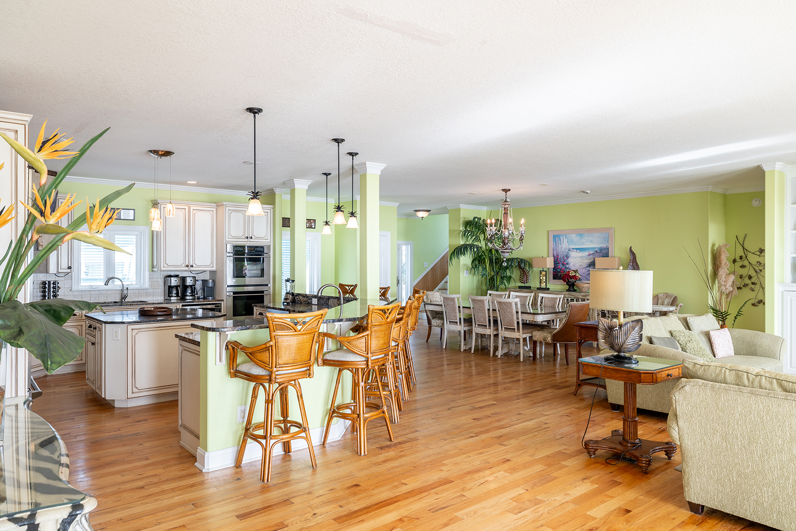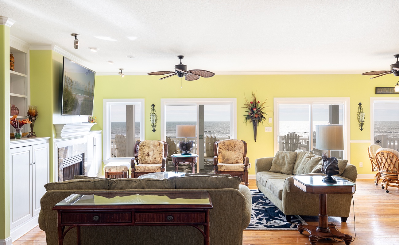Floor #1: Kitchen, Half Bath, Living Room, Oceanfront Green Bedroom with Queen Bed and Full Bath, Oceanfront Orange Bedroom with King Bed and Full Bath
