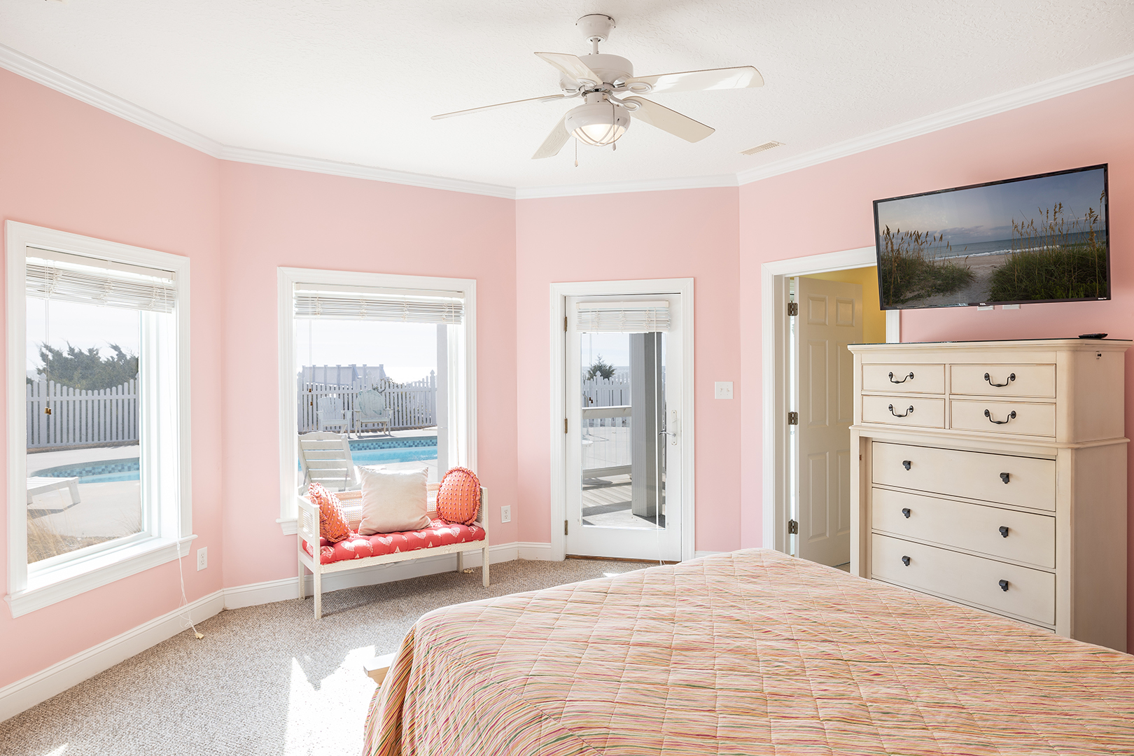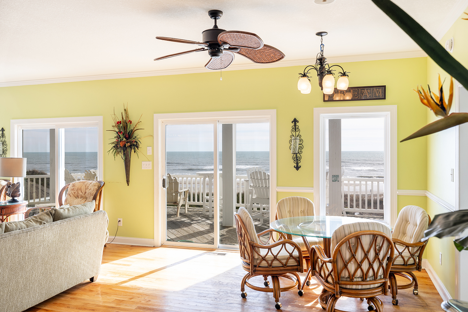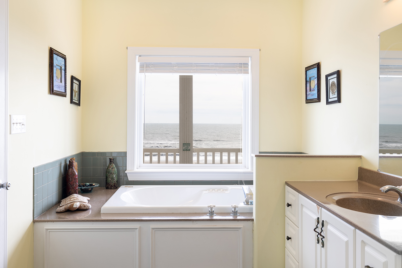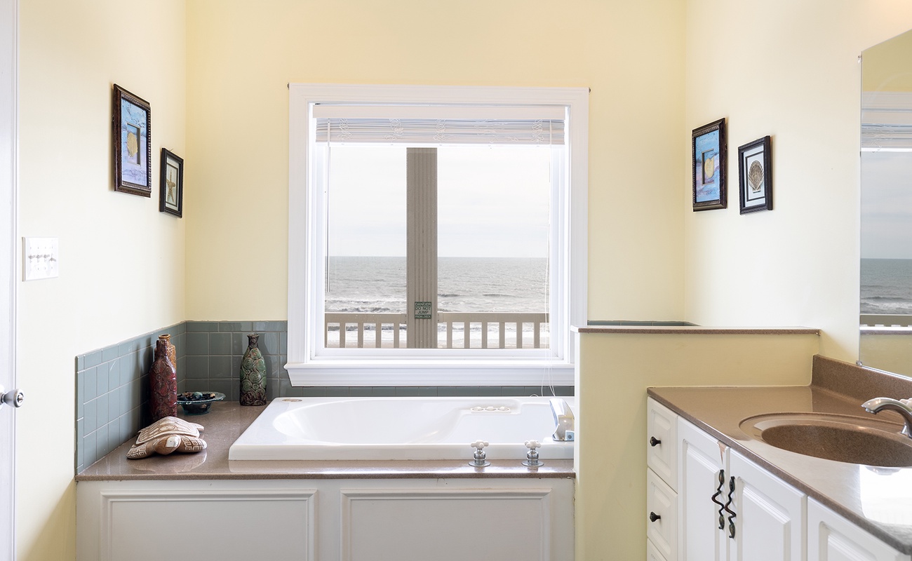 Ground Floor: Yellow Bedroom with 2 Doubles, Full Bath, Oceanfront Pink Bedroom with Queen and Full Bath, Game Room, Pool, Kitchenette