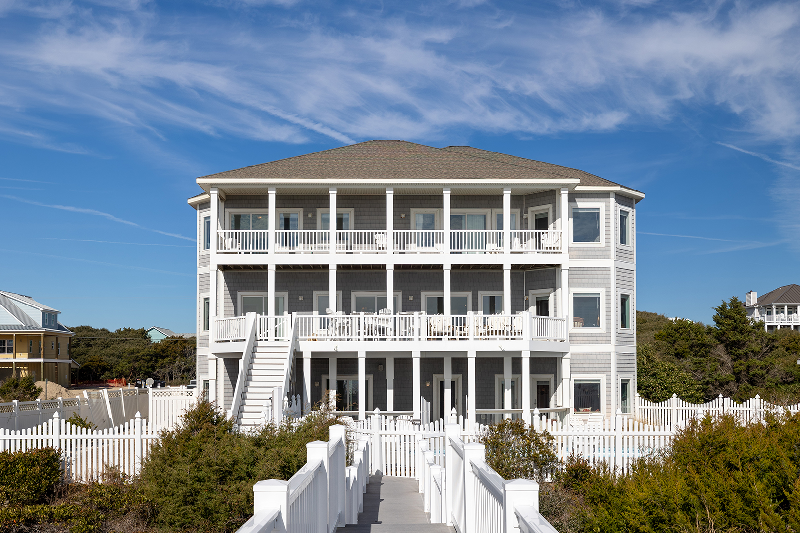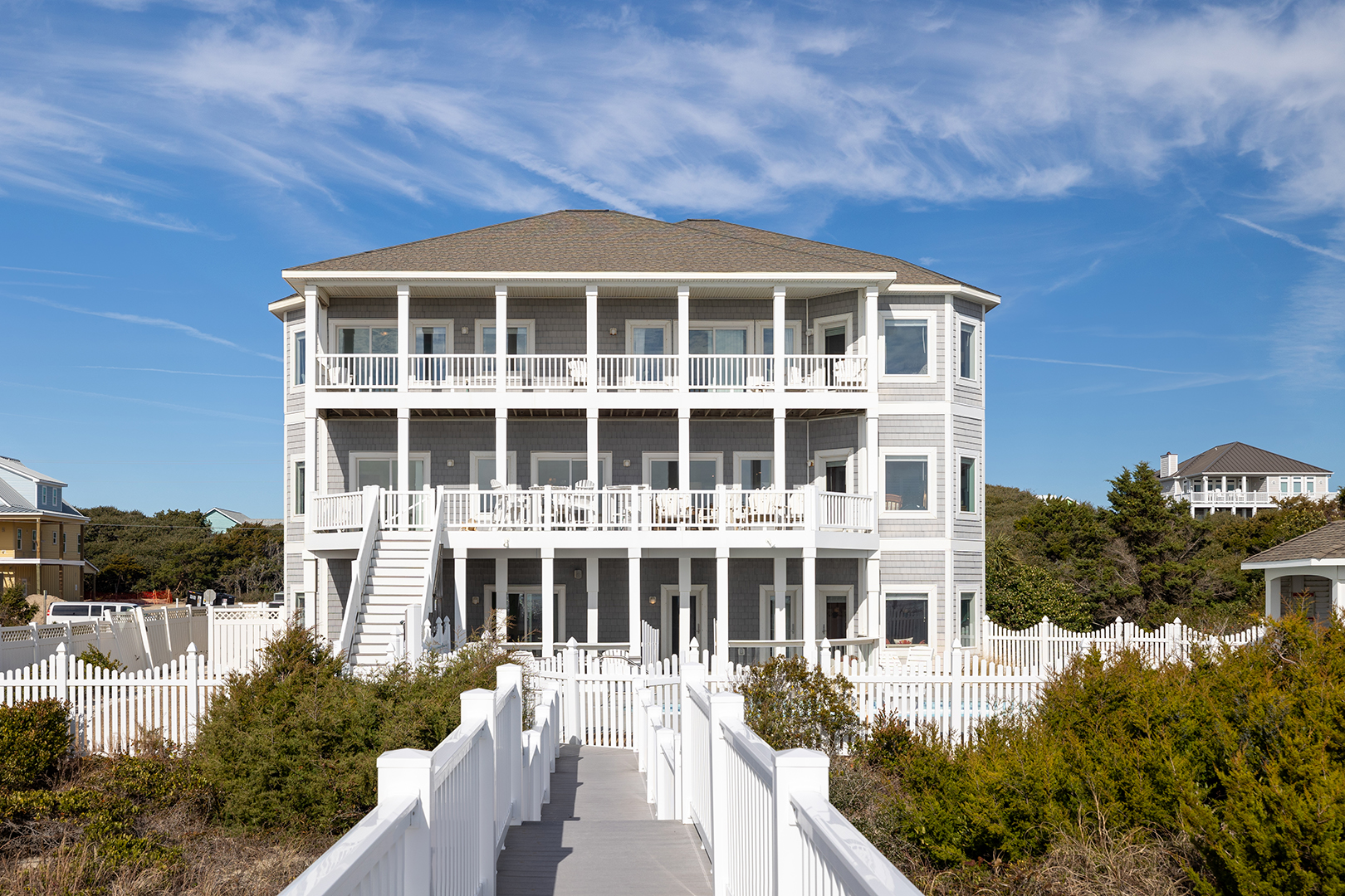 Amenities include: Elevator; Wireless High Speed Internet, 10 Smart TVs; Fully Equipped Kitchen with Coffee Maker, Double Oven, 2 Refrigerators, Microwave, 2 Dishwashers, Kitchenette, Wine Refrigerator; Rec/Game Room, Pool Table, Card/Poker Table, Wet Bar; 3 Whirlpool Tub/Jacuzzi Baths; Ceiling Fans, 2 Interior Washer/Dryers; Covered Decks, Outdoor Decks, Deck Furniture, Picnic Tables; Enclosed Hot/Cold Outdoor Shower, Gas Grill; Saltwater Pool that can be heated for an additional $650/week + tax; if the temperature is below 55 degrees, the pool heat pump will not work, Hot Tub, Private Beach Walkway.