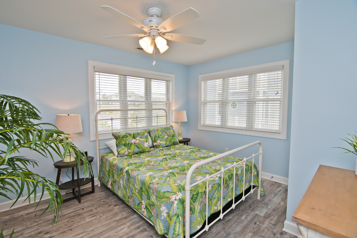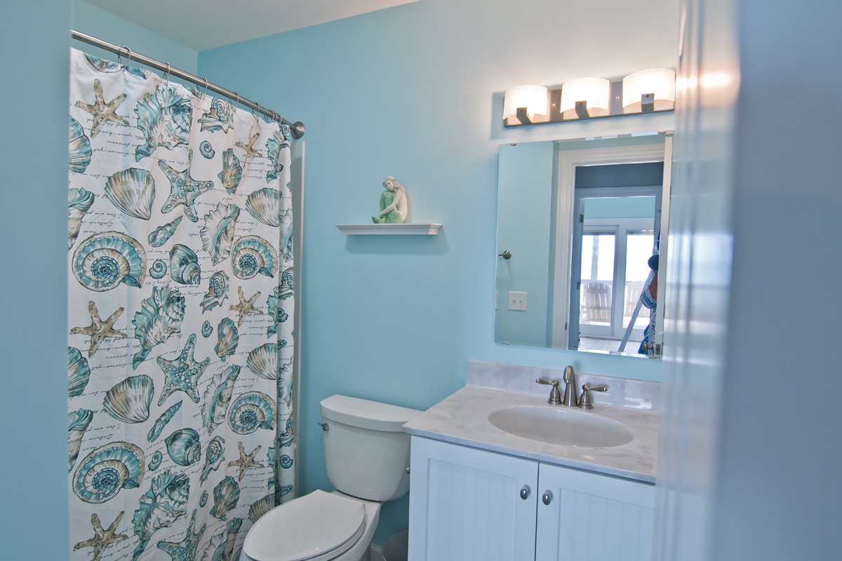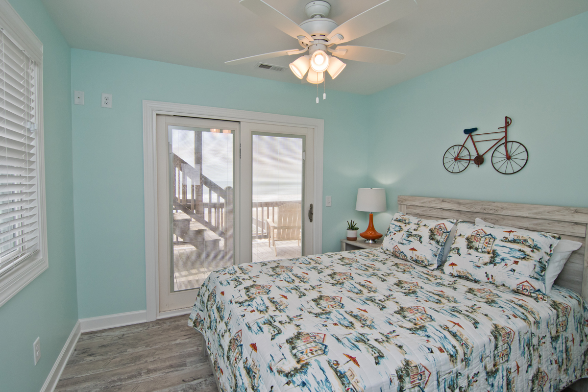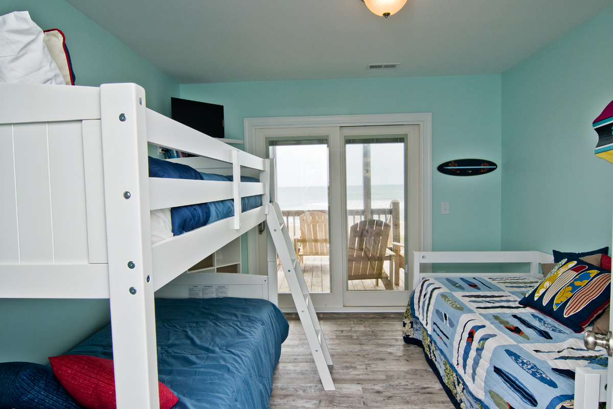 Level One: Oceanfront Bedroom #1 has a Queen bed with accompanying dresser and night stand, Oceanfront Bedroom #2 has a Set of Twin Bunk Beds, and a single Twin Bed with trundle, TV, cable box, DVD Player and access to shared bath. Bedroom #3 has a Queen Bed and a private Bath.