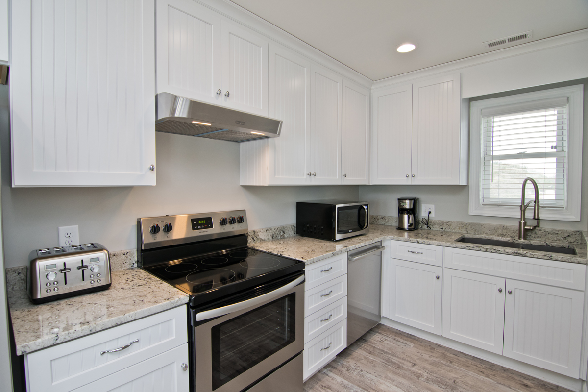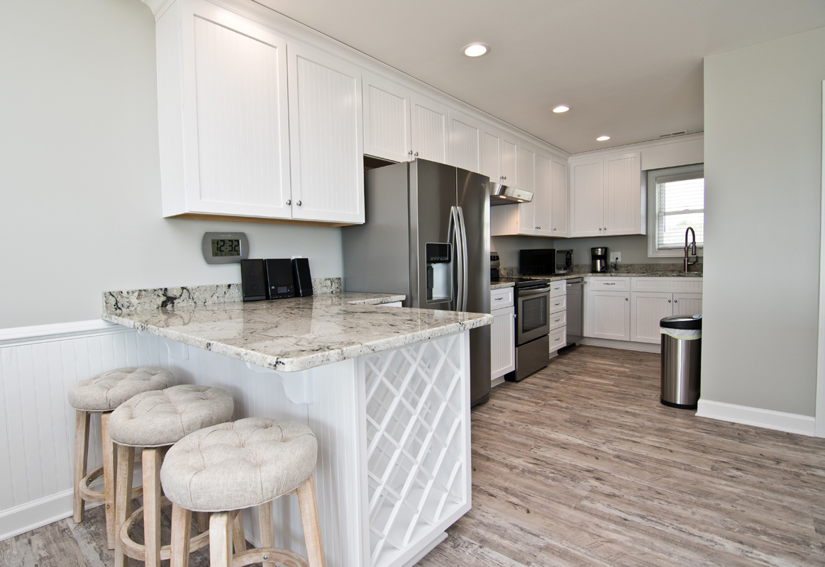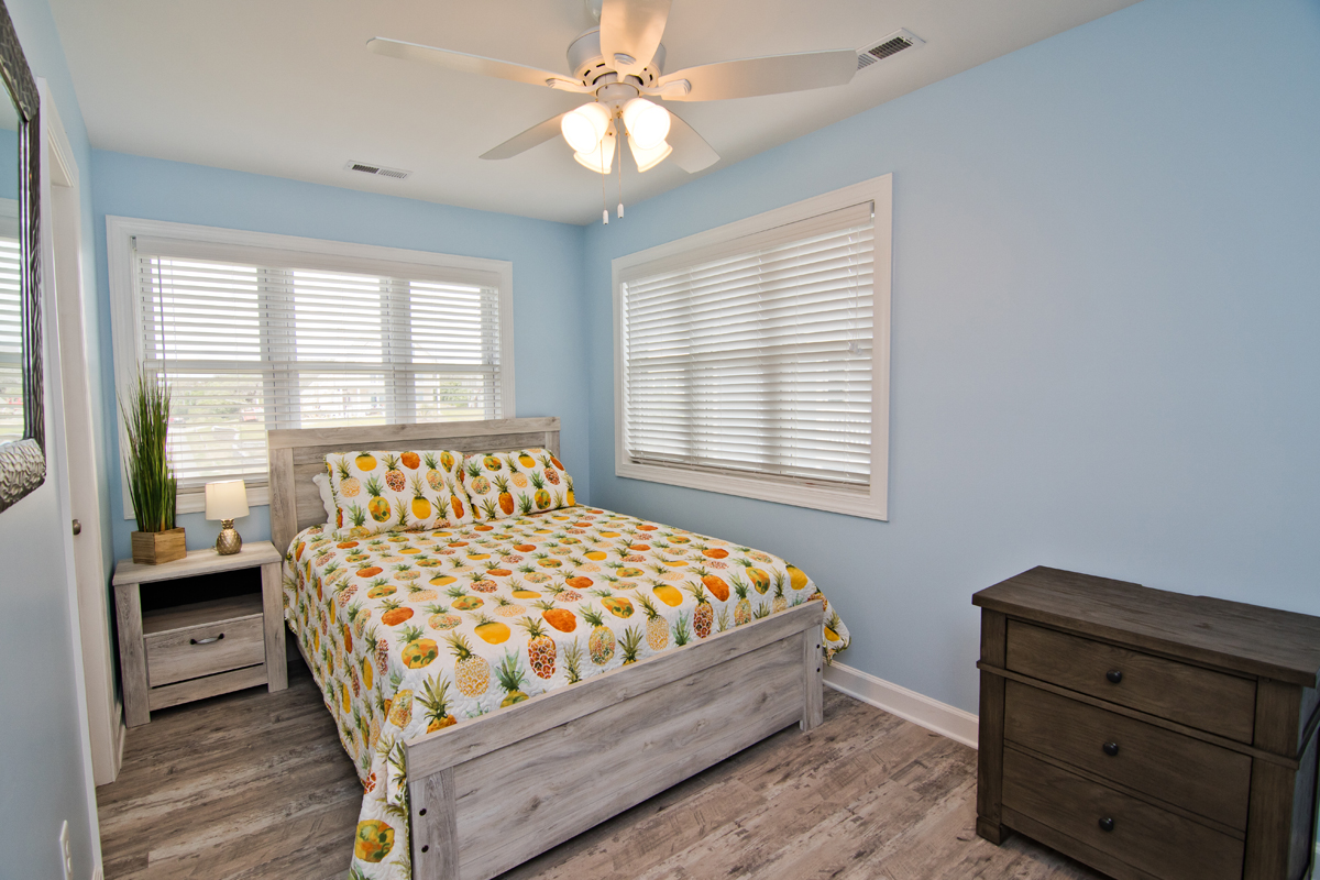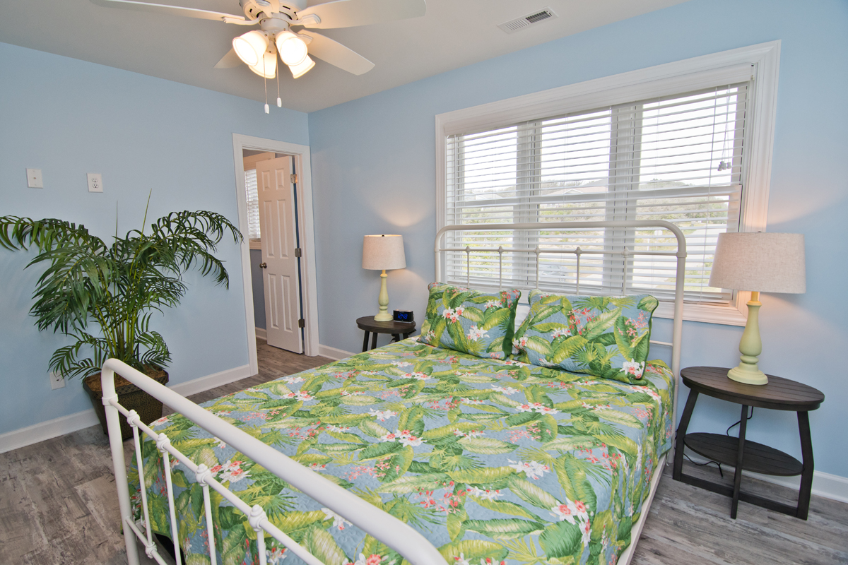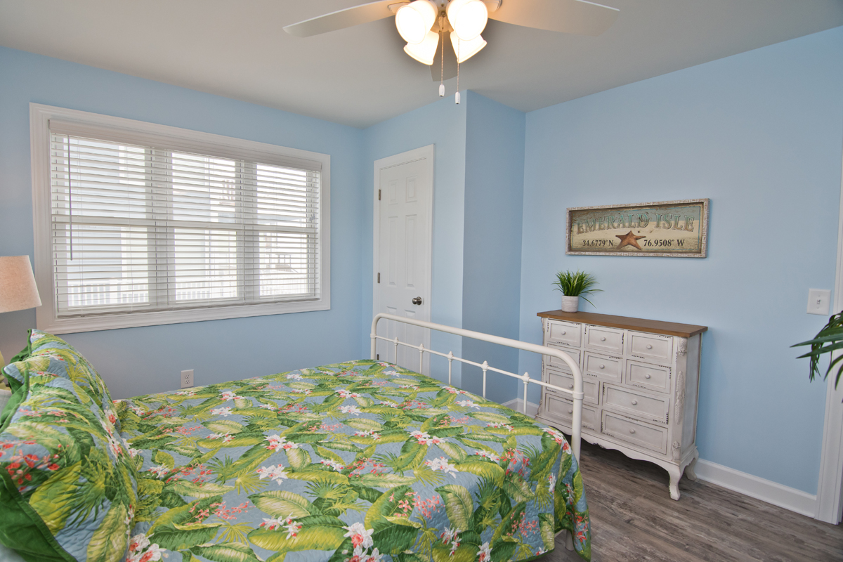 Level One: Oceanfront Bedroom #1 has a Queen bed with accompanying dresser and night stand, Oceanfront Bedroom #2 has a Set of Twin Bunk Beds, and a single Twin Bed with trundle, TV, cable box, DVD Player and access to shared bath. Bedroom #3 has a Queen Bed and a private Bath.