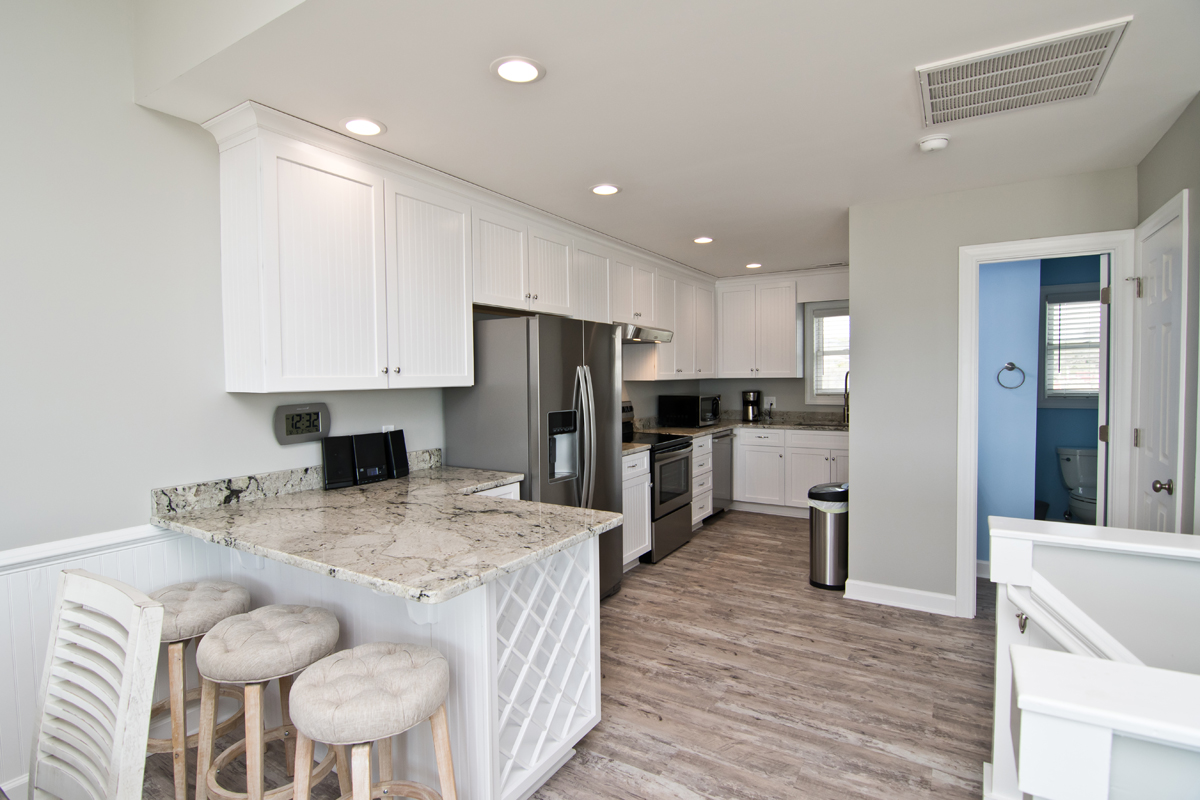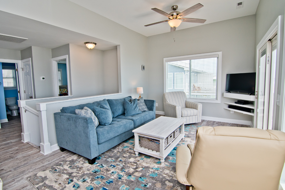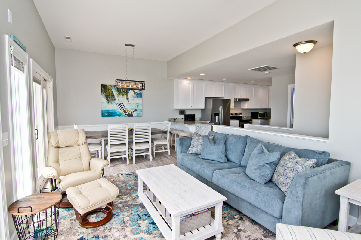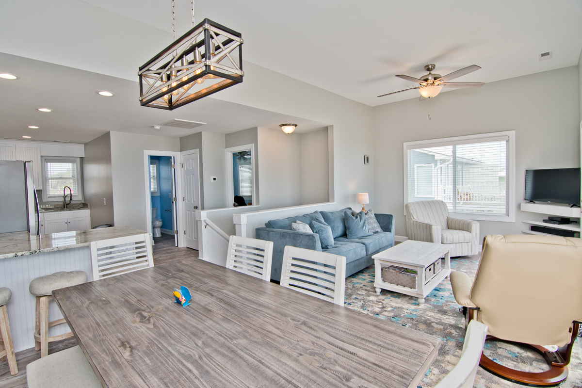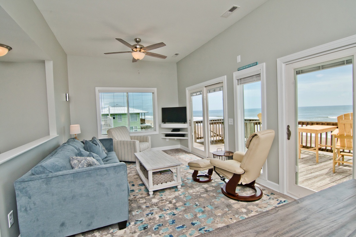Level Two: Oceanfront Living and Dining Area with open deck. Living Area. 40" HDTV Smart TV, DVD Player, and Vizio Sound Bar. Bluetooth/CD Mini Stereo System. Kitchen Area has an island bar and additional seating. The Kitchen has state of the art stainless steel appliances, and includes microwave, coffee maker, blender, toaster, dishwasher, and anything else needed to prepare a family meal! Level Two also houses Bedroom #4 with a Queen Bed, 32" TV, cable box, DVD player, and access to a shared bath.