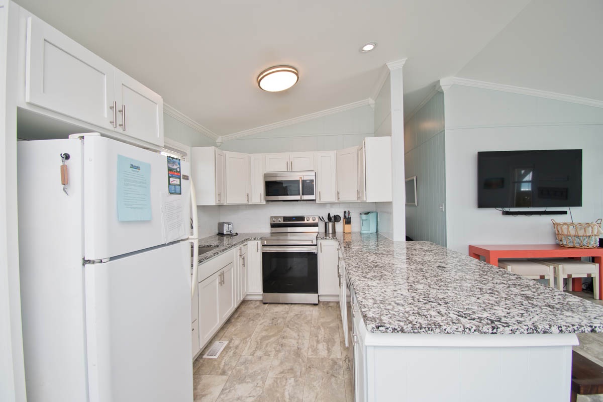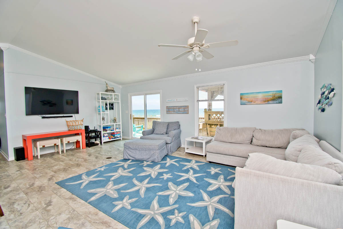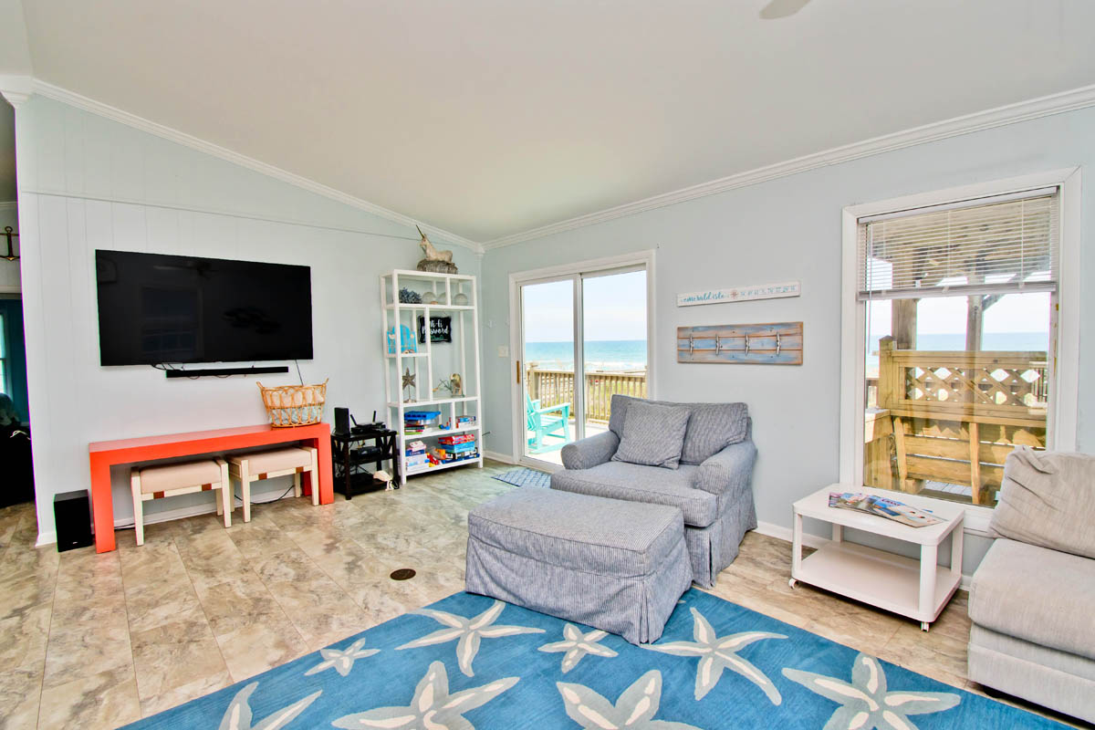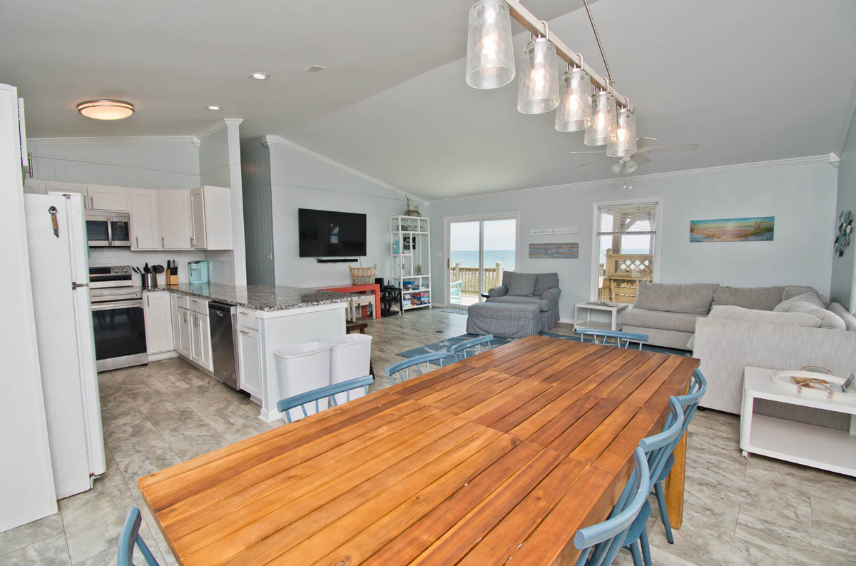 Level One: Large Living Area with Flat Screen TV has sliding glass doors that open out to the Oceanfront Deck. Dining Area. Galley Kitchen has a Dishwasher and a Microwave.