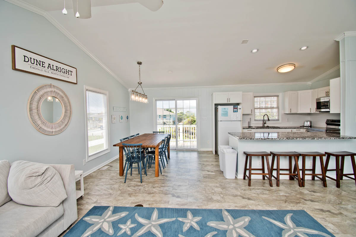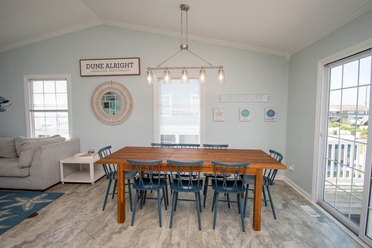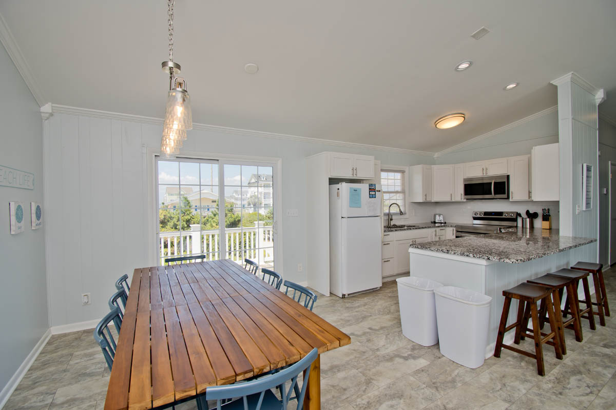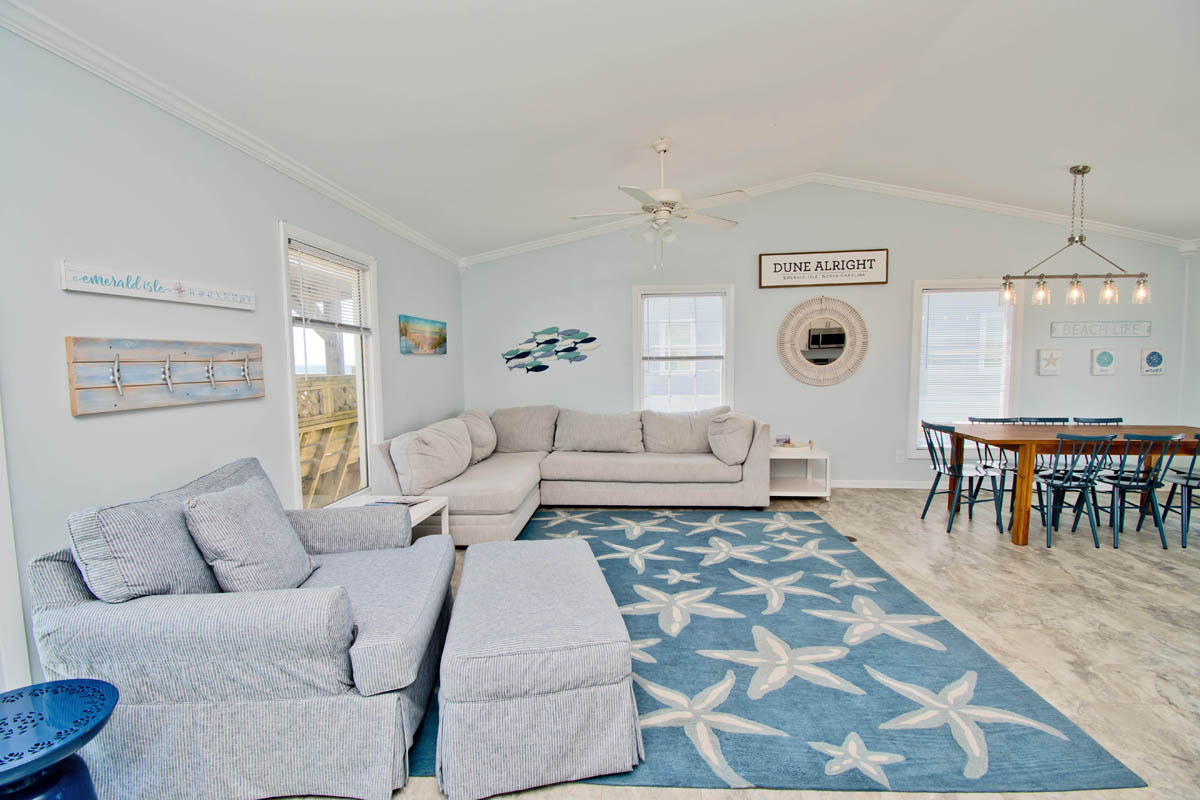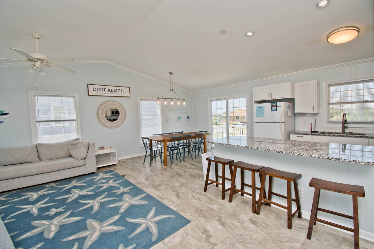 Level One: Large Living Area with Flat Screen TV has sliding glass doors that open out to the Oceanfront Deck. Dining Area. Galley Kitchen has a Dishwasher and a Microwave.