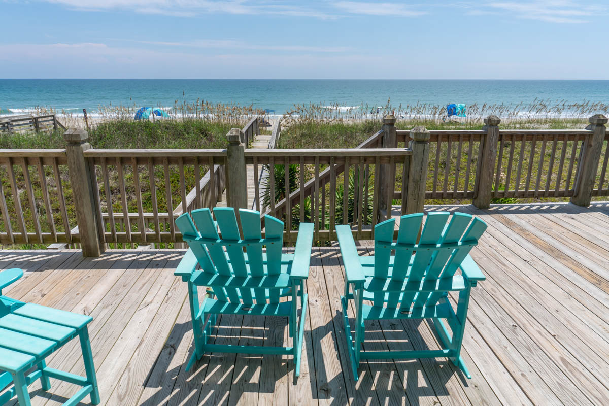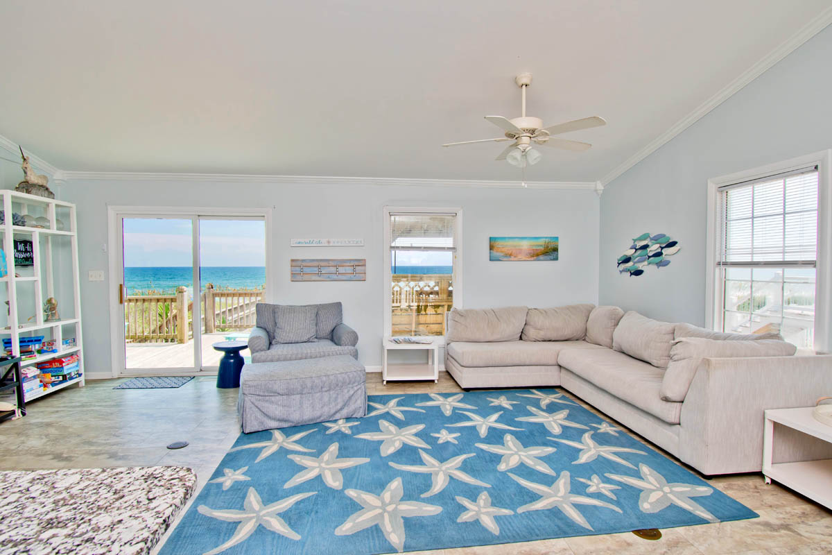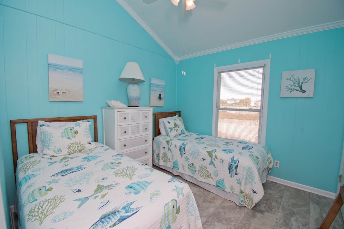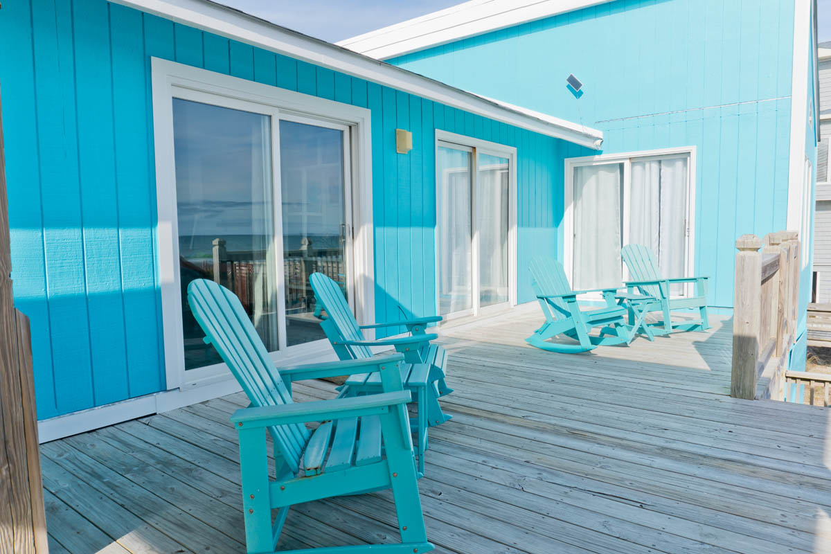 Oceanfront Bedroom #1 has a King Bed, Open Deck and shared Bath with Bedroom #2. Oceanfront Bedroom #2 has Queen Bed, Open Deck and shared Bath with Bedroom #1. Bedroom #3 has 2 Twin Beds and shared Bath with Bedroom #4. Bedroom #4 has 2 Twin Bunks and shared Bath with Bedroom #3. Garage.