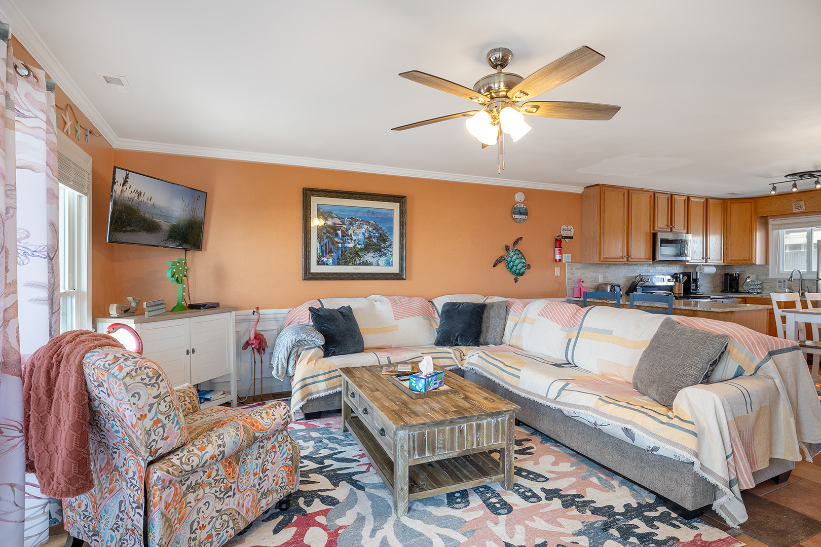 Level One: Large open Living Area with Sectional Sofa, Dining Area with seating for 4 and Bar seating for 2, Kitchen Area with Microwave and Dishwasher. There is a half-bath on this Level and a Cold-Only Outdoor Shower.