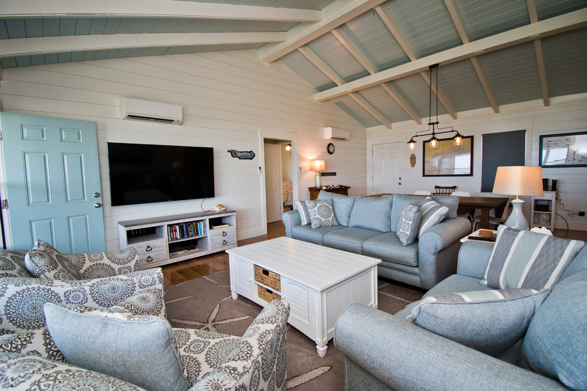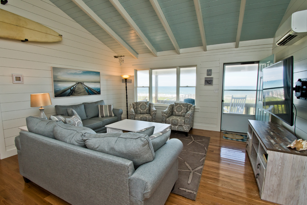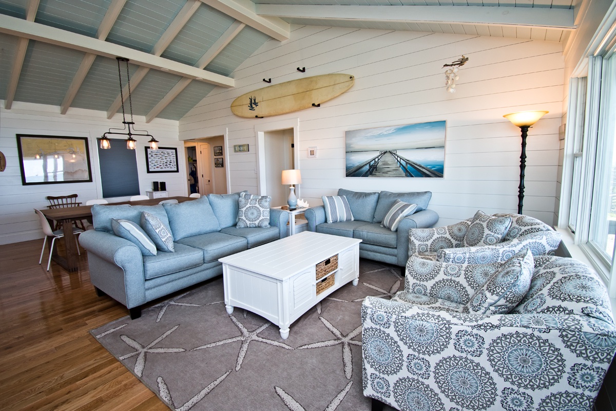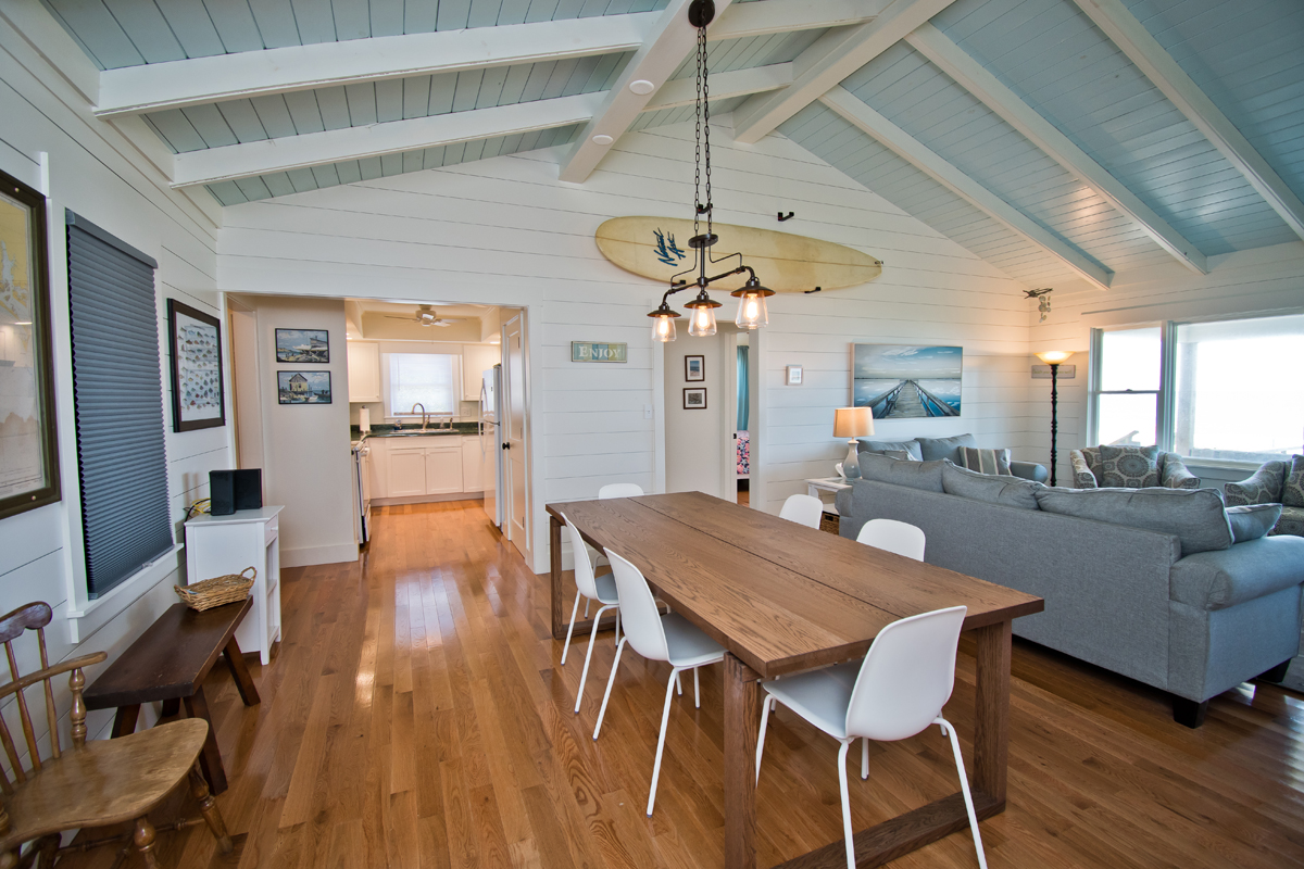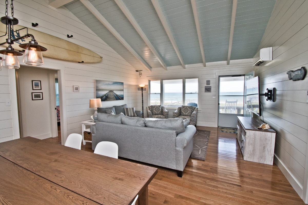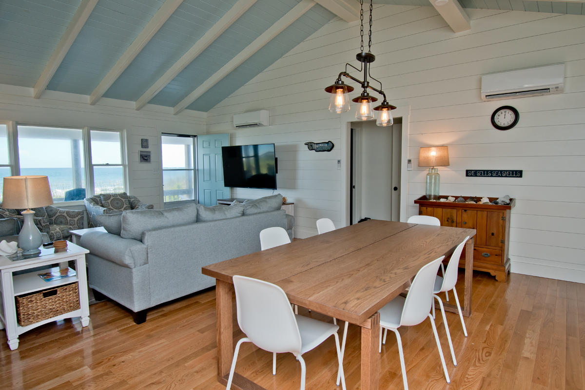 Hide 'N Sea is a 4 Bedroom, 2 Bath oceanfront home. Newly Renovated! High Speed Wireless Internet Provided! Living Room with Flat Screen TV and access to the covered decks. Dining Area. Kitchen Area with microwave, refrigerator, dishwasher, slow cooker and coffee maker.