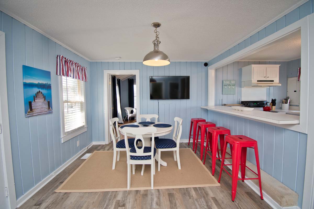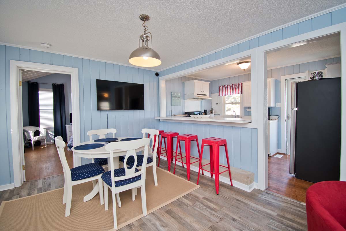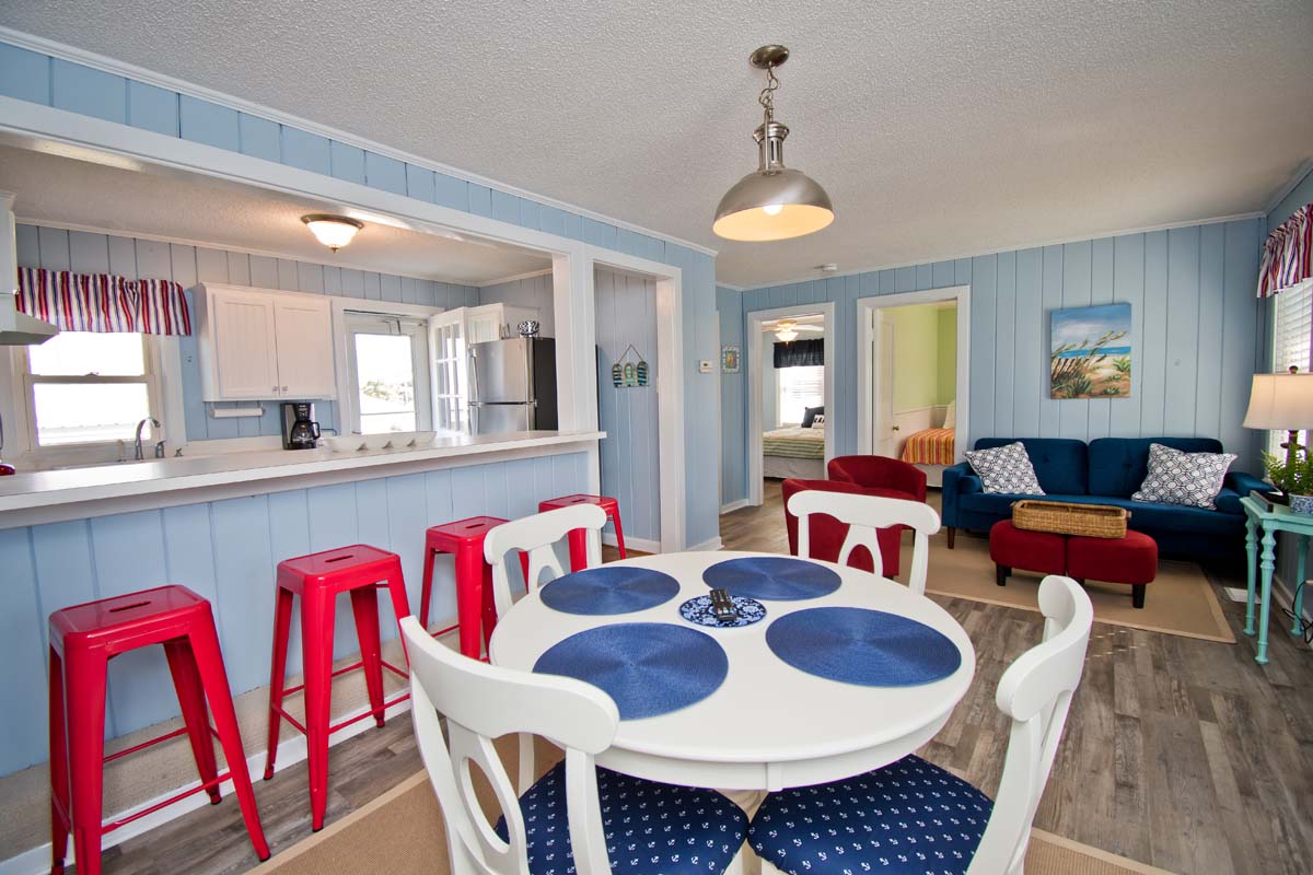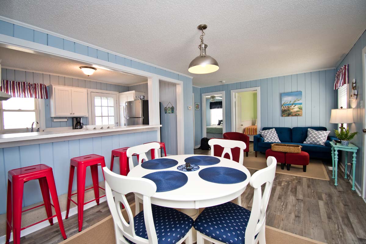 You will notice a theme of nautical decor throughout the house that is sure to make you feel right at home during your week at the beach. Bedroom #1 is a master bedroom with a king bed, a TV, and a private bathroom. Bedroom #2 has a queen bed, a TV, and access to a shared bathroom. Bedroom #3 has two twin beds, a TV, and shares a bathroom with bedroom #2. The dining table seats four comfortably and there are four more seats right next to it at the bar!