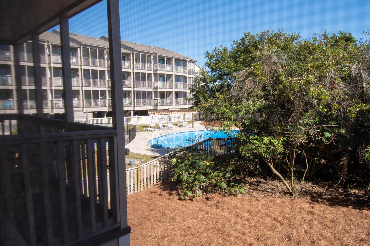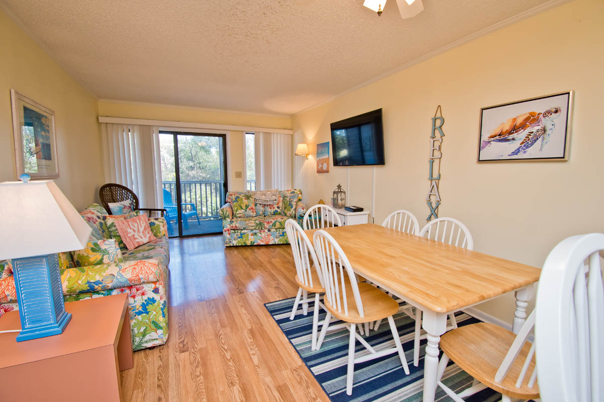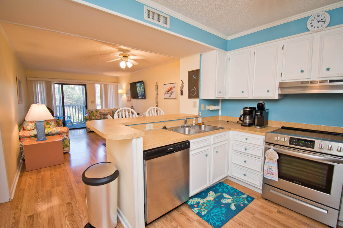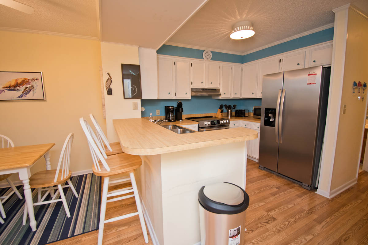 This condo is on the first floor with a great kitchen that provides plenty of room, also with dining area and living area. Sliding doors open to private screened in balcony where you can relax with a view of dunes.