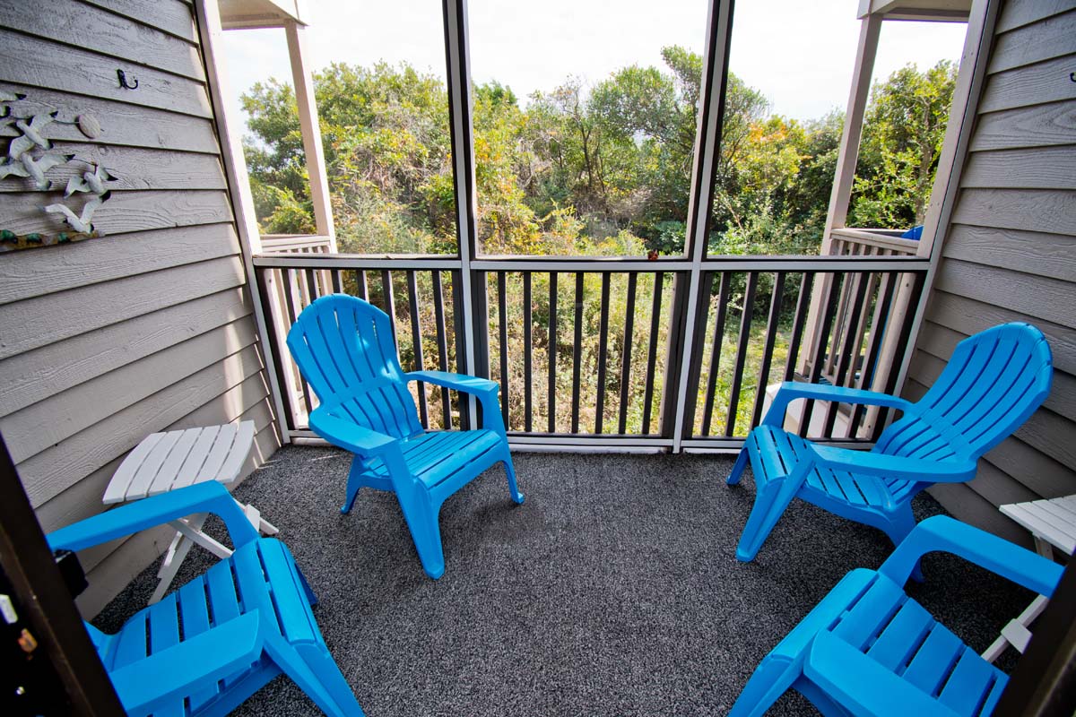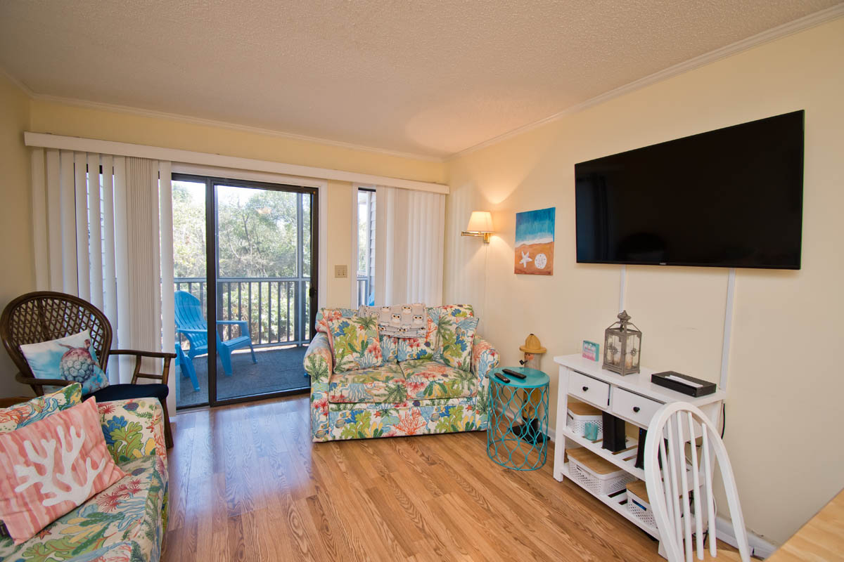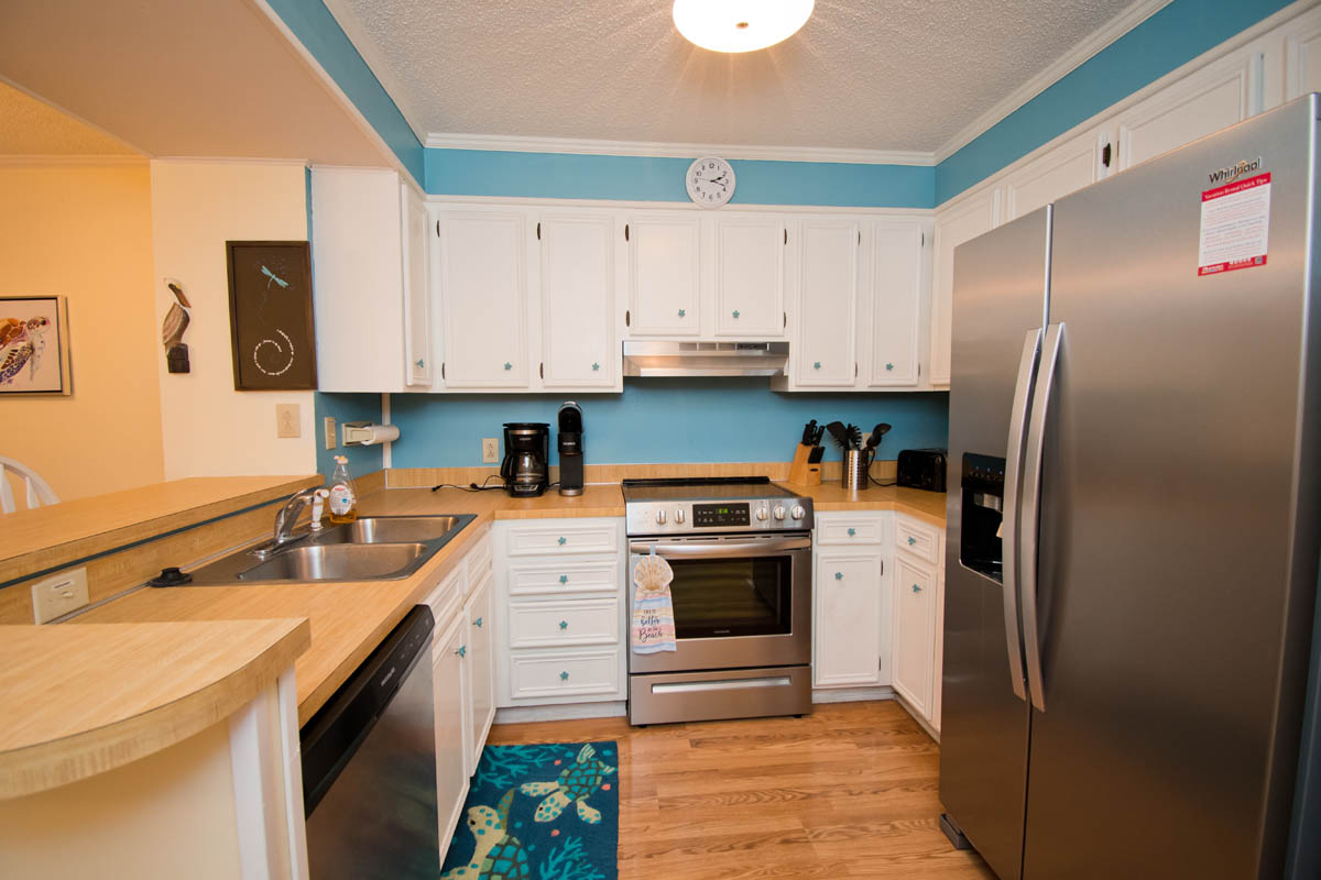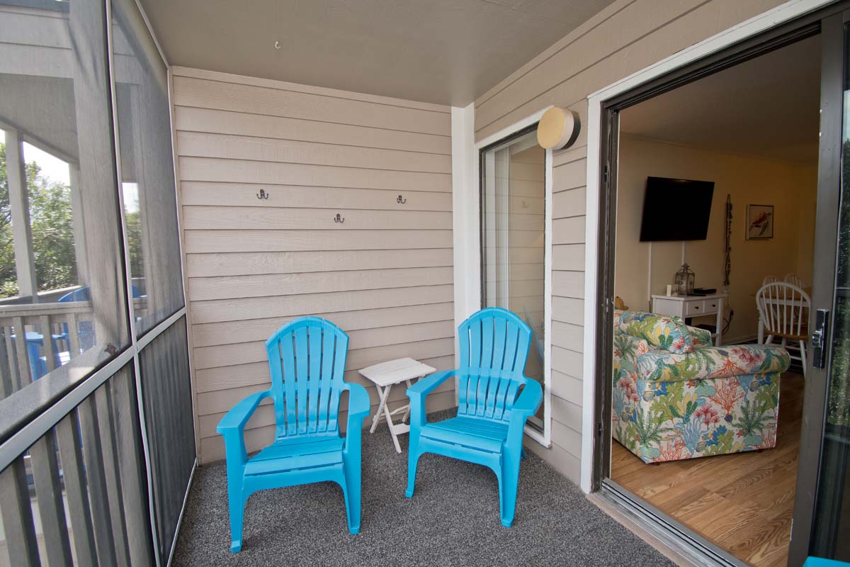 This condo is on the first floor with a great kitchen that provides plenty of room, also with dining area and living area. Sliding doors open to private screened in balcony where you can relax with a view of dunes.