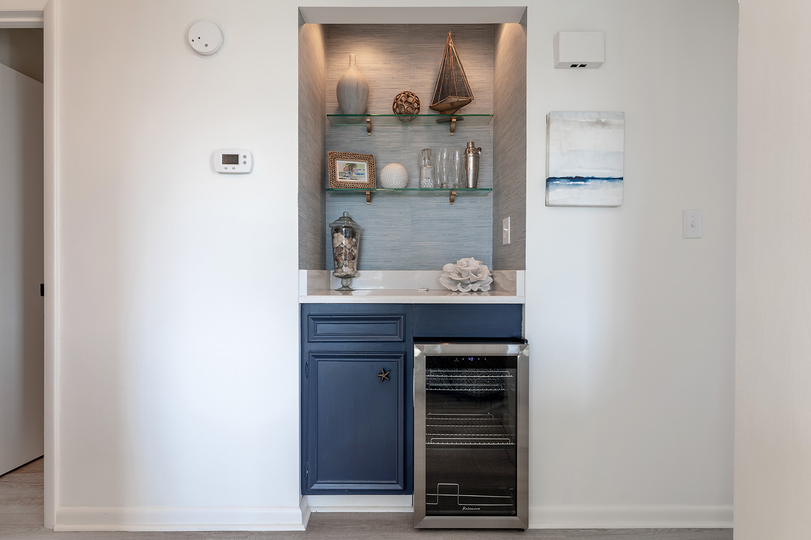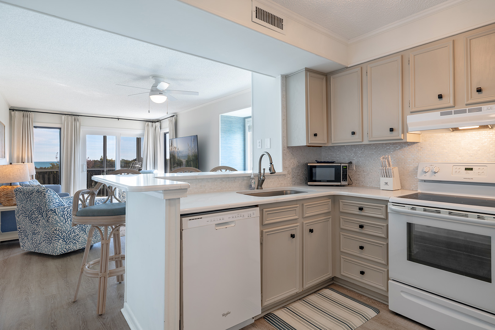 The bright and airy living room features a smart TV and opens directly to a private oceanfront balcony ideal for morning coffee or sunset relaxation. The fully equipped kitchen has everything you need to prepare meals at home, whether it’s a quick beach-day breakfast or a family dinner in.