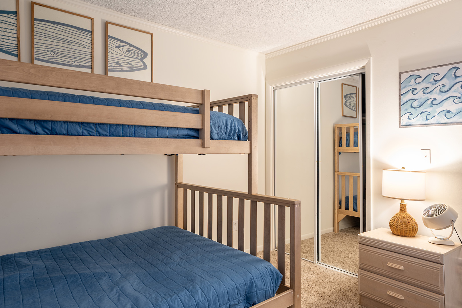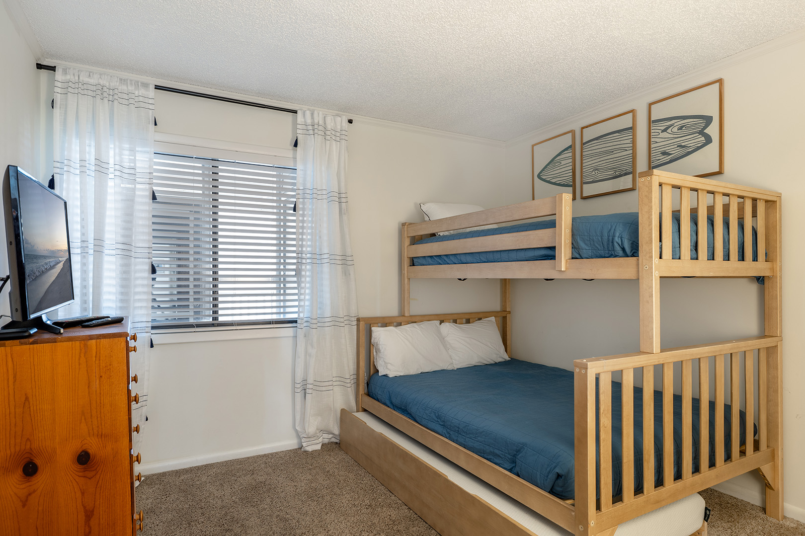The spacious primary suite boasts a king bed, smart TV, private bath, and stunning oceanfront views. The second bedroom offers a queen bed, smart TV, and its own private bath, while the third bedroom is perfect for kids or extra guests with a twin-over-double bunk bed, twin trundle, smart TV, and access to a shared hall bath.