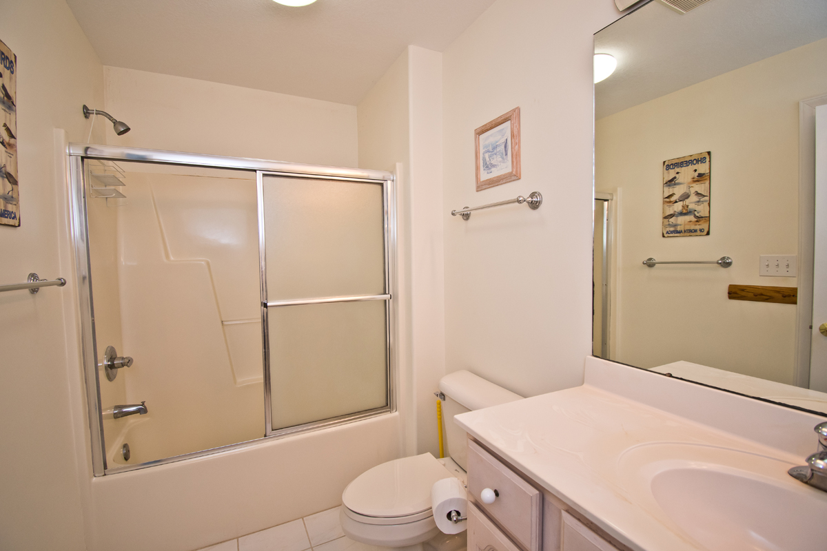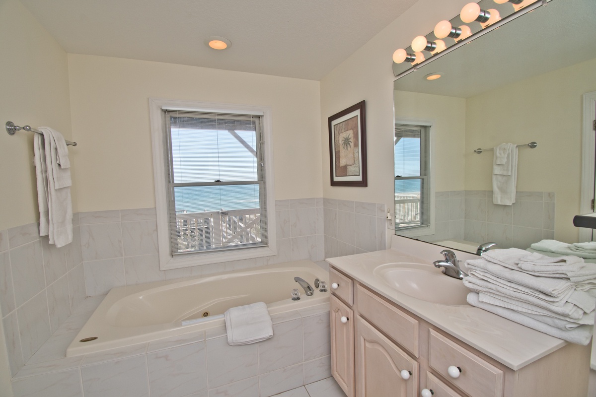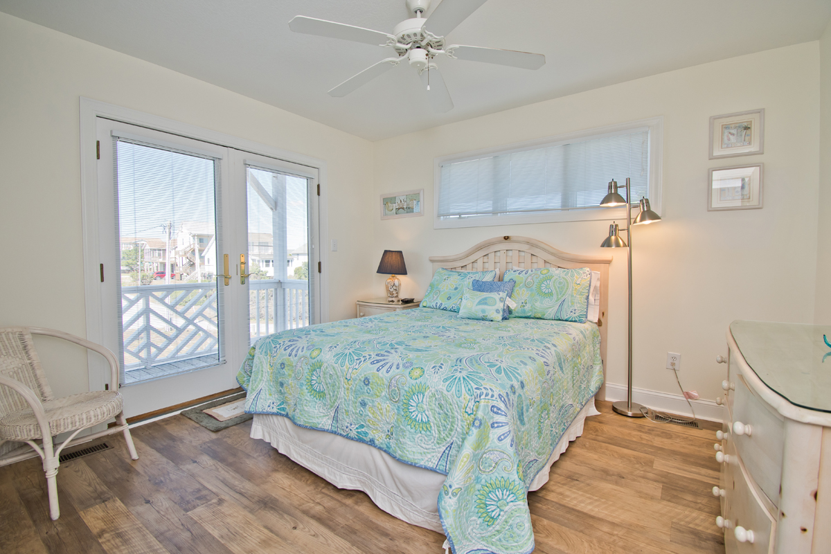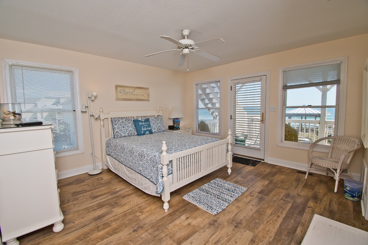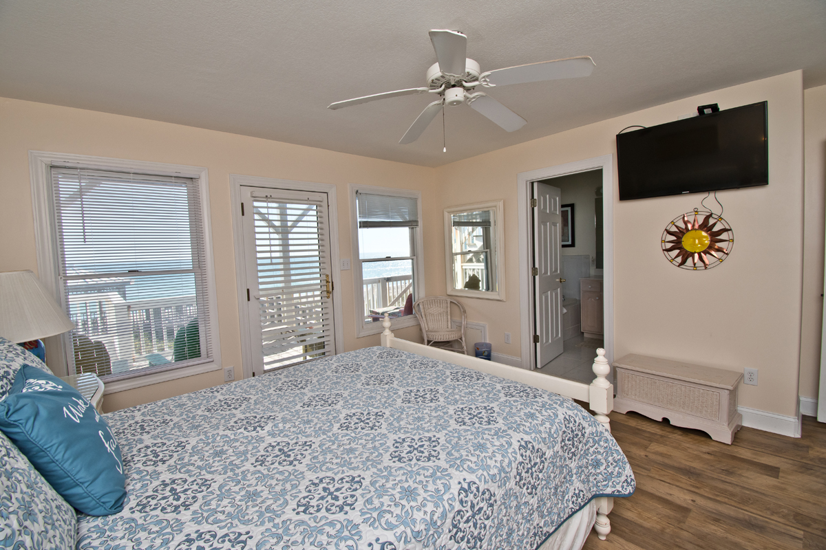 LEVEL ONE: Oceanfront Master Bedroom #1 has a queen bed, a private bathroom with a jacuzzi tub, and access to a covered oceanfront deck. Streetside Bedroom #2 has a queen bed and access to a covered deck. Streetside Bedroom #3 has a double/twin bunk bed set and a single twin bed. This room shares a bathroom with Bedroom #2.