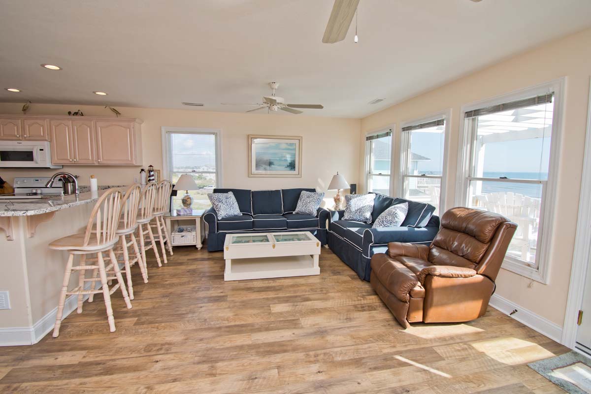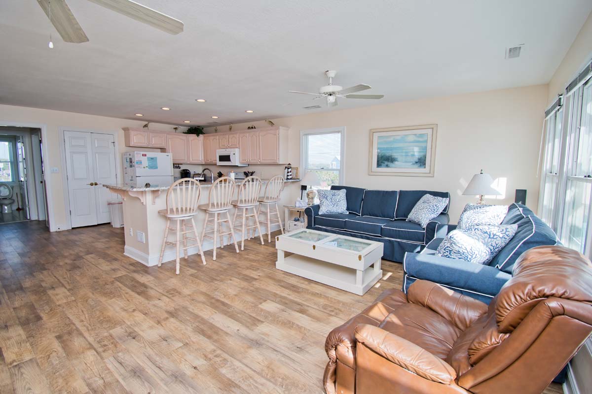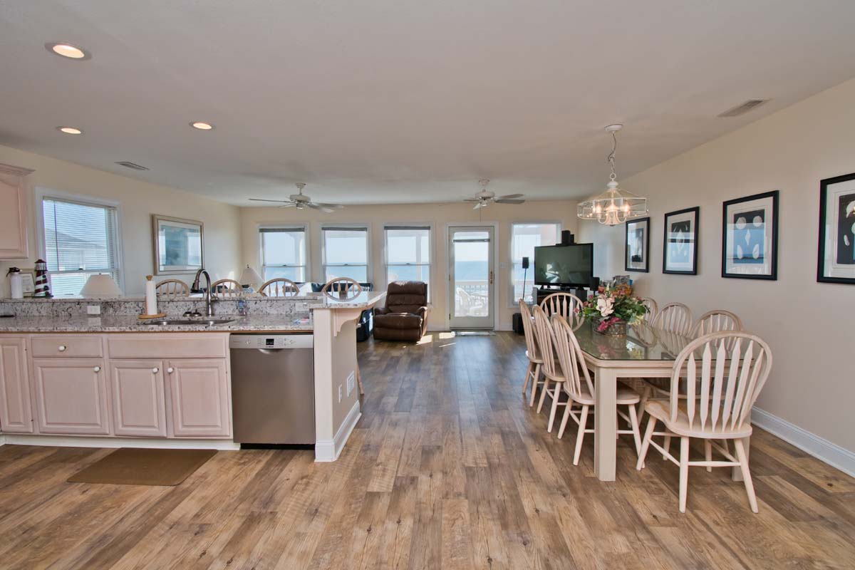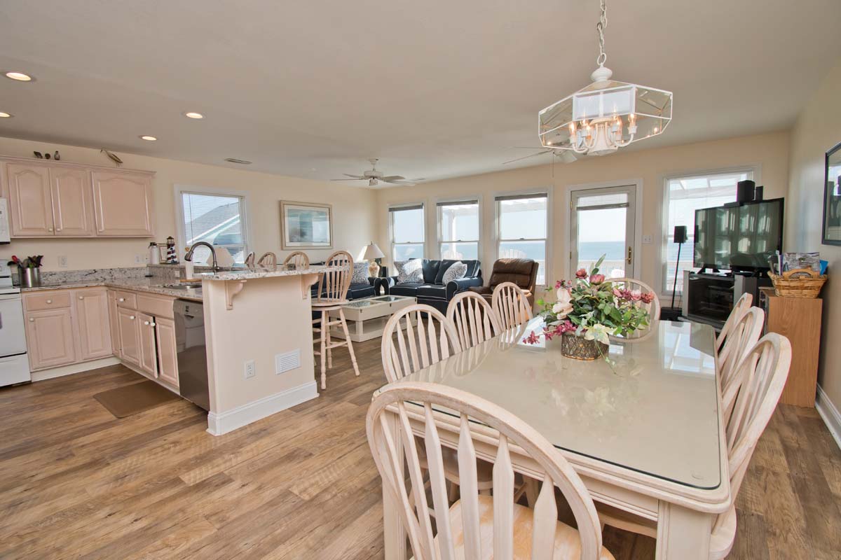 LEVEL TWO: This level of the home boasts an oceanfront living area with a large, open deck and a large-screen TV for your viewing pleasure. You will also find the dining area and fully-equipped kitchen/bar area on this level. Streetside Bedroom #4 has a queen bed and deck access with access to a full bathroom.