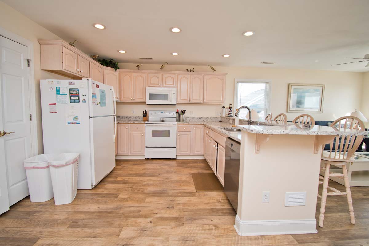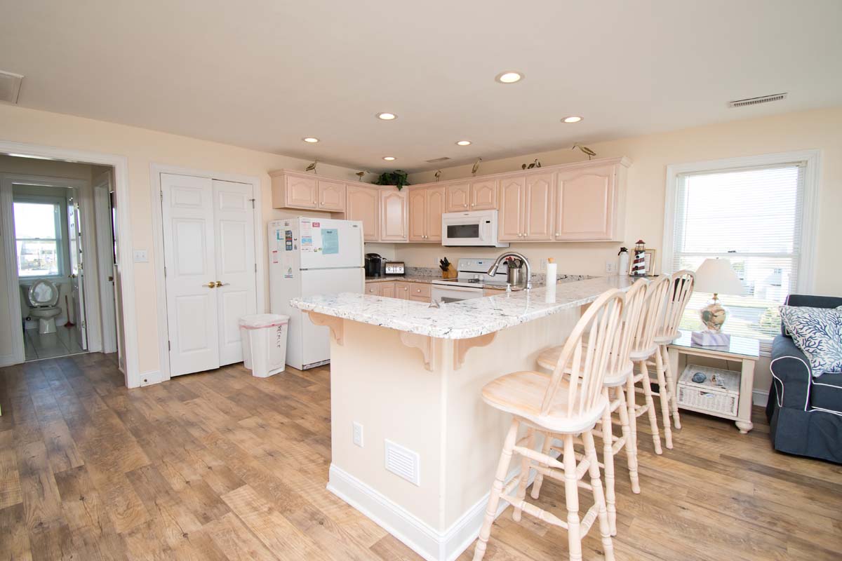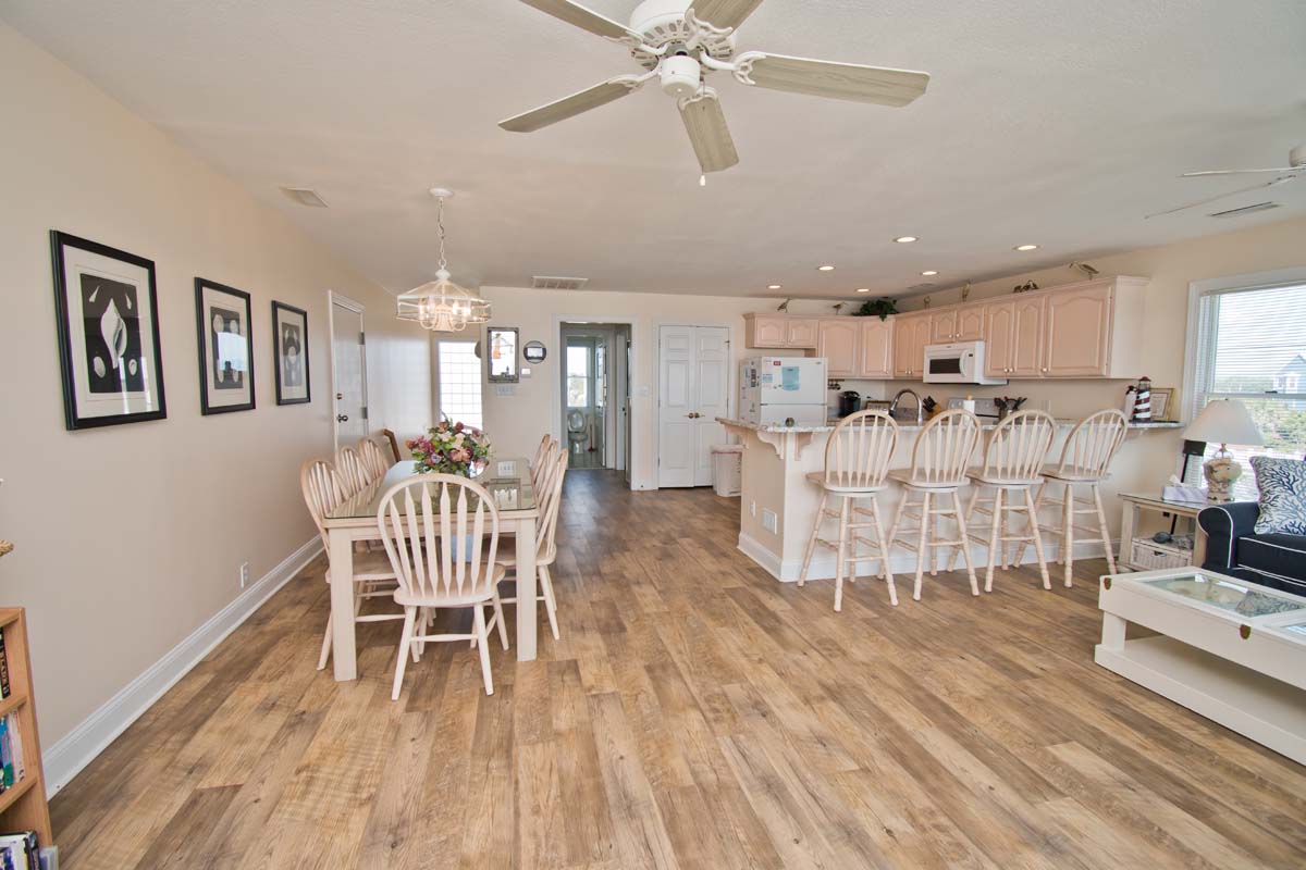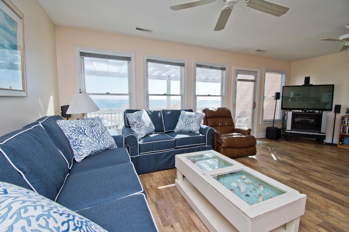 LEVEL TWO: This level of the home boasts an oceanfront living area with a large, open deck and a large-screen TV for your viewing pleasure. You will also find the dining area and fully-equipped kitchen/bar area on this level. Streetside Bedroom #4 has a queen bed and deck access with access to a full bathroom.