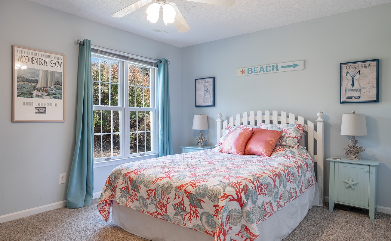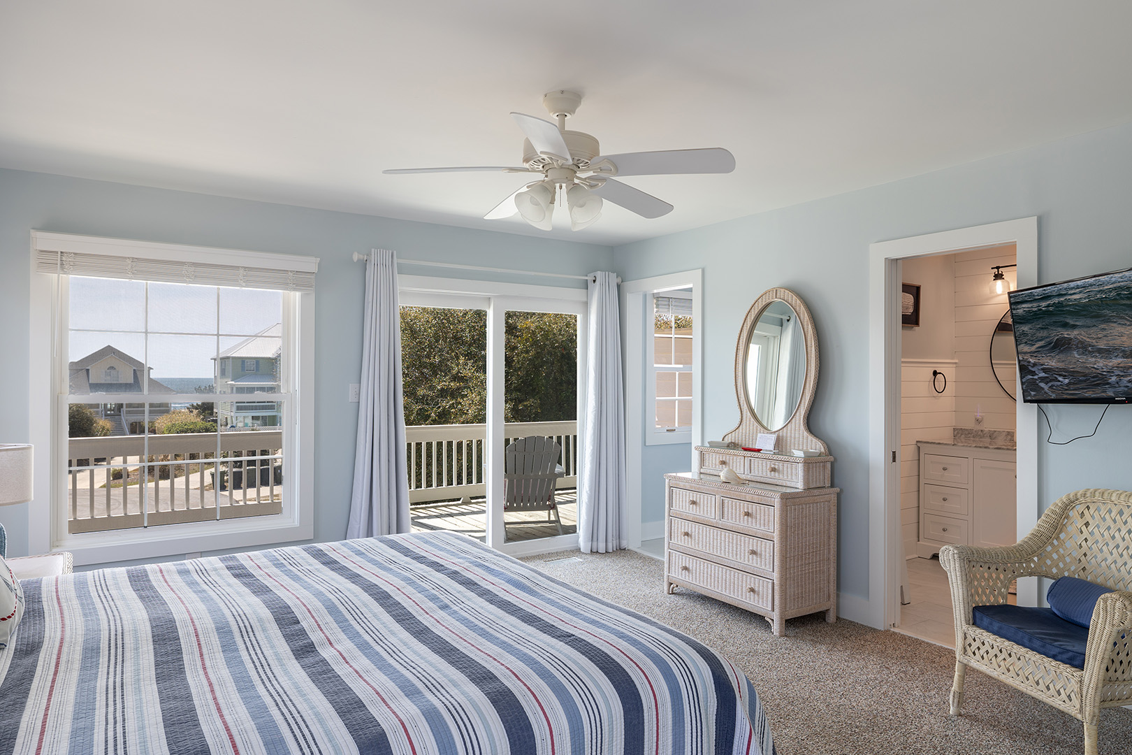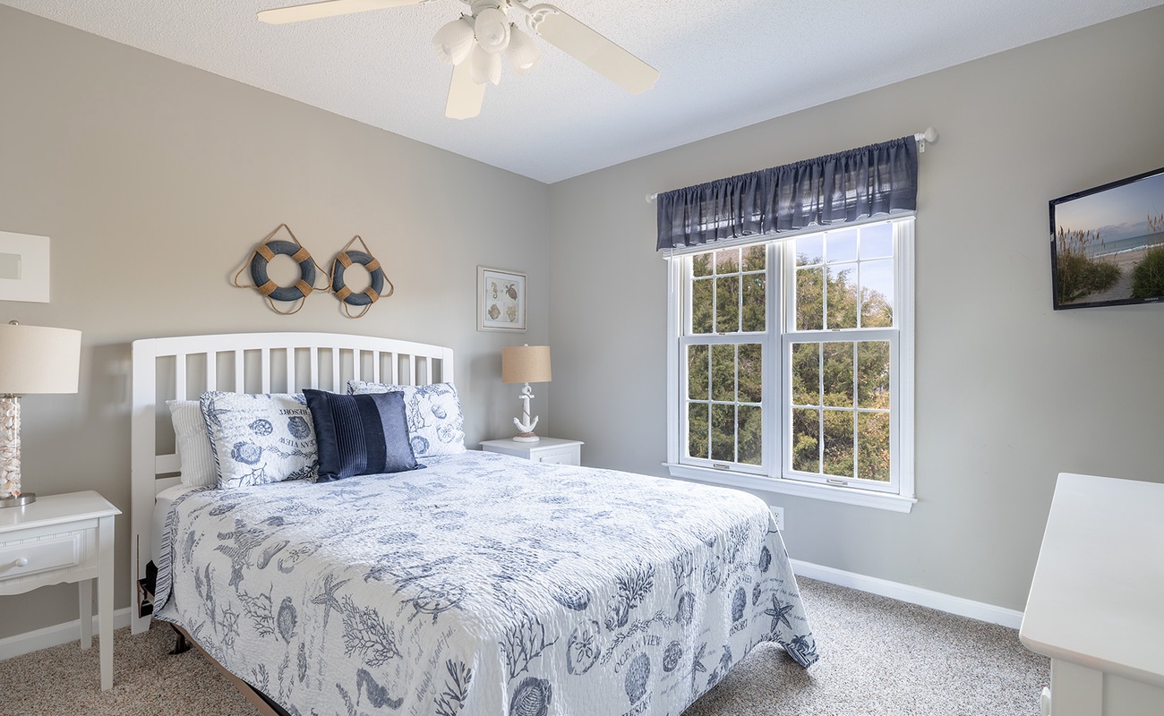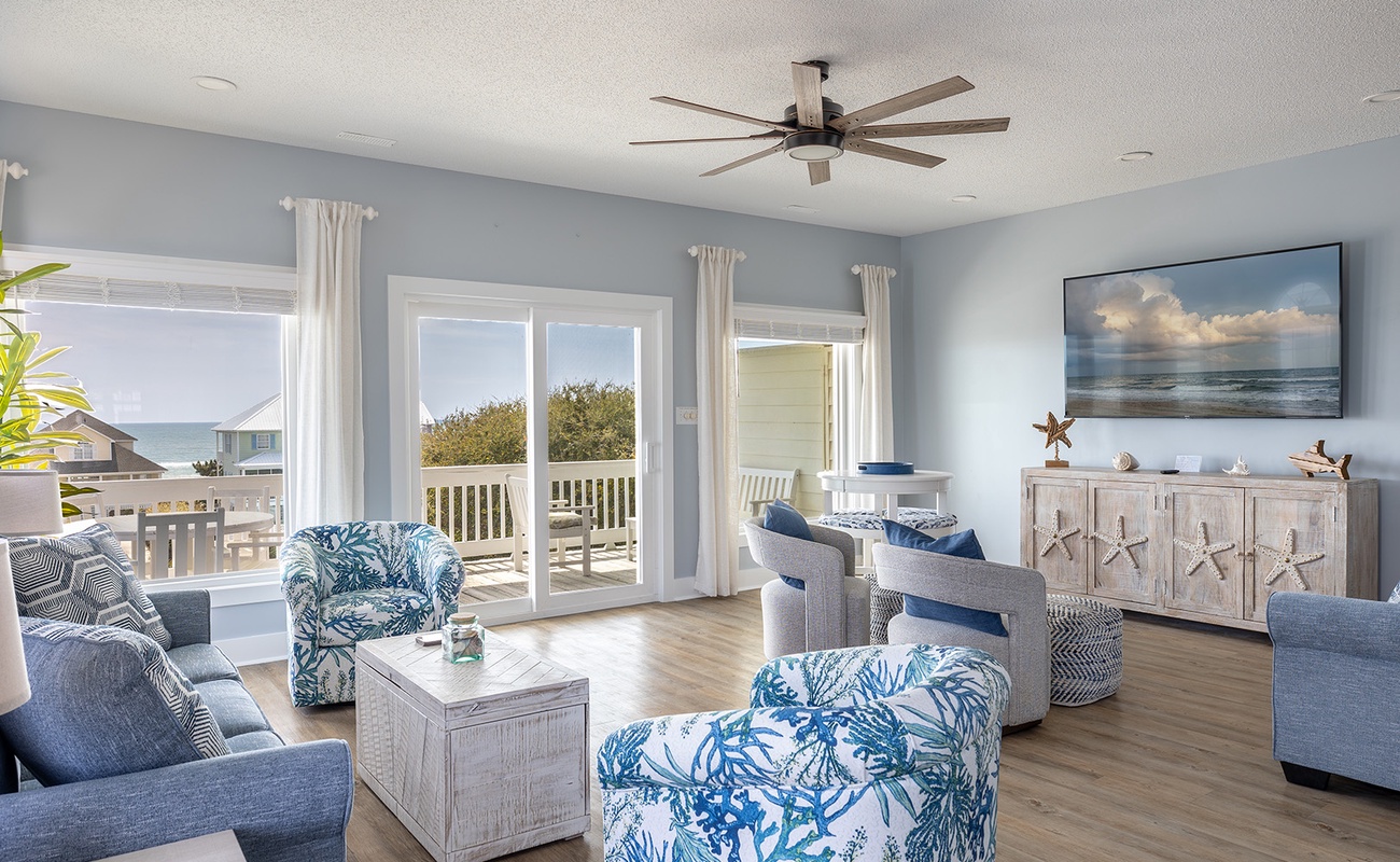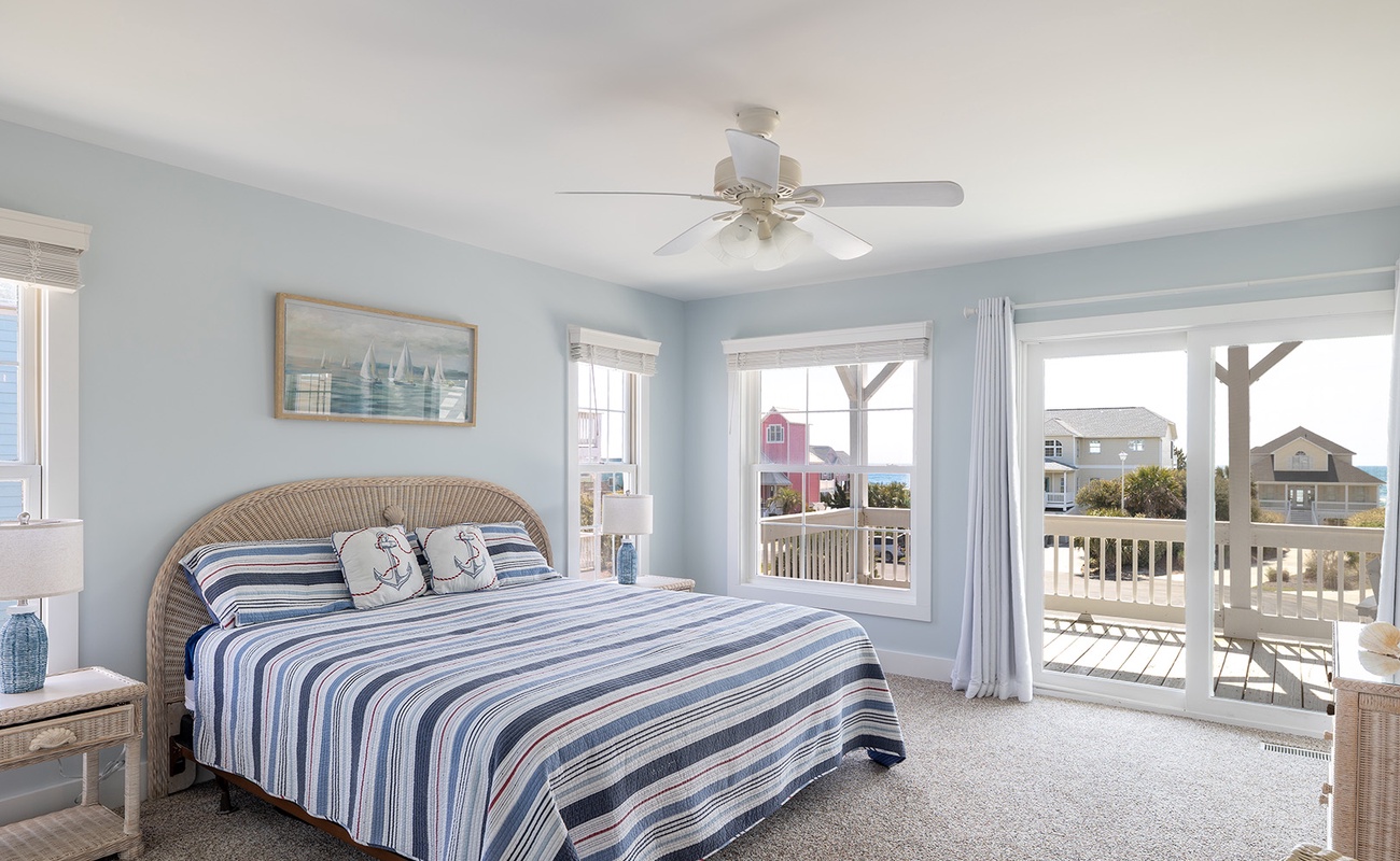 Level One: Oceanside Master Bedroom #2 with a king bed, flat-screen Smart TV, designated office space with desk and chair, and splendidly remodeled full bathroom offers stunning ocean views from your own private deck. Bedroom #3 has a queen bed, flat-screen Smart TV, and access to the charmingly updated shared full bathroom this level. Bedroom #4 has two twin beds and access to the shared bathroom.