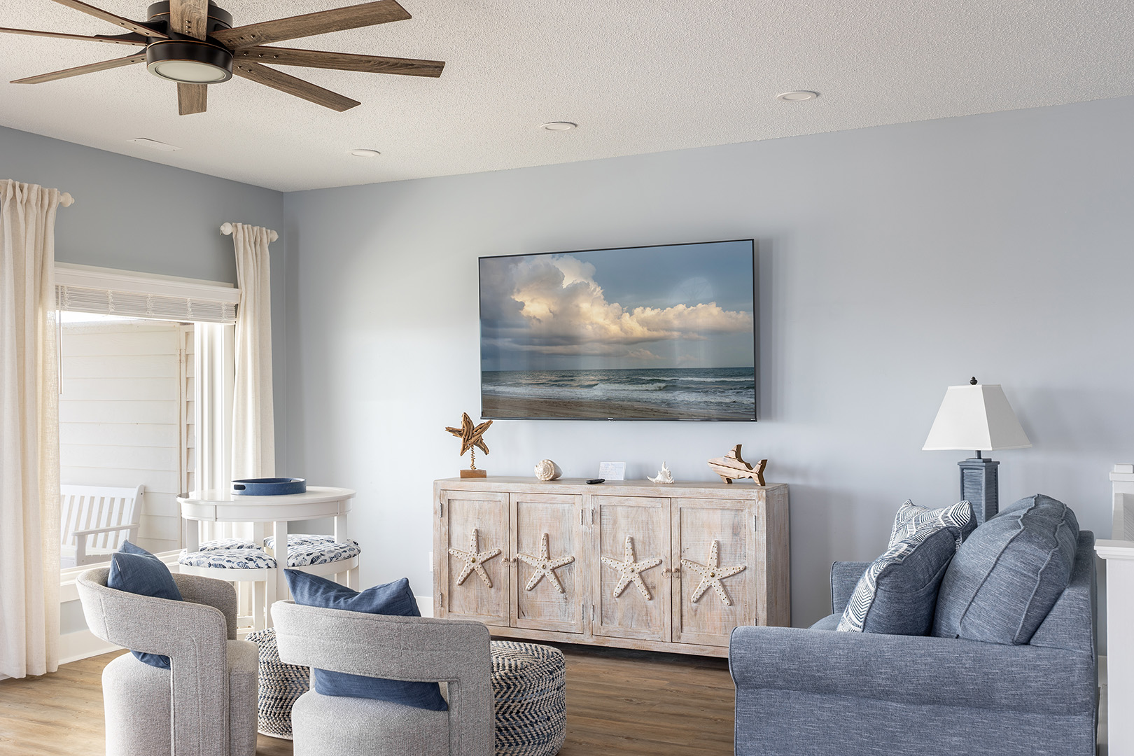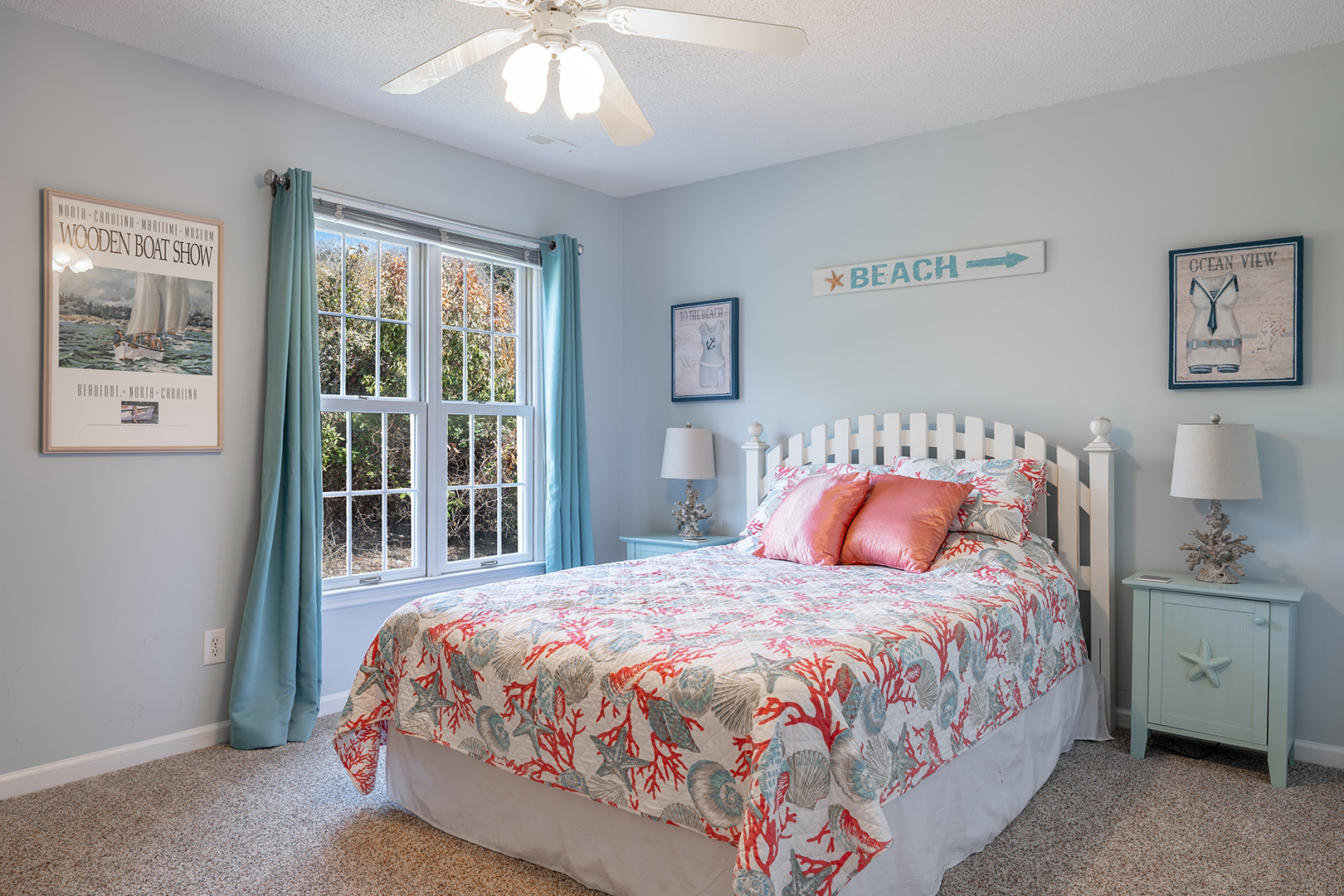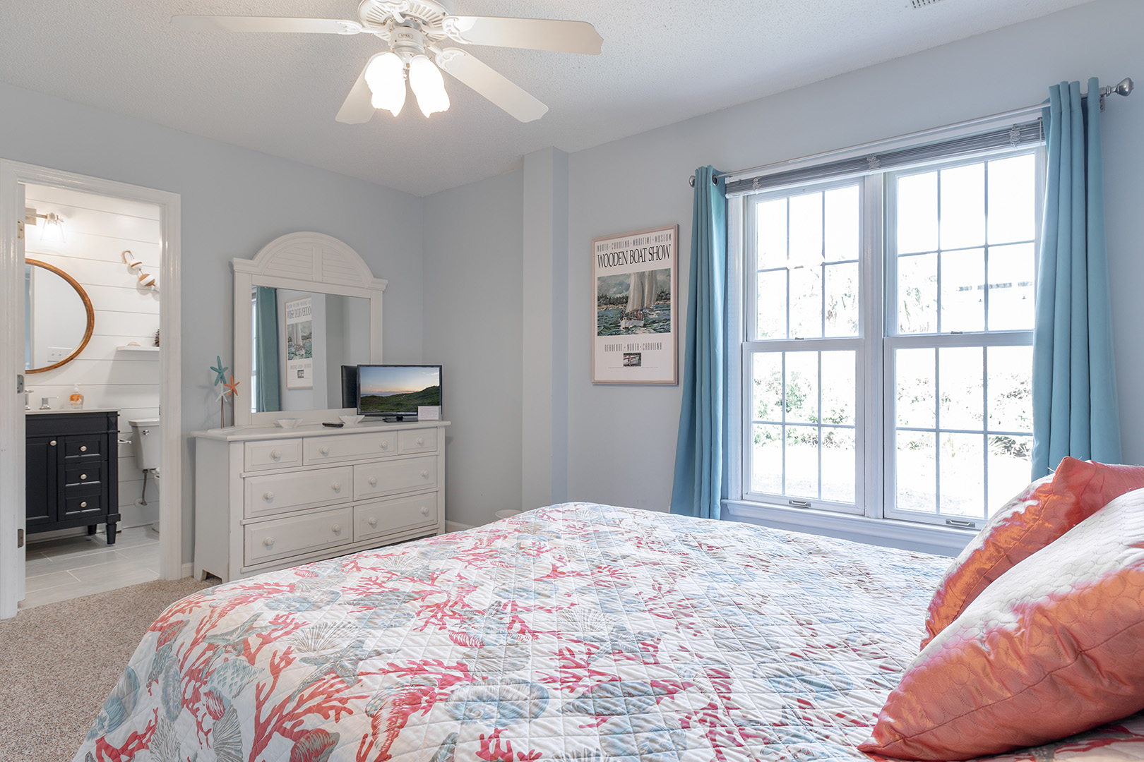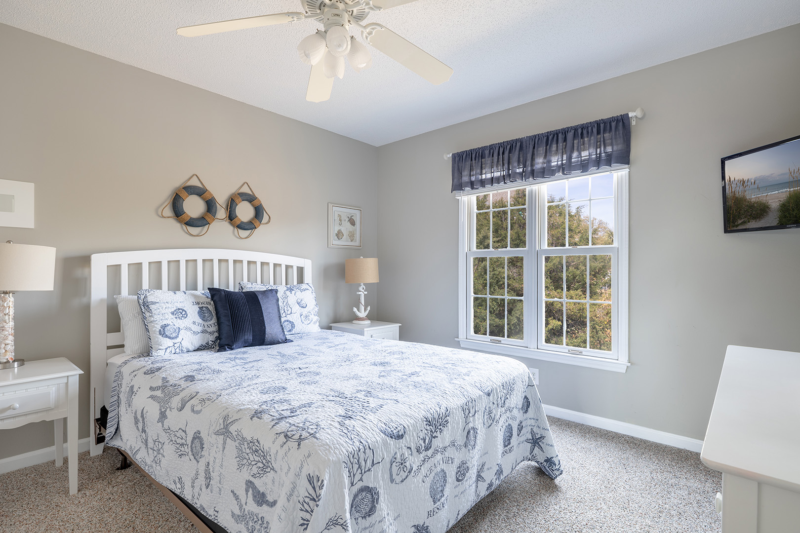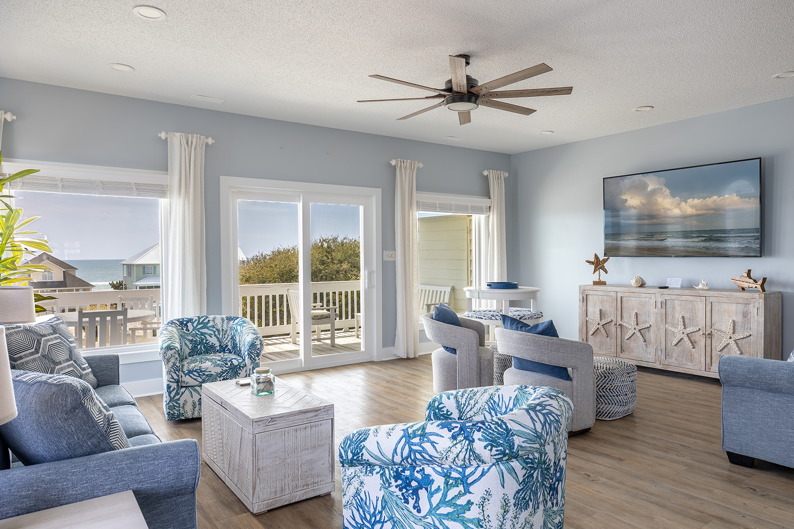 Level One: Oceanside Master Bedroom #2 with a king bed, flat-screen Smart TV, designated office space with desk and chair, and splendidly remodeled full bathroom offers stunning ocean views from your own private deck. Bedroom #3 has a queen bed, flat-screen Smart TV, and access to the charmingly updated shared full bathroom this level. Bedroom #4 has two twin beds and access to the shared bathroom.