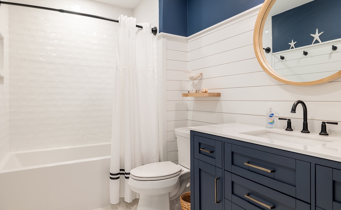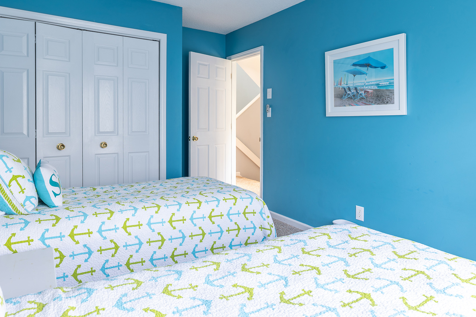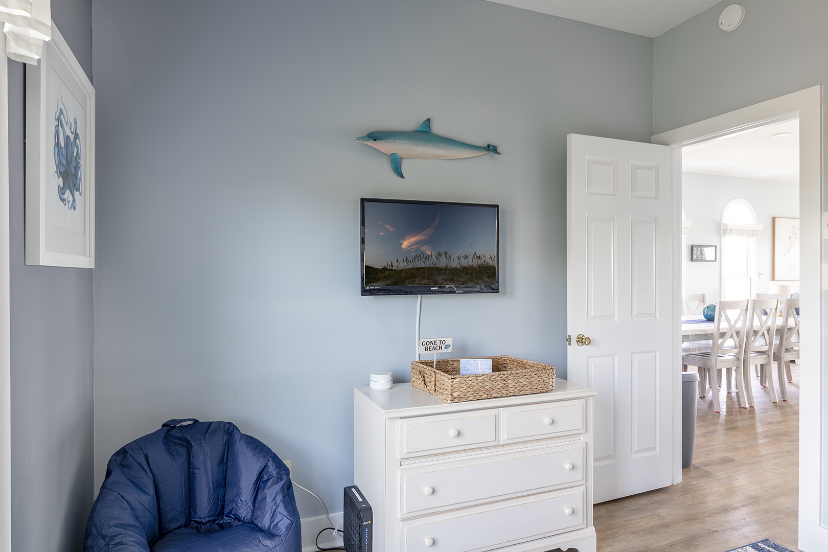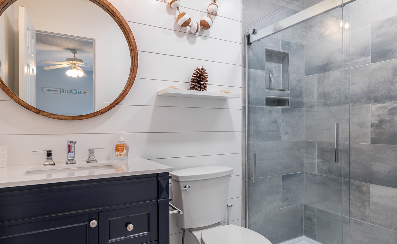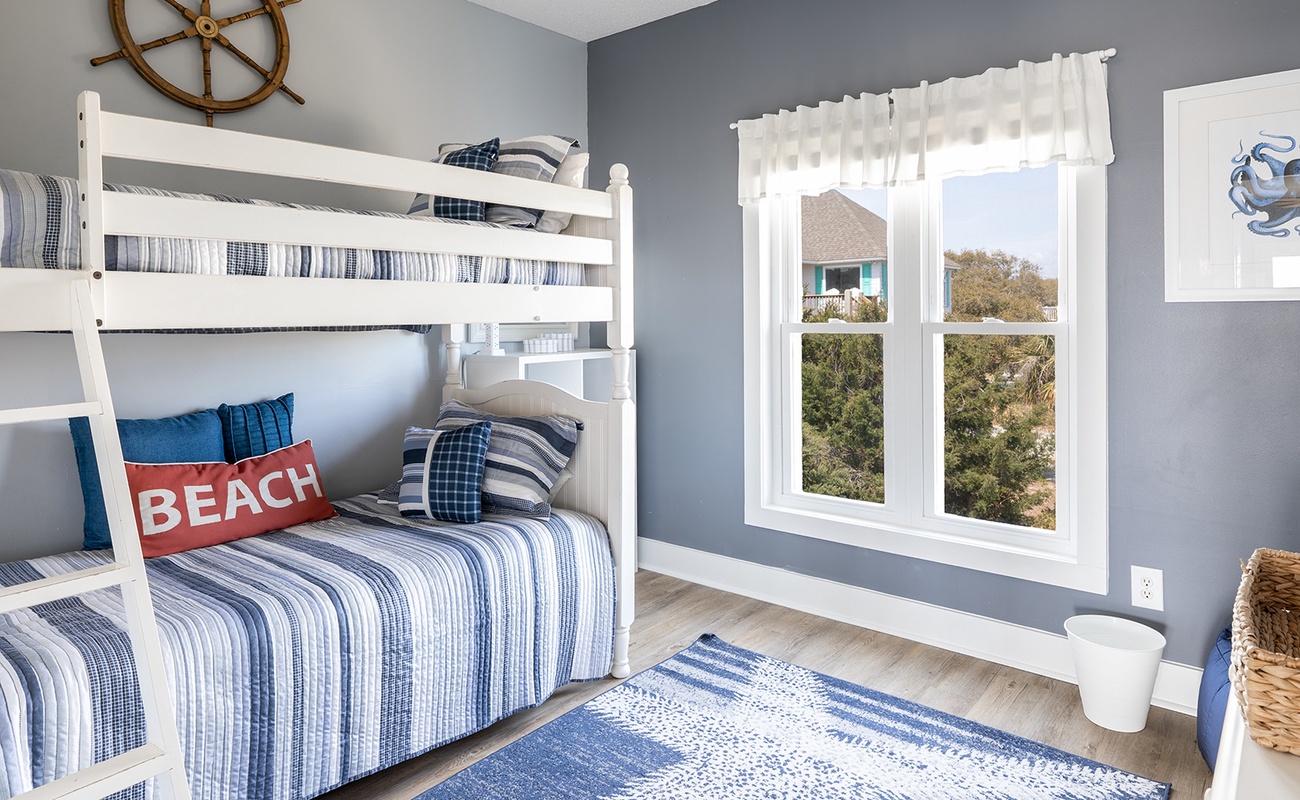 The dining area comfortably accommodates eight. The gallery-style kitchen/bar area has additional seating for two more! The kitchen is fully equipped with everything you will need to prepare meals and snacks for your family throughout your week at Nor Easter, including oven, stove, refrigerator, microwave, dishwasher, coffee maker, and toaster. Bedroom #5 has a twin bunk bed set, a flat-screen TV, and access to the wonderfully renovated shared full bathroom this level.
