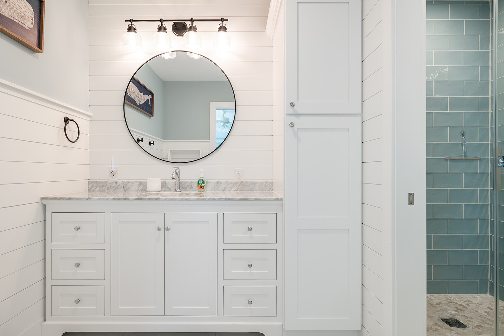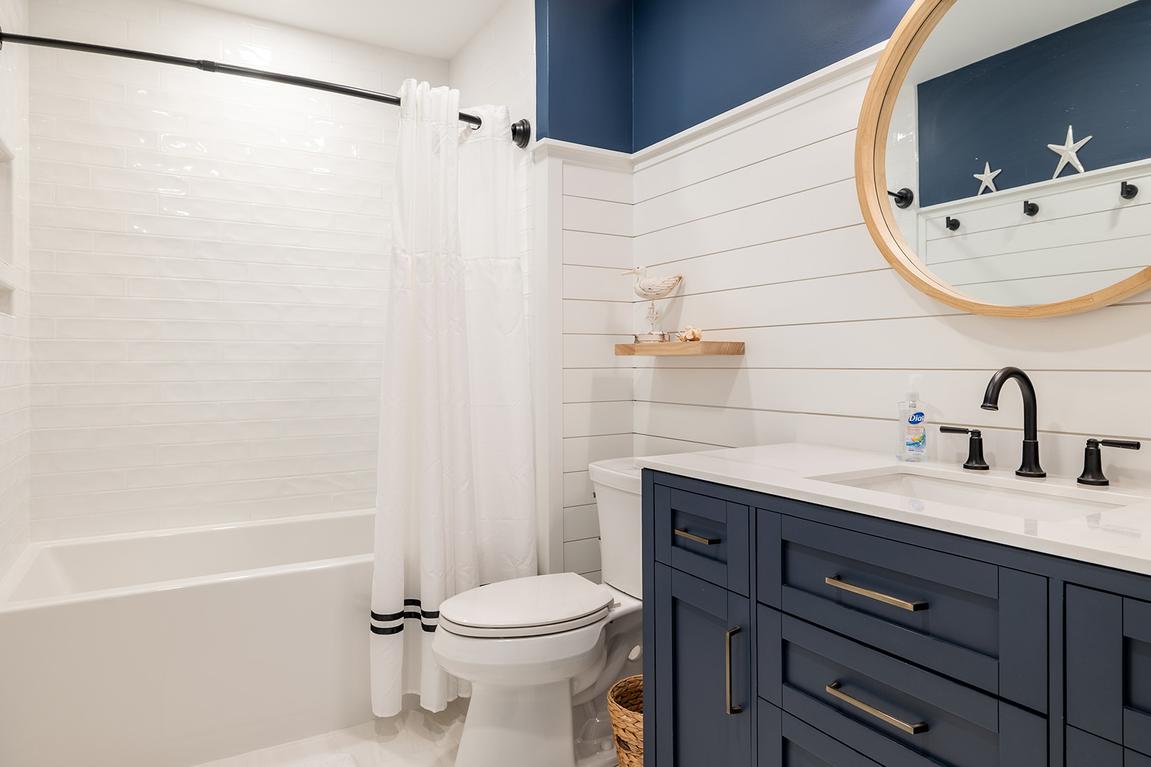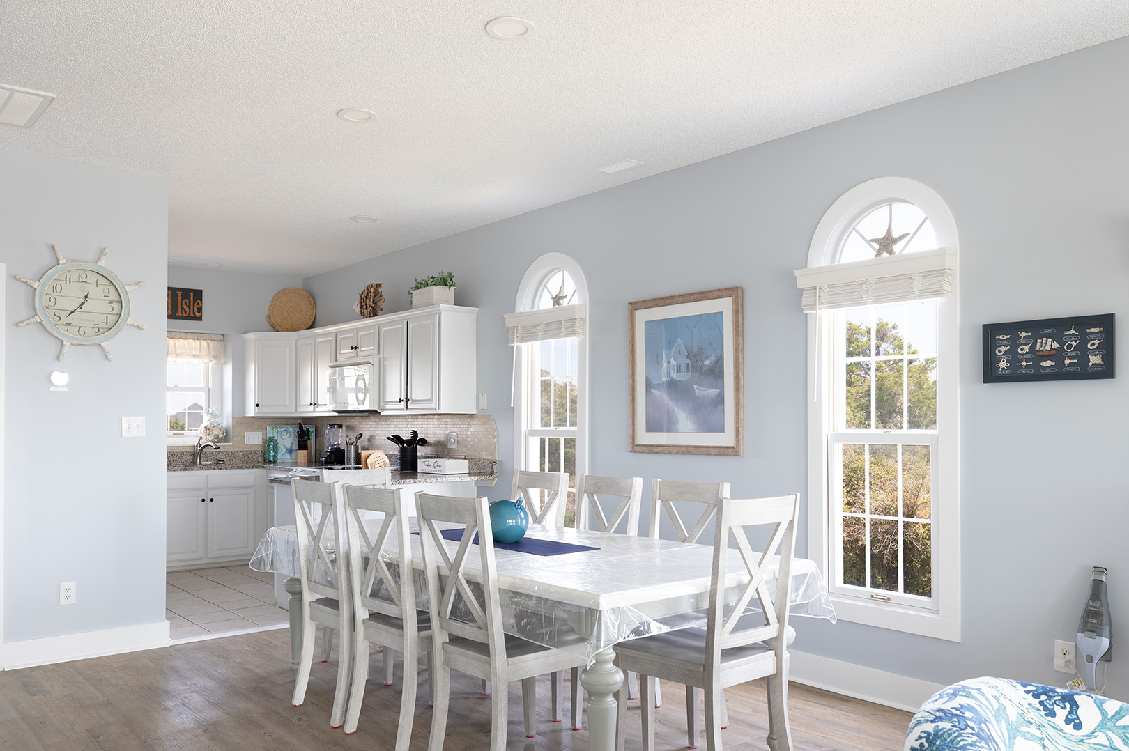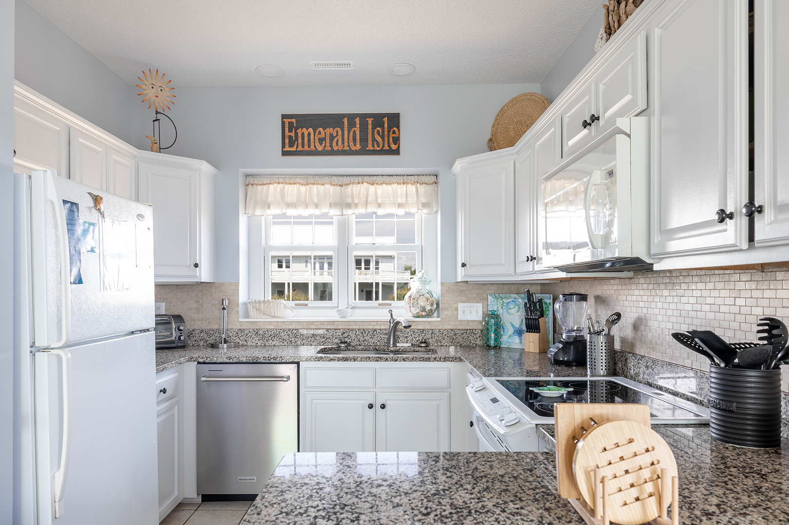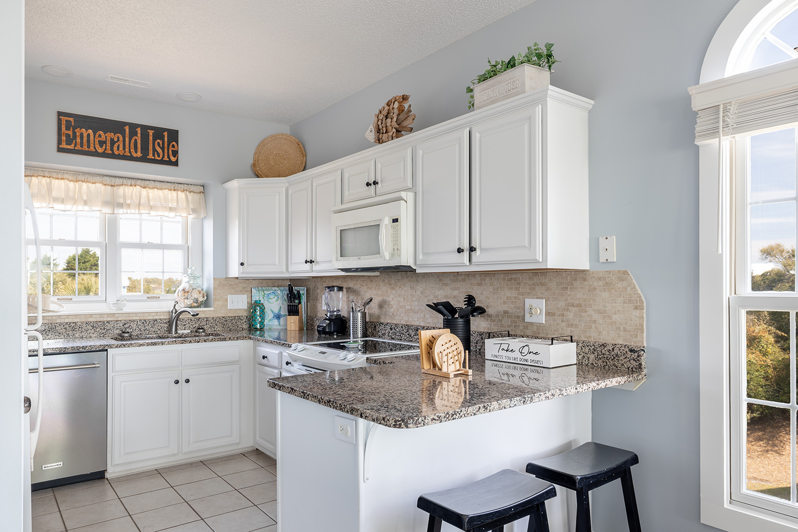 The dining area comfortably accommodates eight. The gallery-style kitchen/bar area has additional seating for two more! The kitchen is fully equipped with everything you will need to prepare meals and snacks for your family throughout your week at Nor Easter, including oven, stove, refrigerator, microwave, dishwasher, coffee maker, and toaster. Bedroom #5 has a twin bunk bed set, a flat-screen TV, and access to the wonderfully renovated shared full bathroom this level.