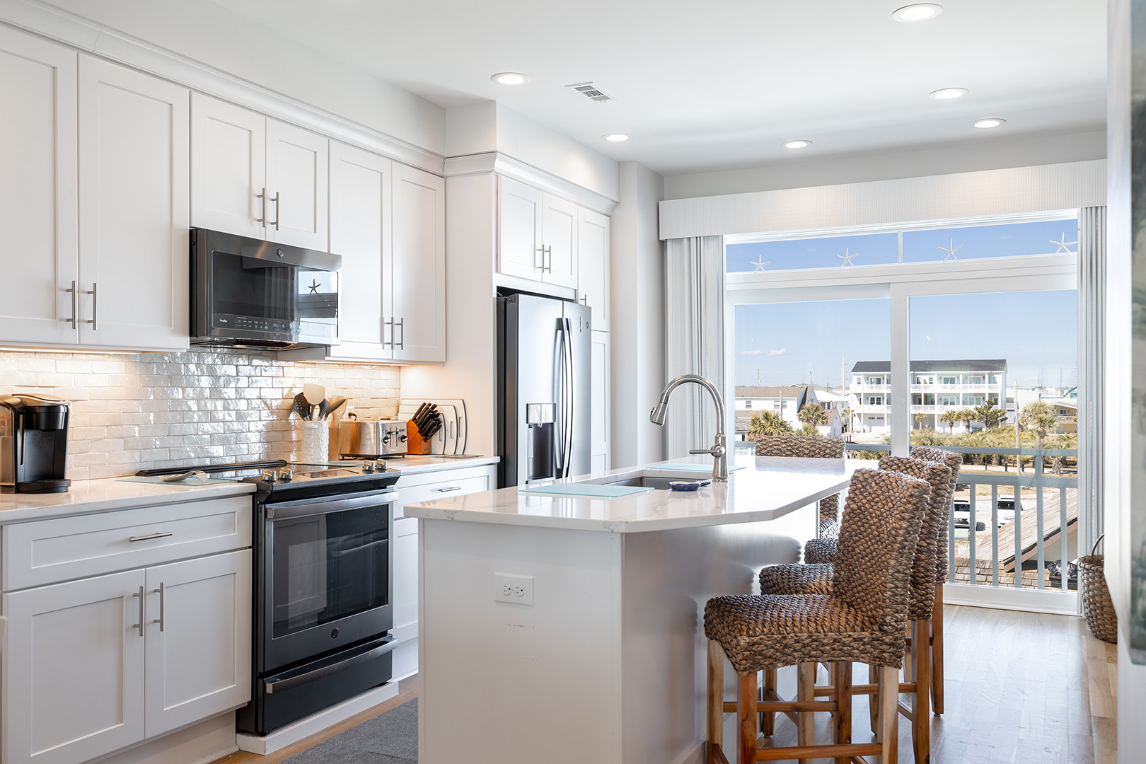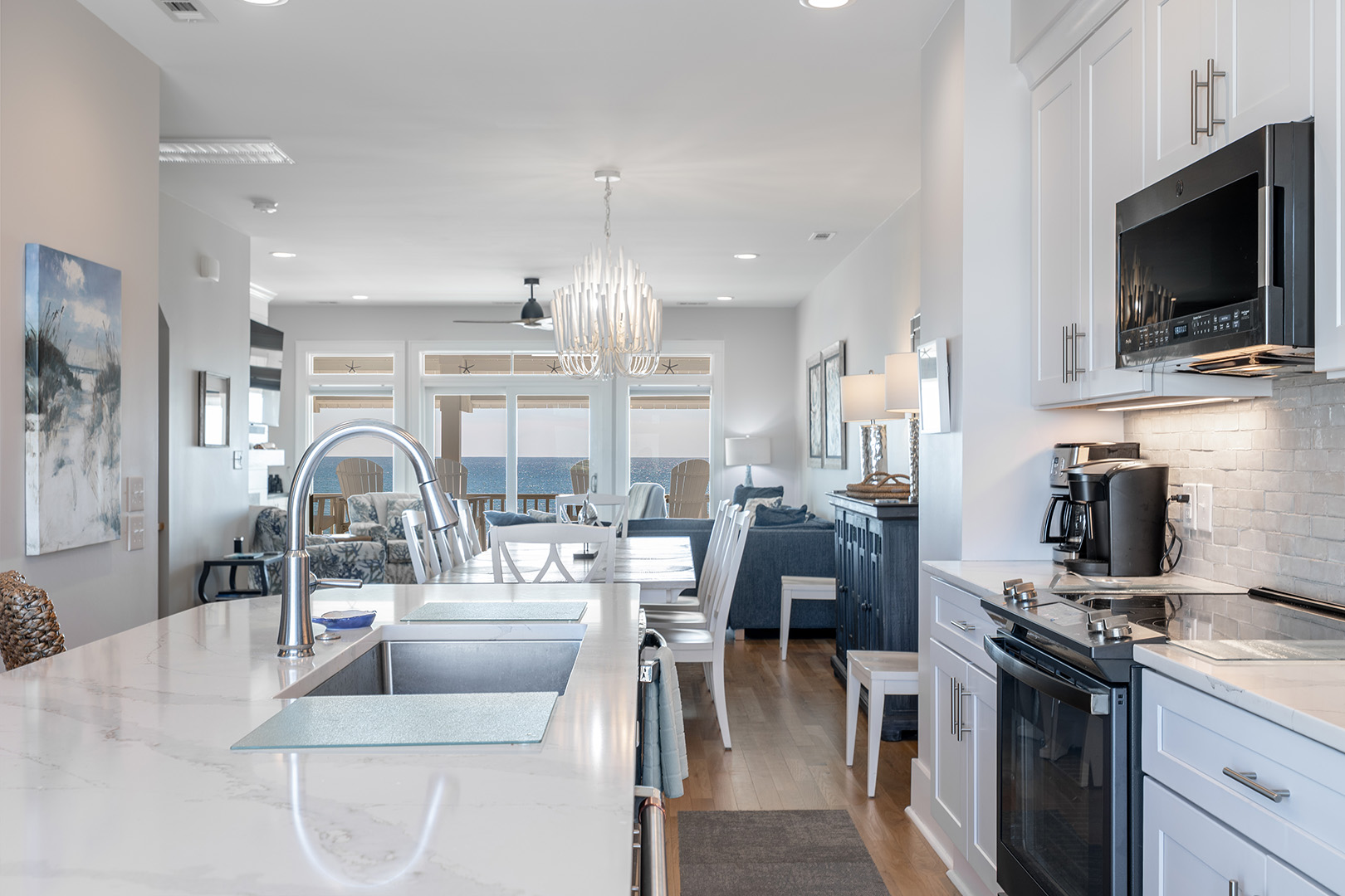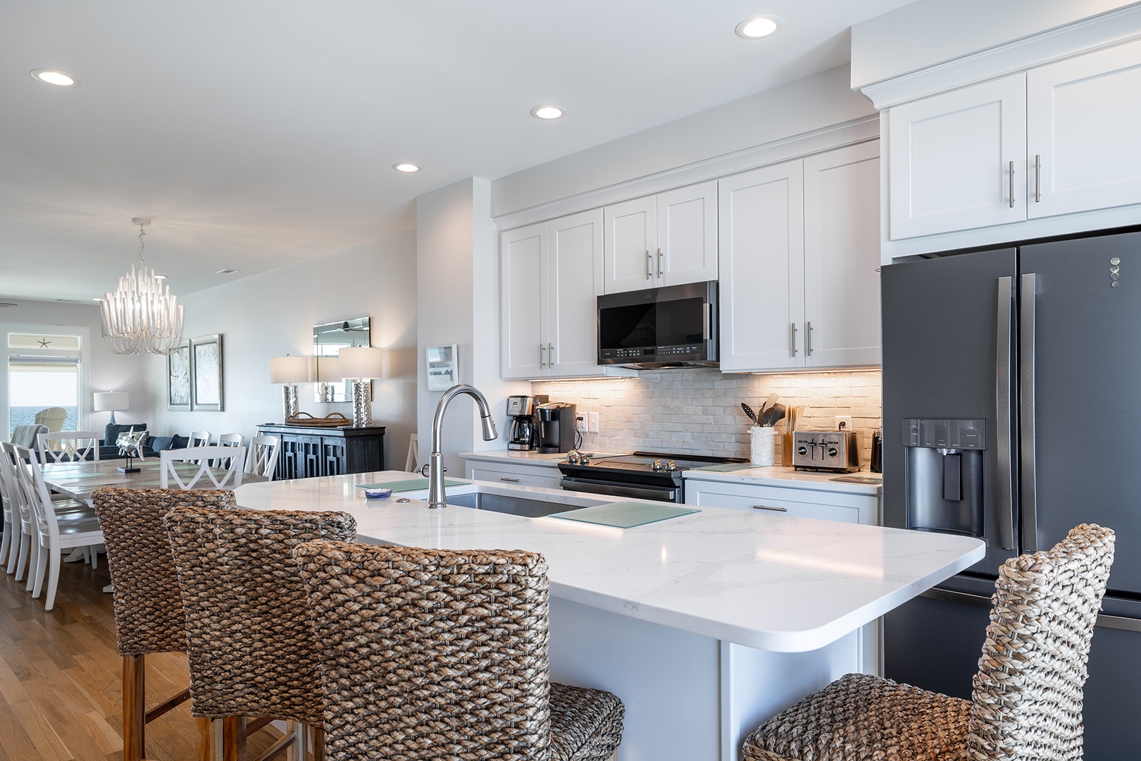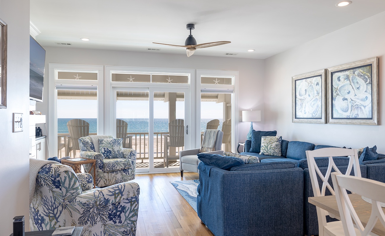 Gather with your crew in the open-concept living, dining, and kitchen area that showcases stunning Atlantic views. The fully-stocked gourmet kitchen includes stainless appliances, a dine-at island, coffee makers (Keurig & drip), fridge with ice maker, bonus refrigerated drawers, and more. Relax in the cool coastal living room with Roku TV, or enjoy dinner and a movie in the dining space with its own TV. There's also a half bath on this level. And don’t miss the covered oceanfront deck – the perfect perch for sunset happy hour.Â