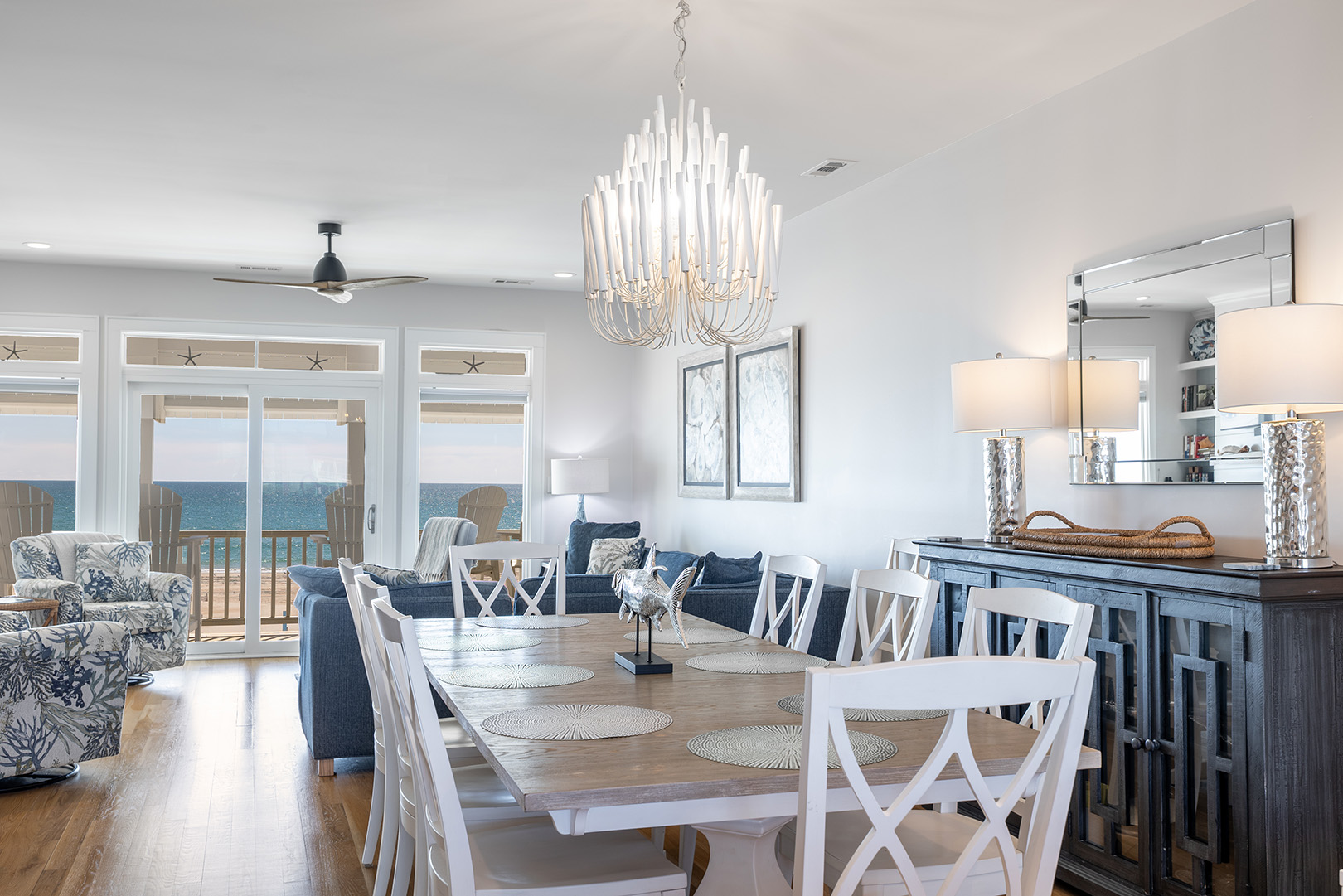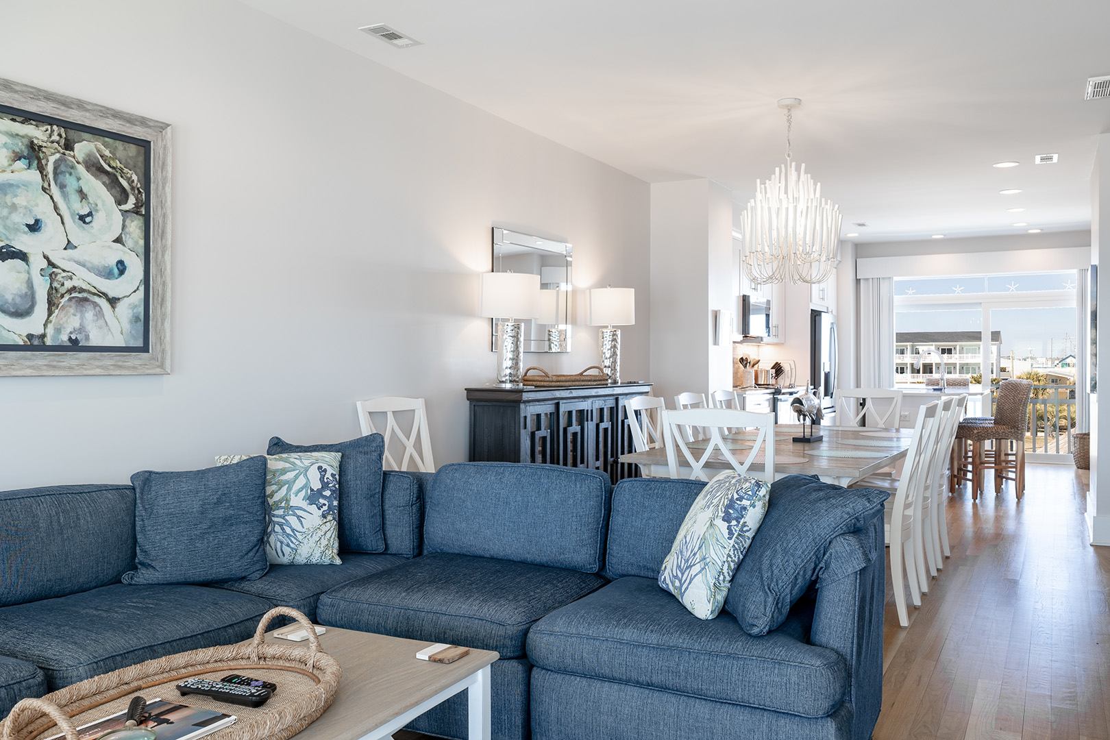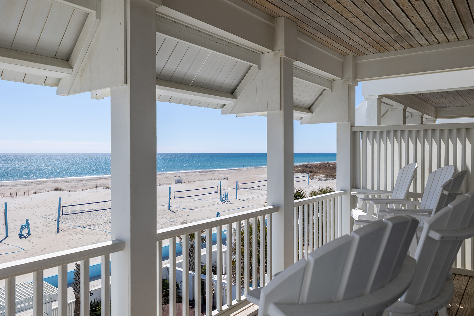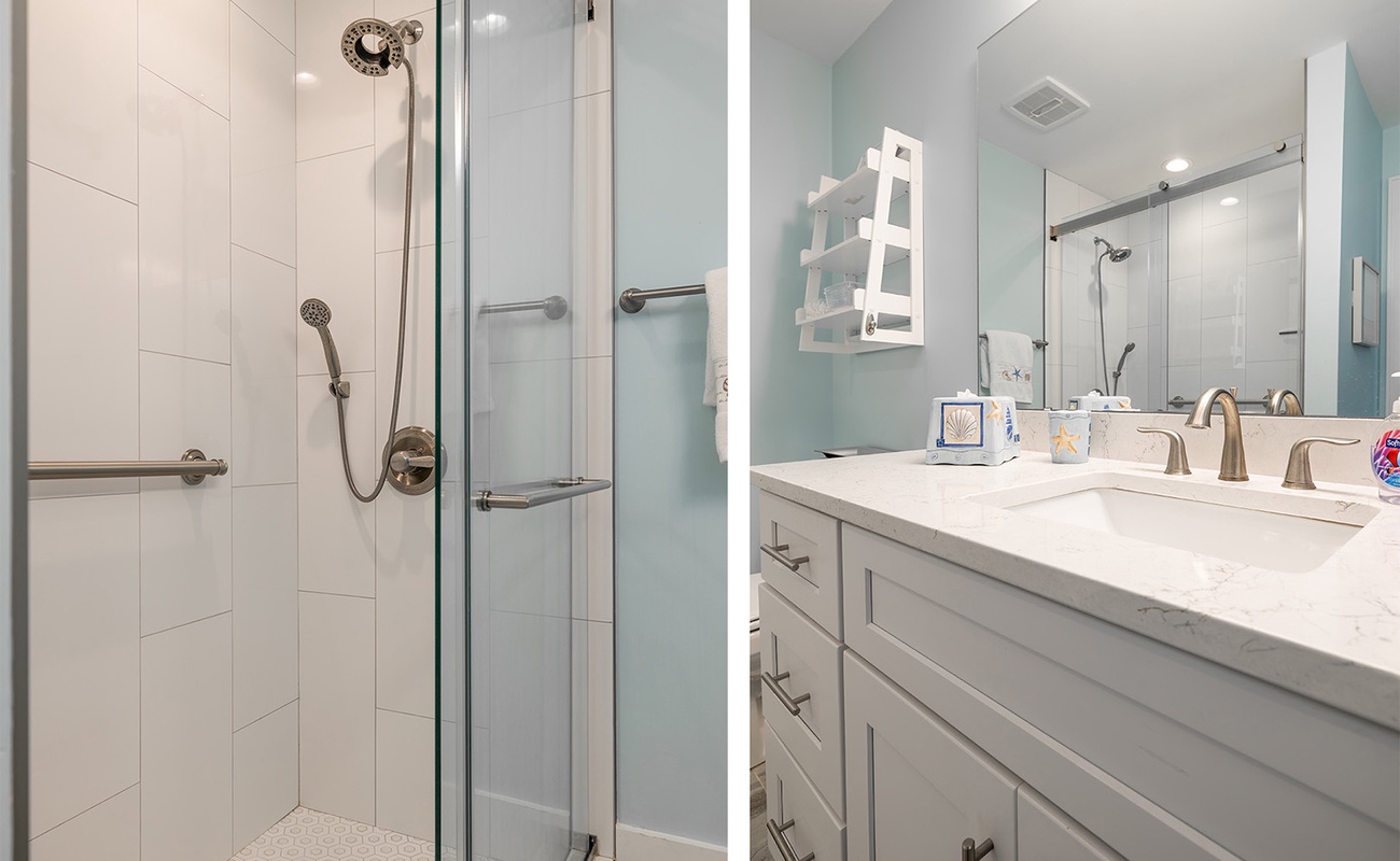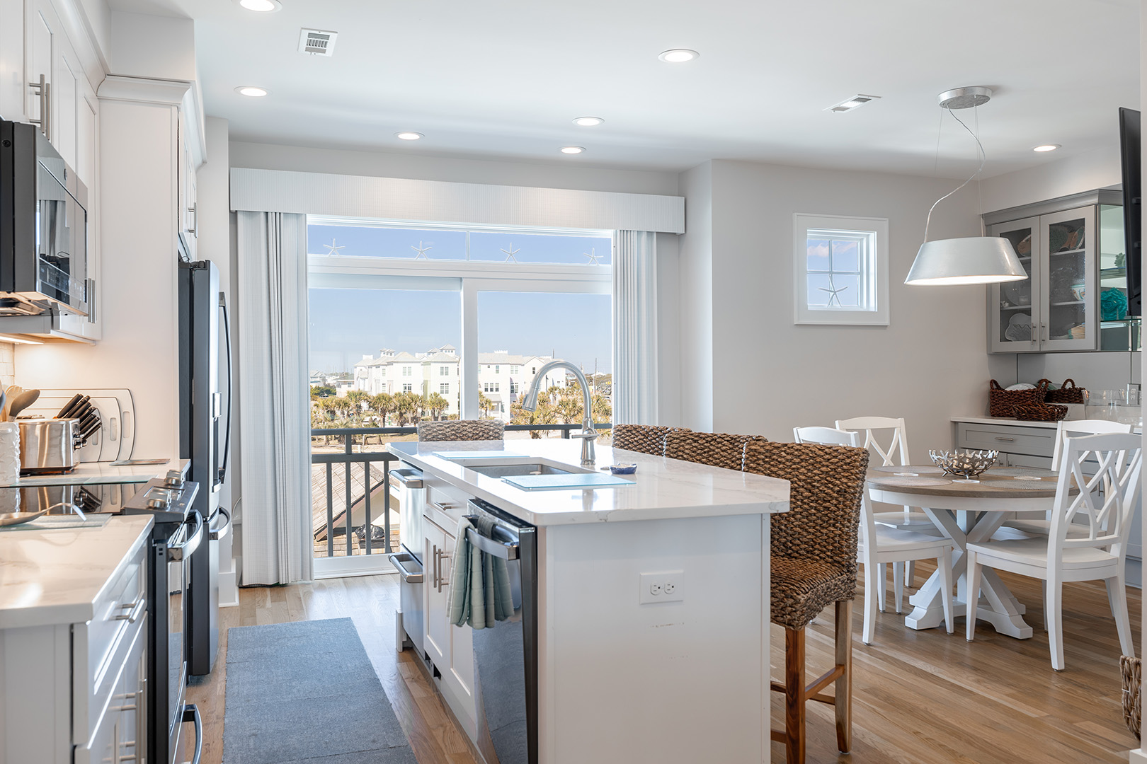 Gather with your crew in the open-concept living, dining, and kitchen area that showcases stunning Atlantic views. The fully-stocked gourmet kitchen includes stainless appliances, a dine-at island, coffee makers (Keurig & drip), fridge with ice maker, bonus refrigerated drawers, and more. Relax in the cool coastal living room with Roku TV, or enjoy dinner and a movie in the dining space with its own TV. There's also a half bath on this level. And don’t miss the covered oceanfront deck – the perfect perch for sunset happy hour.Â