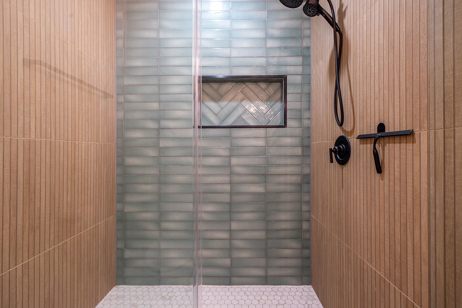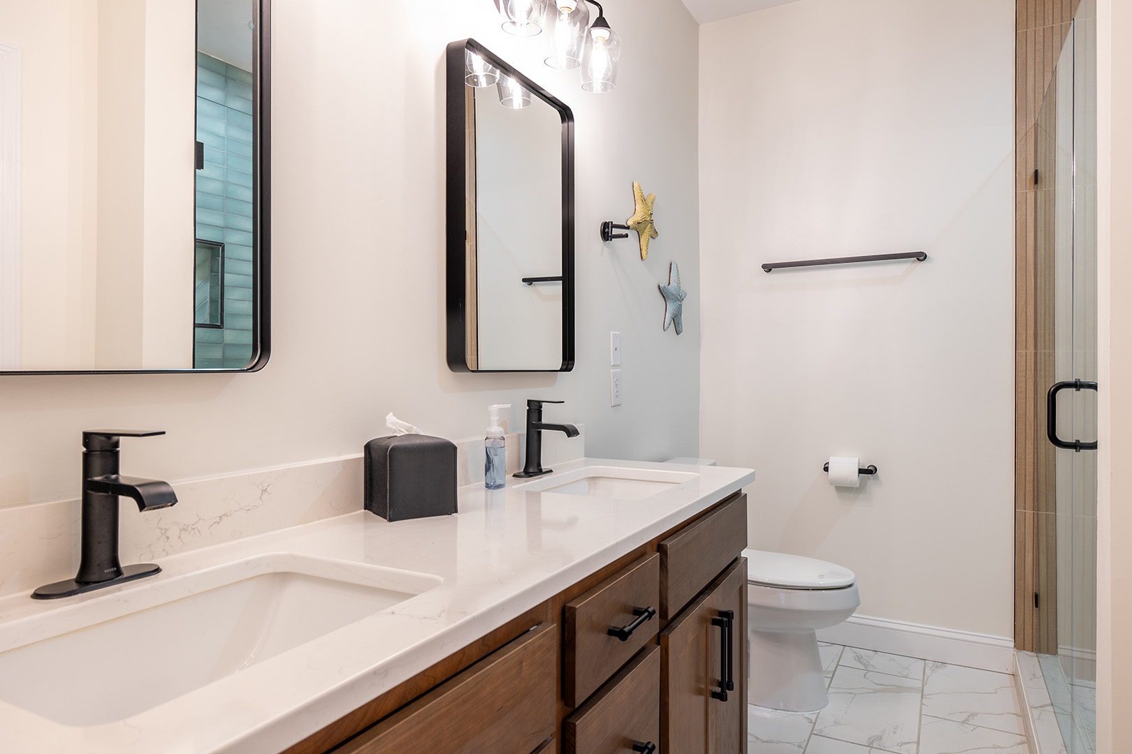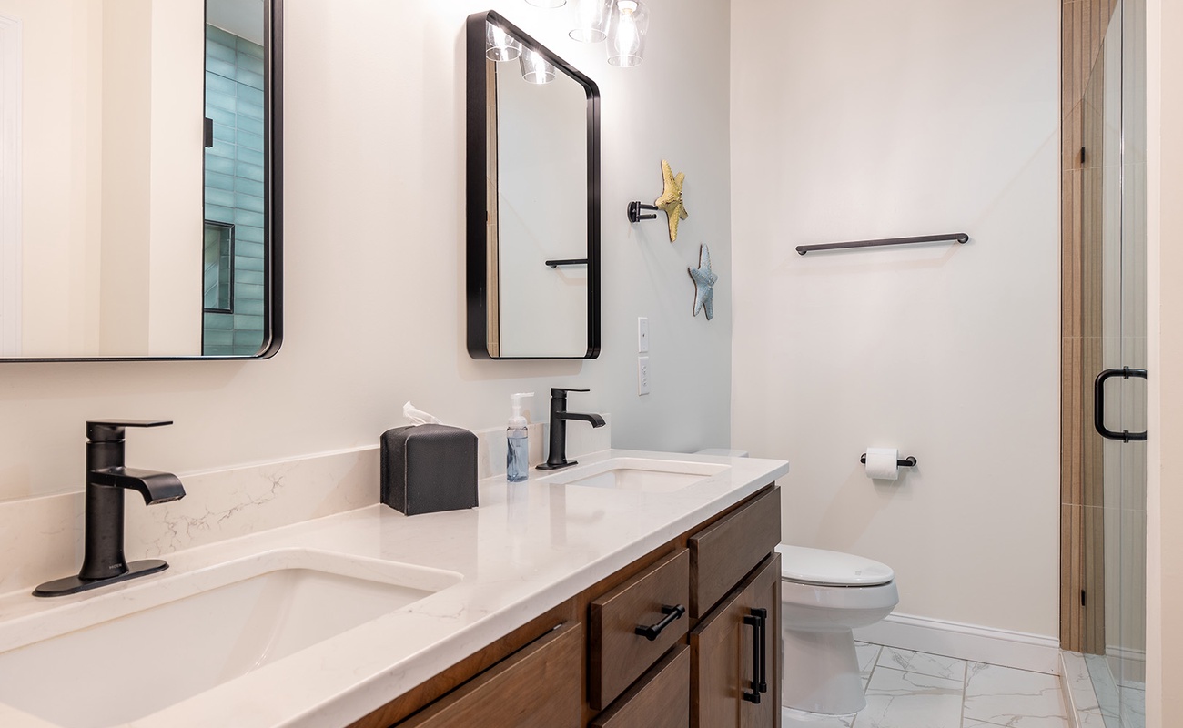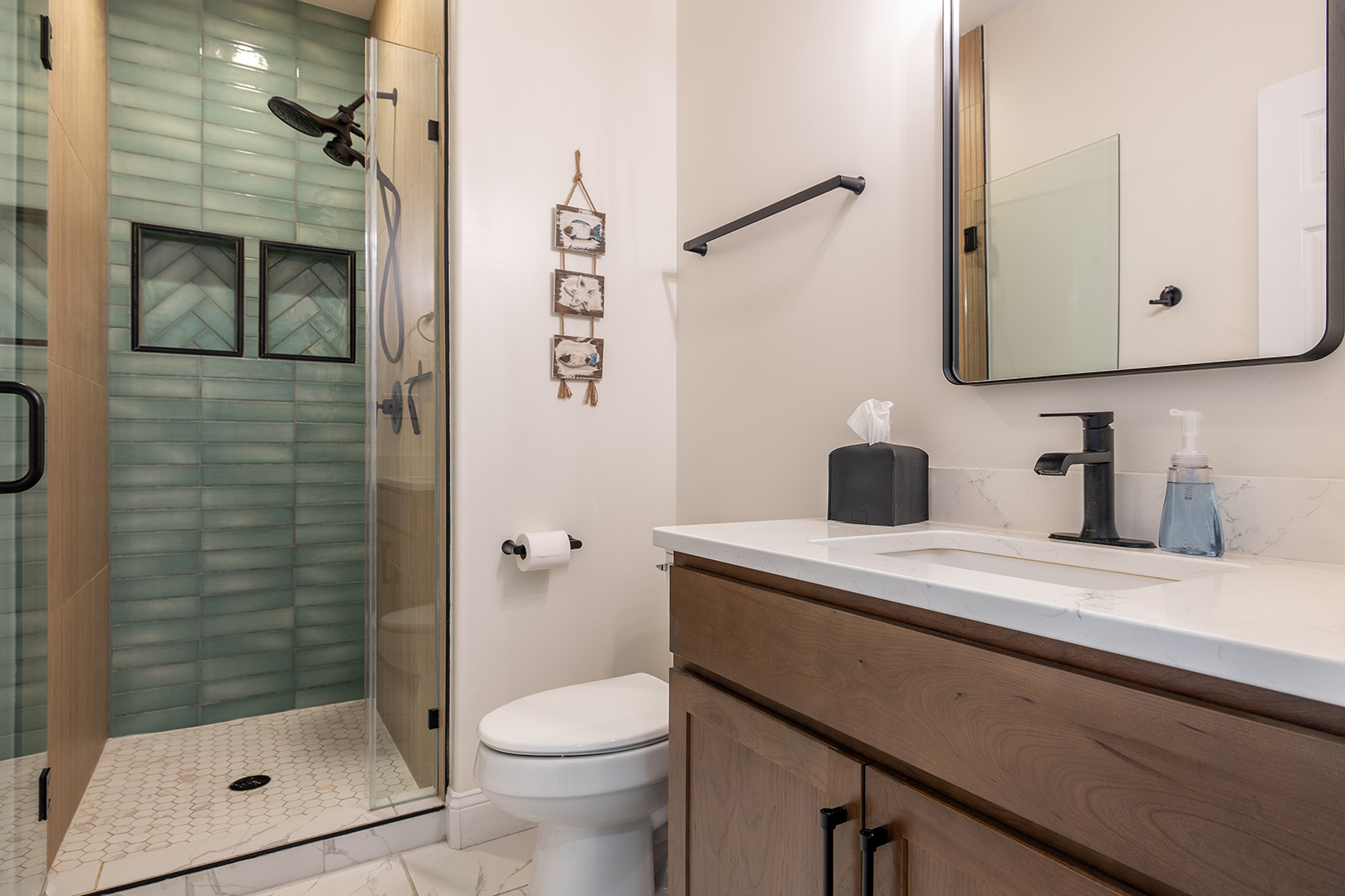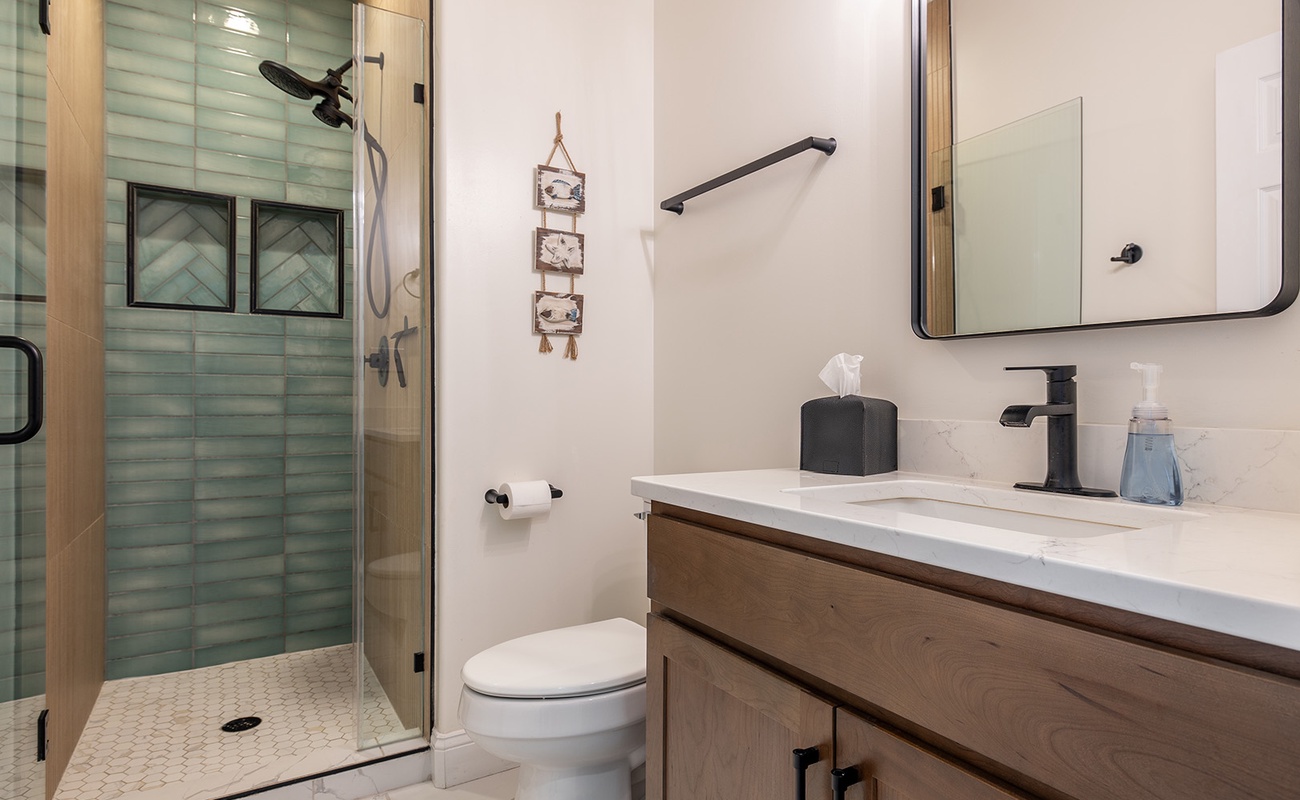 Bedroom #1 offers a King Bed with space for turn-around and private en suite bath with space for turn-around and a roll-in shower; Bedroom #2 provides a Queen Bed and access to the Shared Bath; Bonus Room with 2 Twin Beds and access to the Shared Bath.