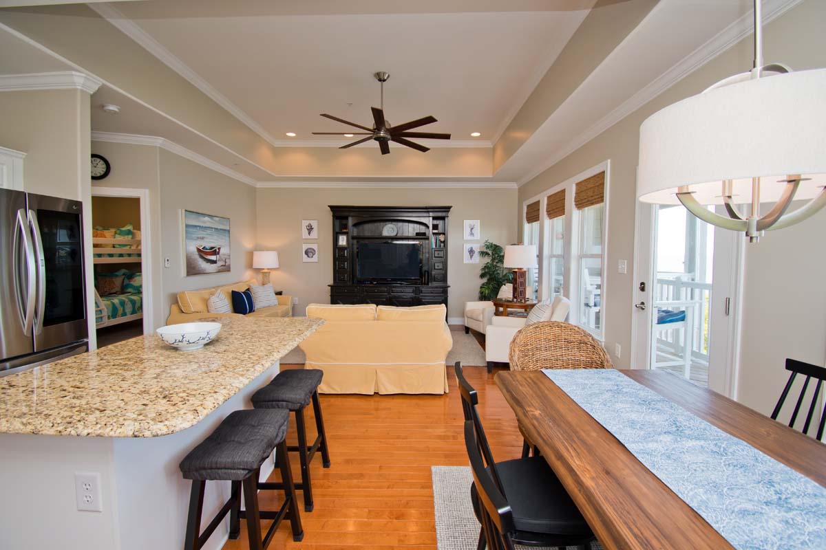 Ocean Club S304 is a beautiful 2-bedroom, 2-bathroom Soundfront Condo in Indian Beach offering beautiful serene surrounding views. Bedroom #1 with King Bed, TV, Private Bath. Bedroom #2 with Queen Bed, TV, access to Shared Bath. Bonus Room with Twin over Double Bunk Bed, TV, access to Shared Bath.