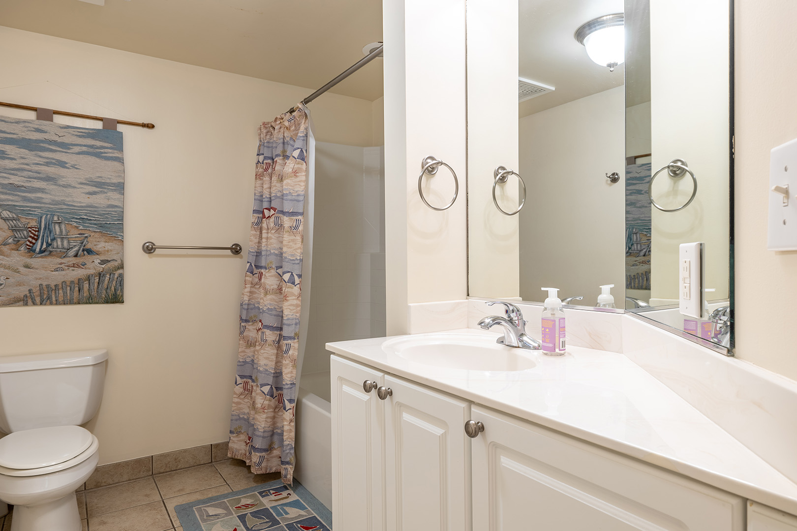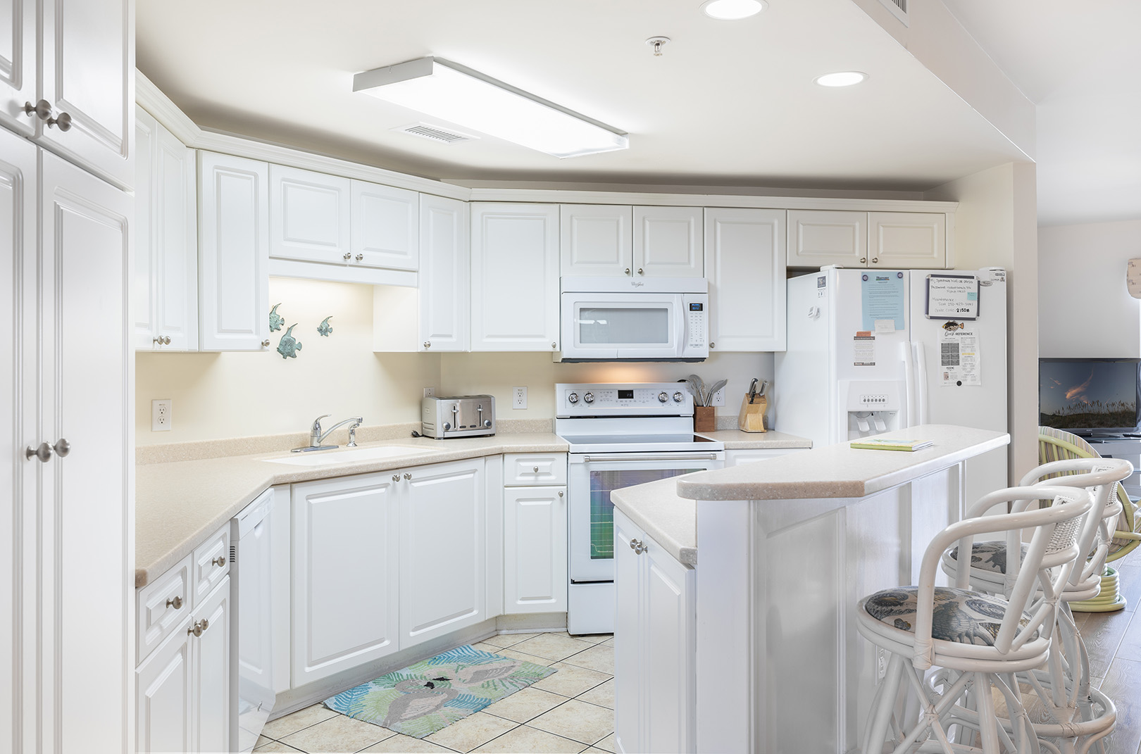Additional Amenities include: 4 Color Cable TVs, DVD Player, a Stereo, CD Player, High-Speed Wireless Internet access, In unit Washer/Dryer, Dishwasher, Microwave, Large Covered Deck with Furniture, and Folding Chairs for the beach.