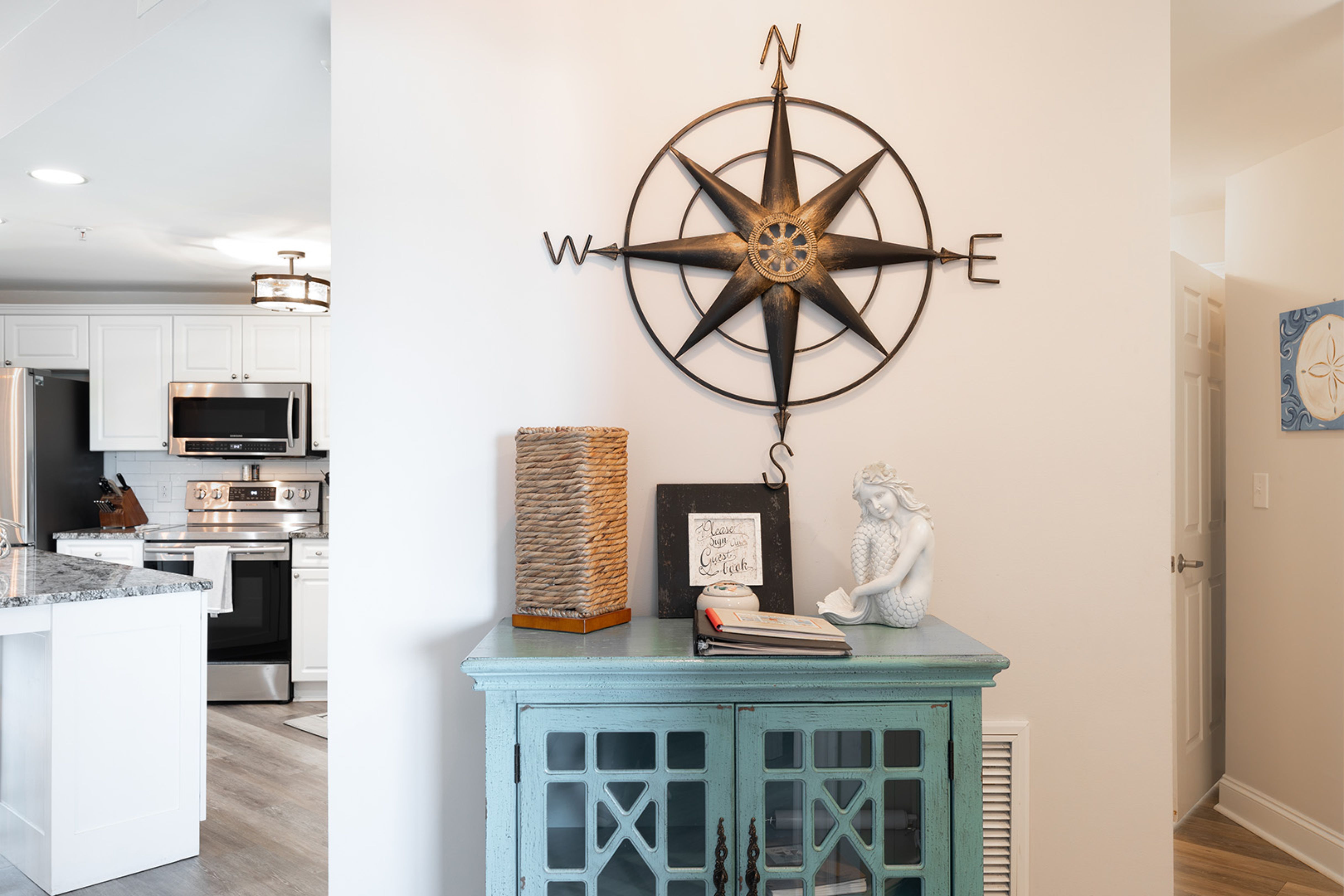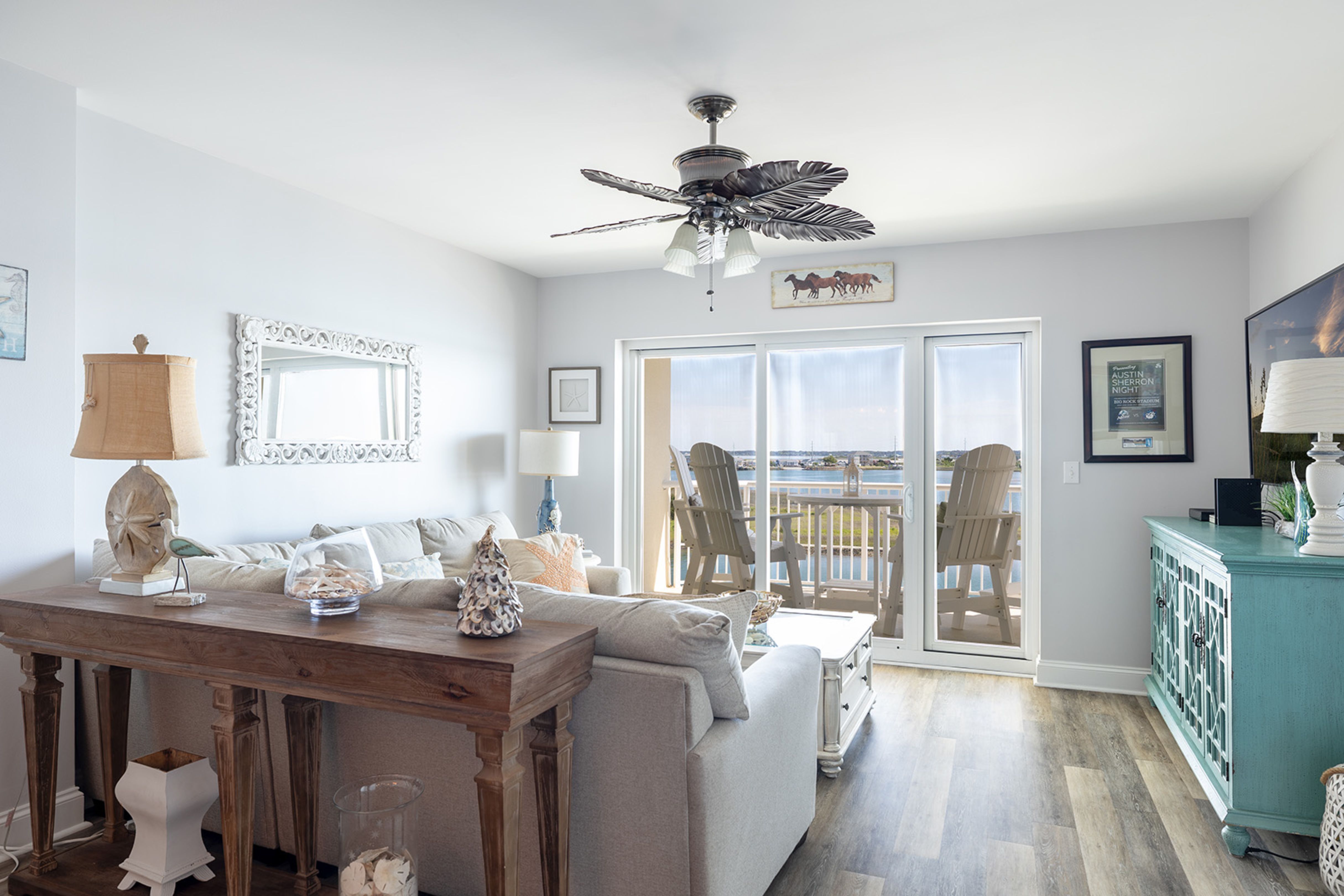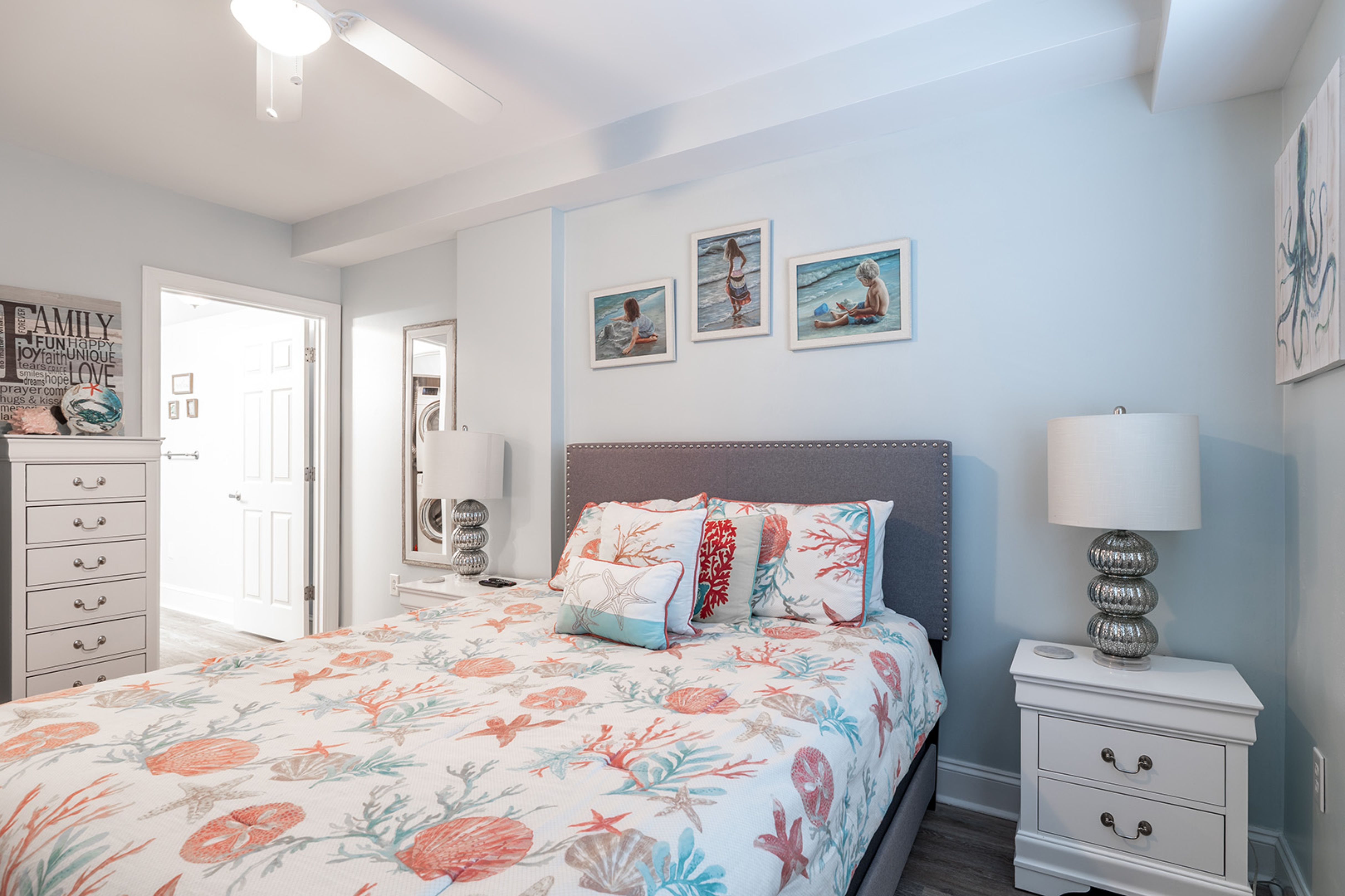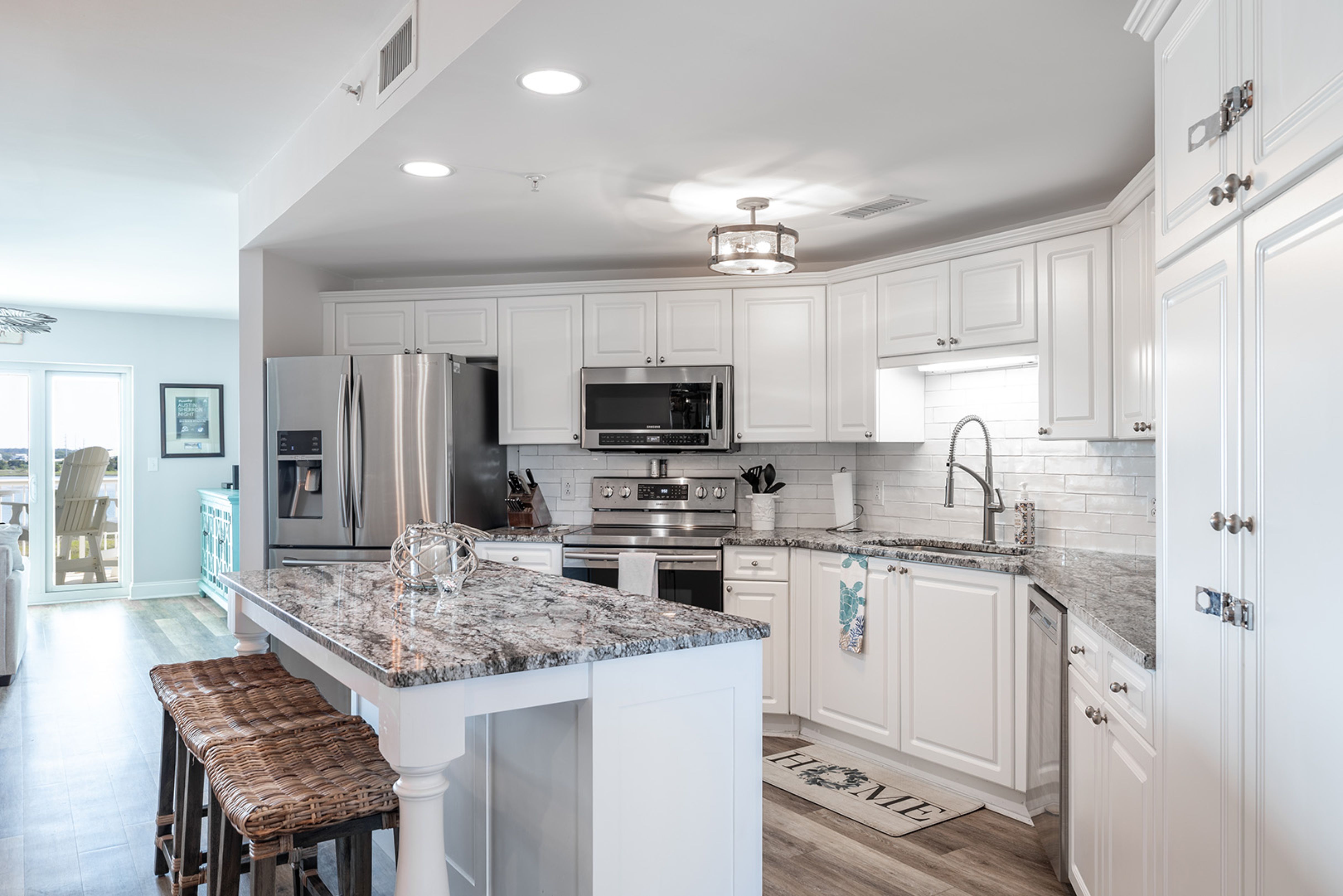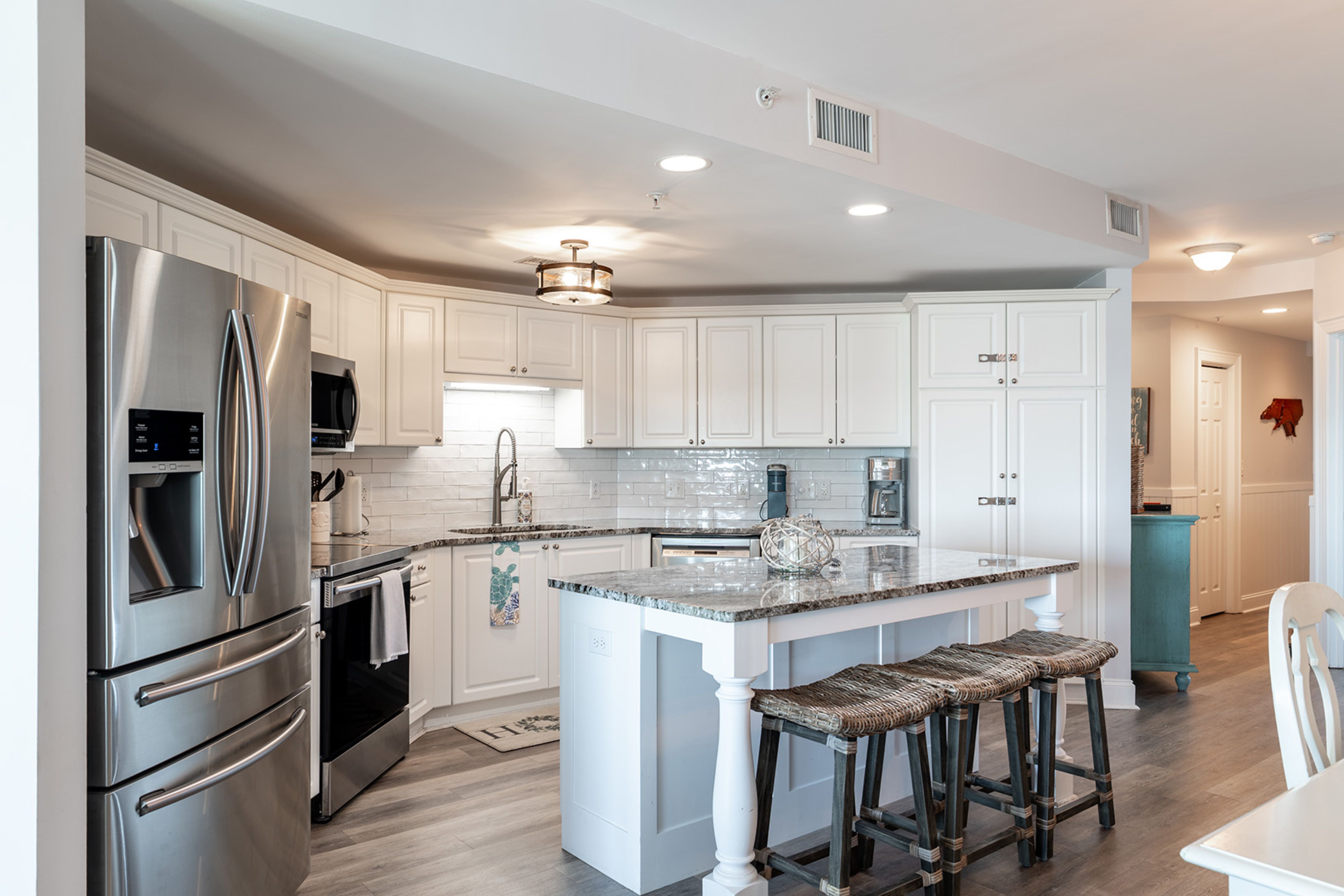 Amenities include: 4 Smart TVs with access to streaming apps, High-Speed Wireless Internet; In-Unit Washer/Dryer; Fully Equipped Kitchen with Stove/Oven, Refrigerator, Coffee Maker, Keurig Coffee Maker, Microwave, Dishwasher; Private Covered Balcony with Furniture.