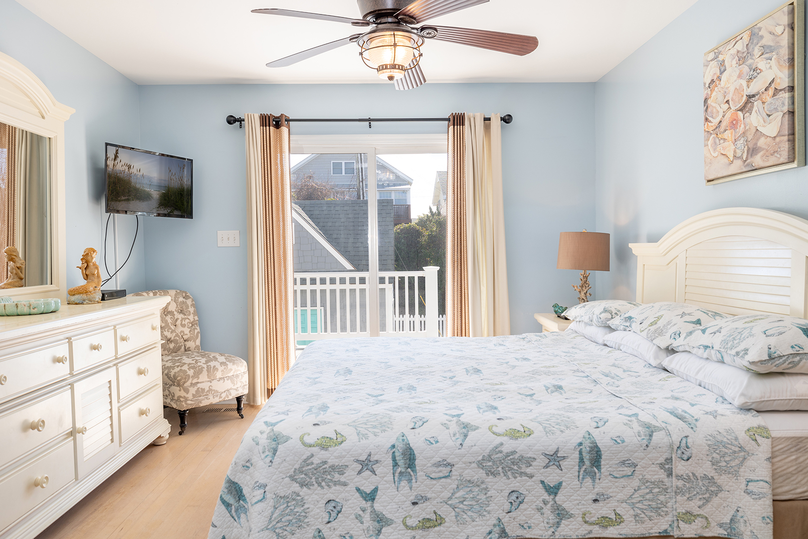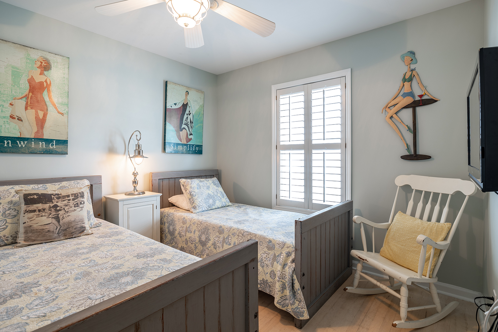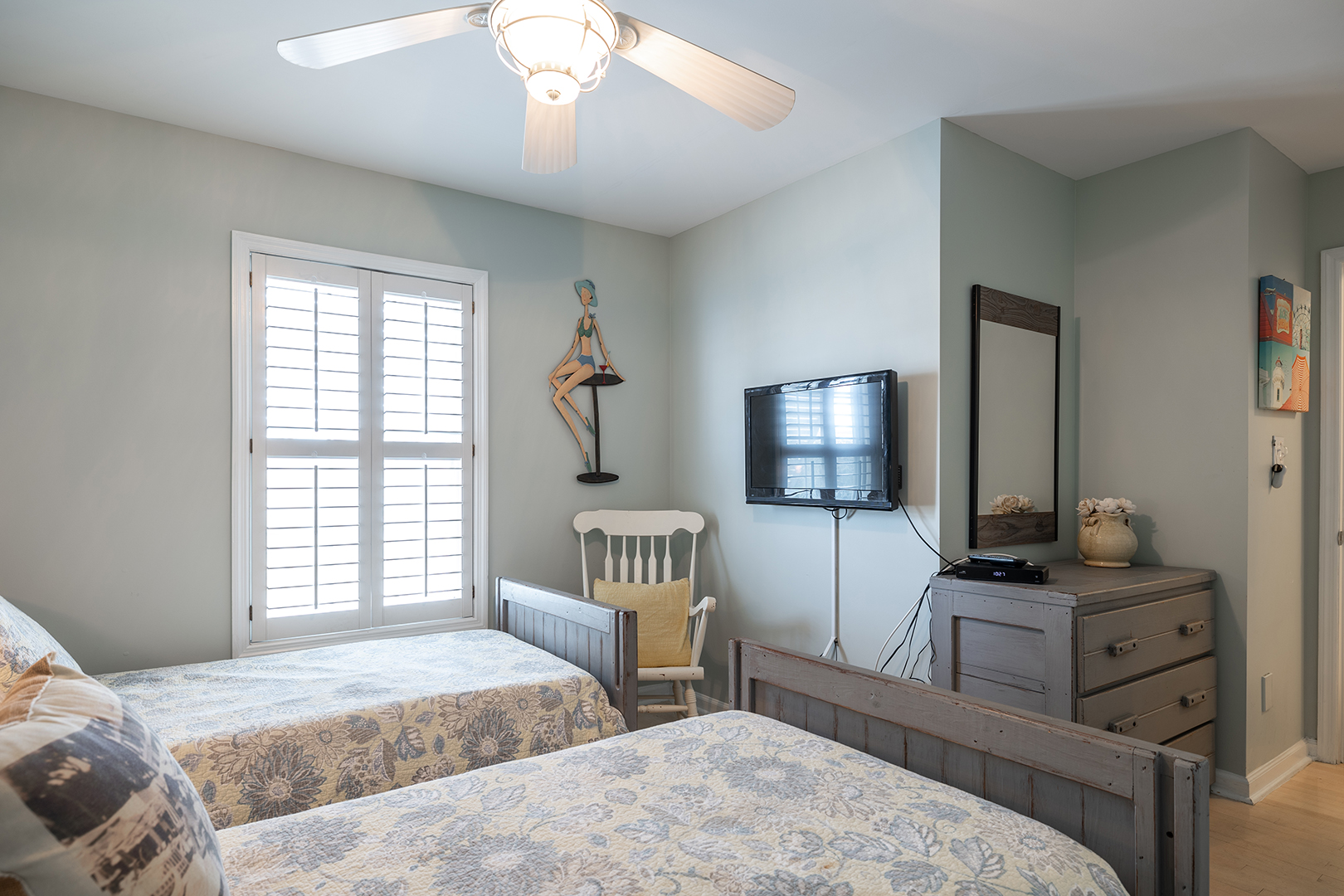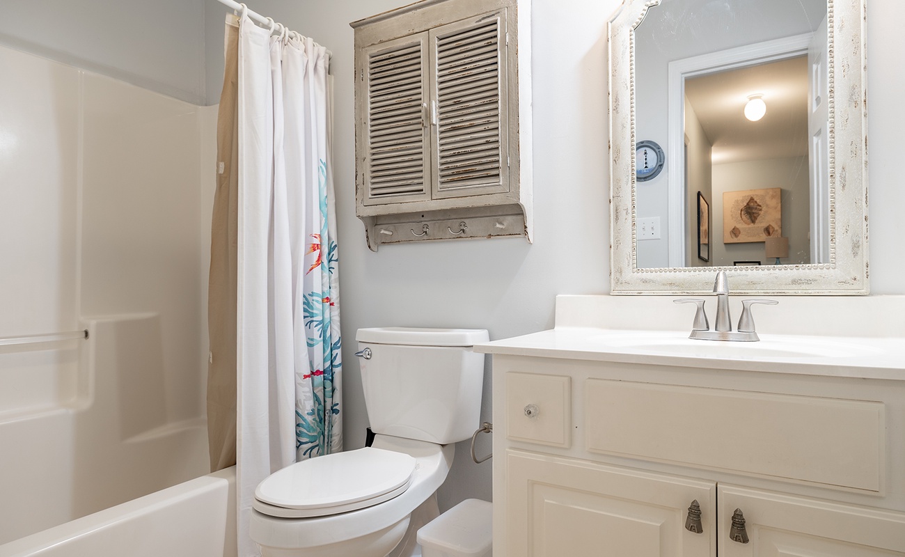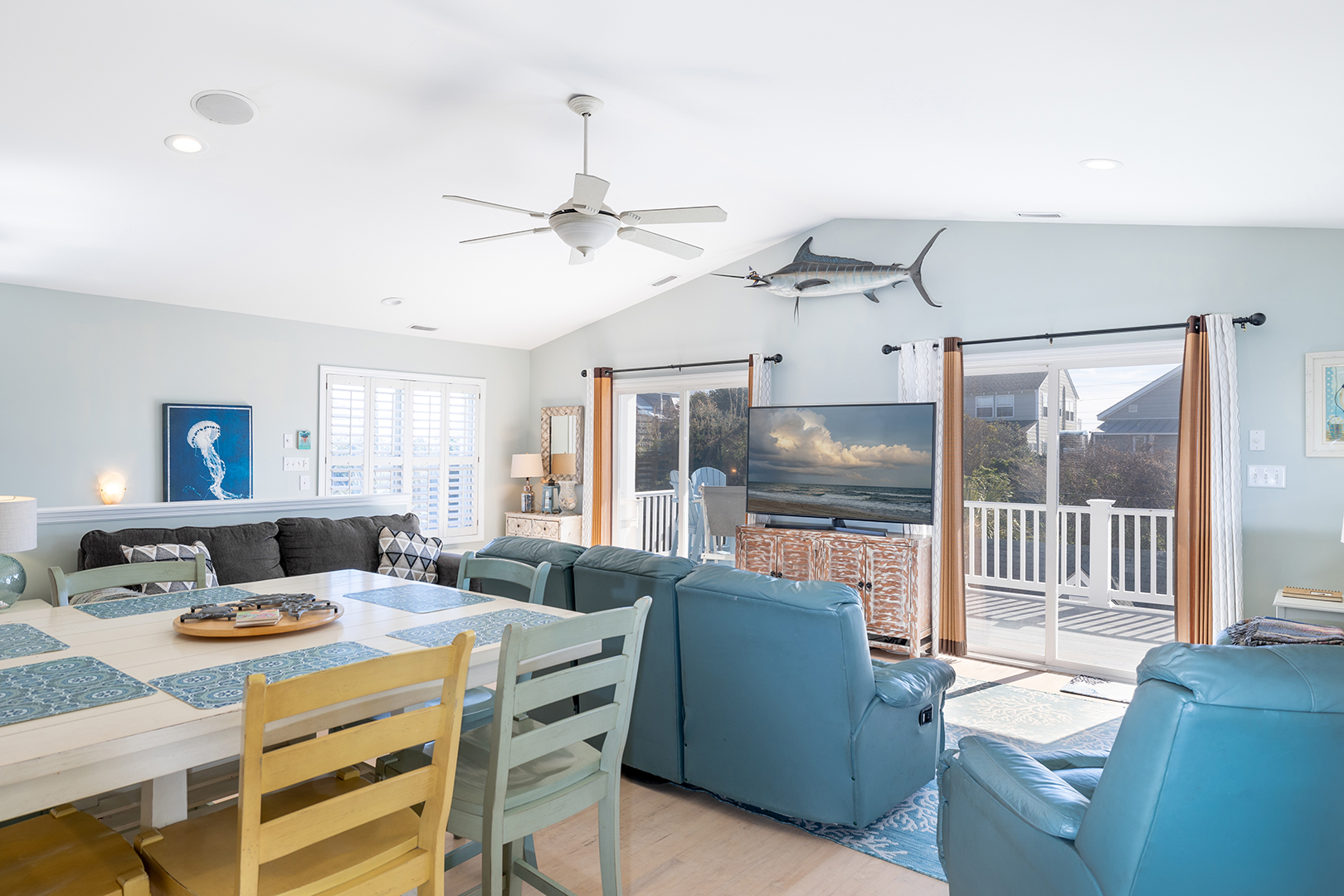 Prior guests have liked the reverse floor plan, where you enter the home in the foyer onto hardwood floors that feature an inlaid blue marlin fish. This leads to a bathroom in the hall with a shower and tub that is easily accessed by all 3 bedrooms with ceiling fans and storage. The first bedroom is beside the bathroom with twin beds and a wall-mounted flat-panel Smart TV. Then proceed down the hall to the 2nd bedroom with a queen bed, an armoire with a flat panel Smart TV, and access to the covered deck. At the end of the hall is a large primary suite with a king bed, ensuite bathroom with shower, wall-mounted flat panel Smart TV, and access to the covered deck (seating) with a staircase leading to the backyard.