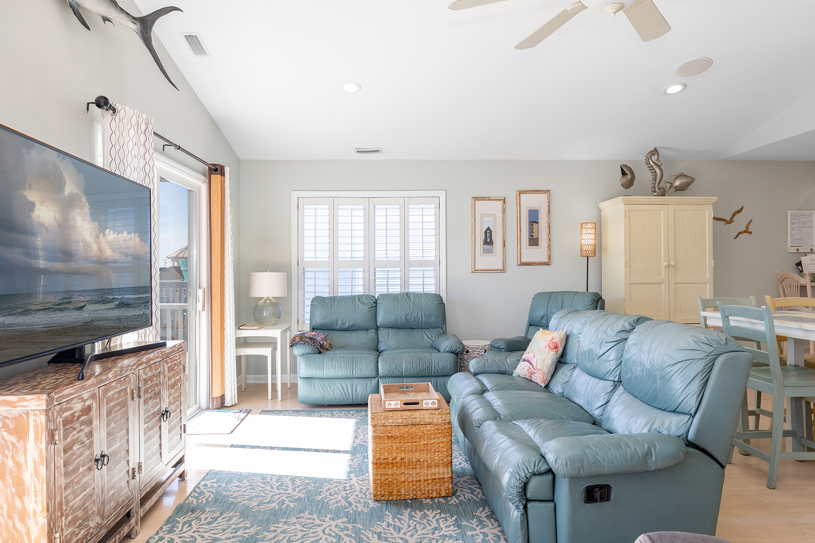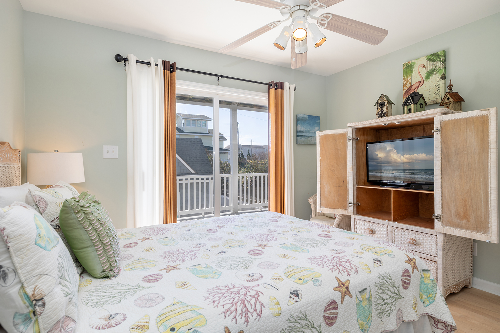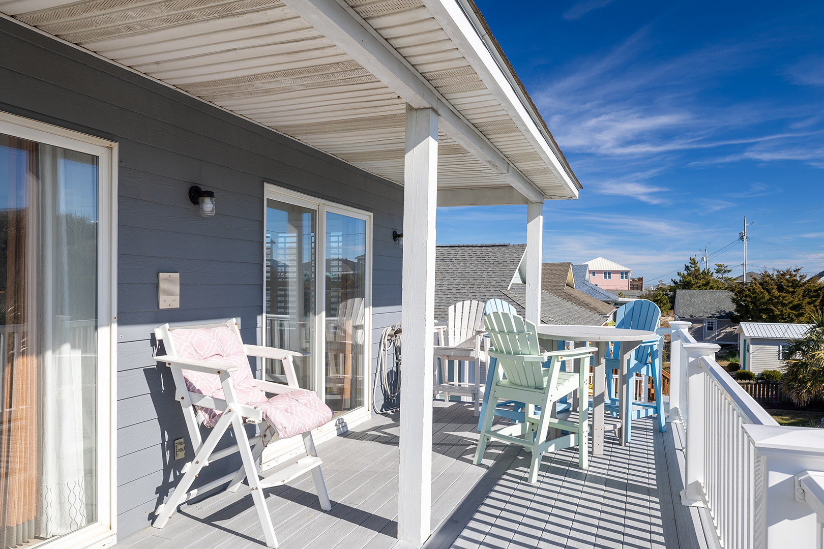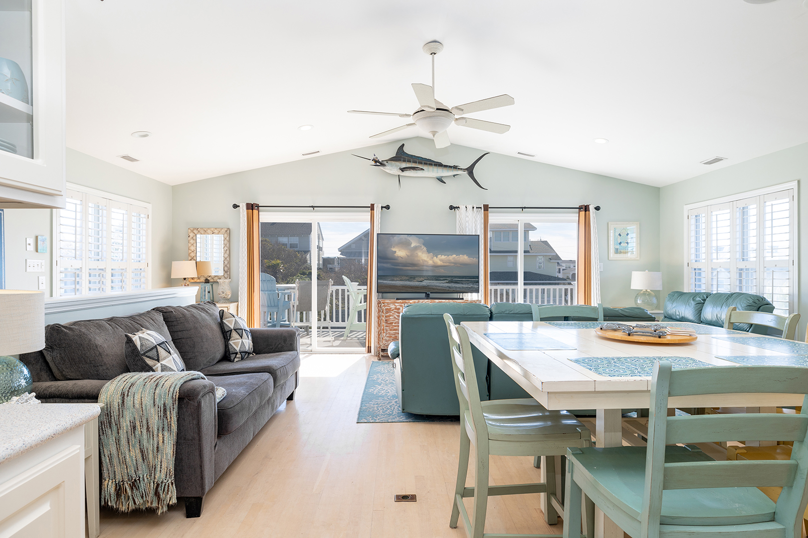 Prior guests have liked the reverse floor plan, where you enter the home in the foyer onto hardwood floors that feature an inlaid blue marlin fish. This leads to a bathroom in the hall with a shower and tub that is easily accessed by all 3 bedrooms with ceiling fans and storage. The first bedroom is beside the bathroom with twin beds and a wall-mounted flat-panel Smart TV. Then proceed down the hall to the 2nd bedroom with a queen bed, an armoire with a flat panel Smart TV, and access to the covered deck. At the end of the hall is a large primary suite with a king bed, ensuite bathroom with shower, wall-mounted flat panel Smart TV, and access to the covered deck (seating) with a staircase leading to the backyard.