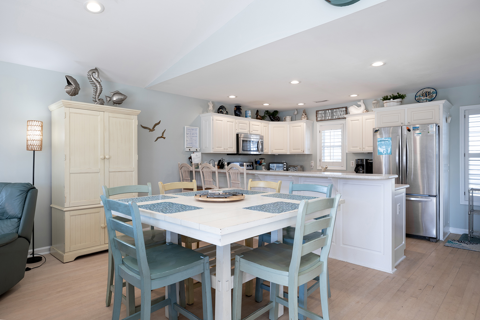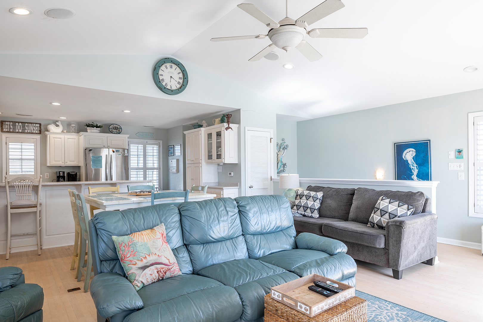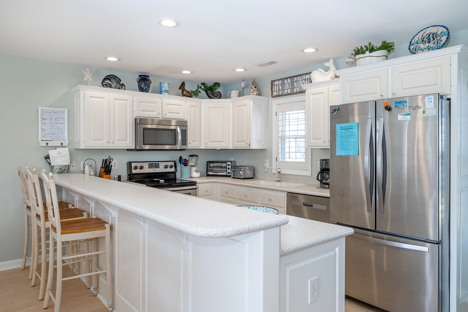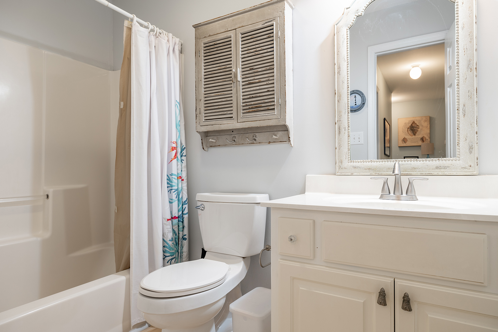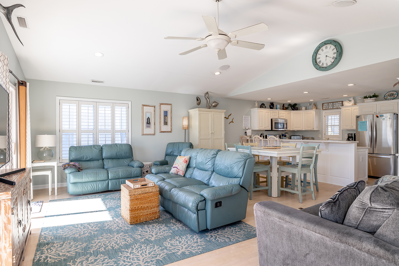 Prior guests have liked the reverse floor plan, where you enter the home in the foyer onto hardwood floors that feature an inlaid blue marlin fish. This leads to a bathroom in the hall with a shower and tub that is easily accessed by all 3 bedrooms with ceiling fans and storage. The first bedroom is beside the bathroom with twin beds and a wall-mounted flat-panel Smart TV. Then proceed down the hall to the 2nd bedroom with a queen bed, an armoire with a flat panel Smart TV, and access to the covered deck. At the end of the hall is a large primary suite with a king bed, ensuite bathroom with shower, wall-mounted flat panel Smart TV, and access to the covered deck (seating) with a staircase leading to the backyard.